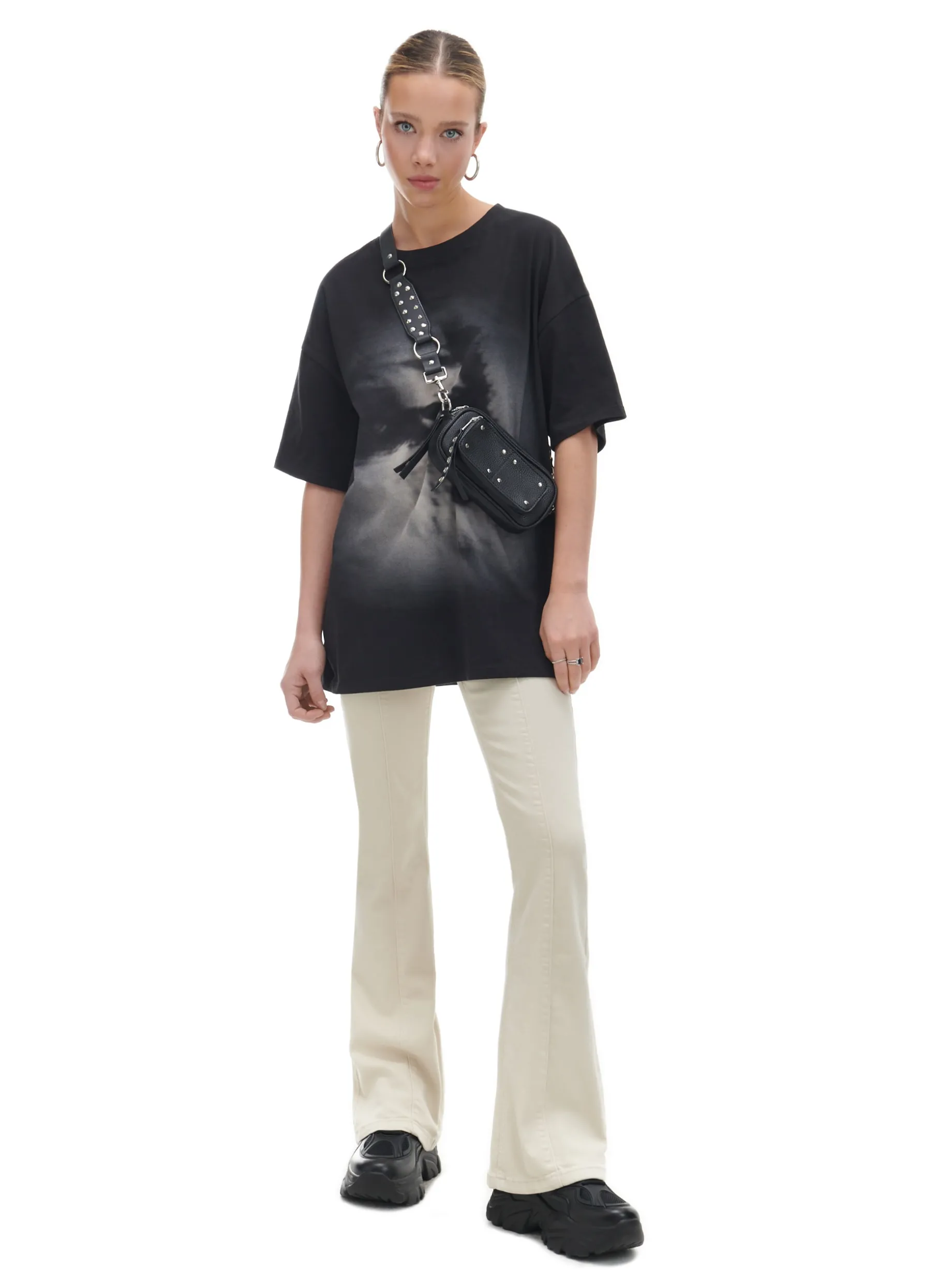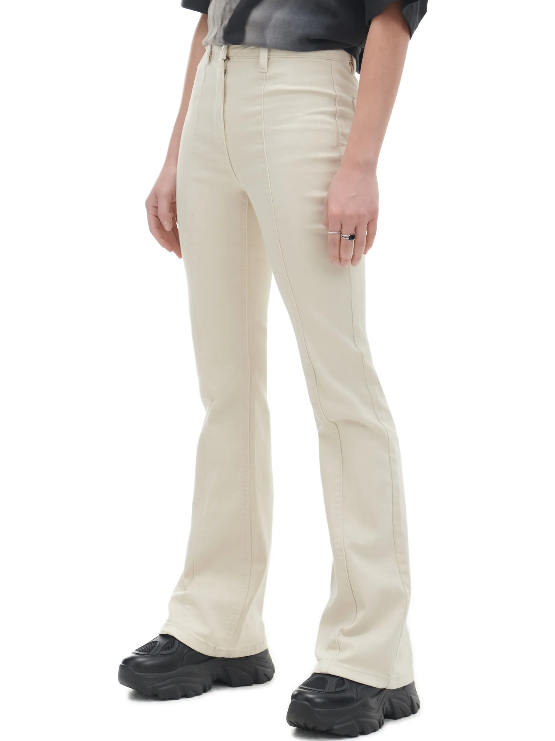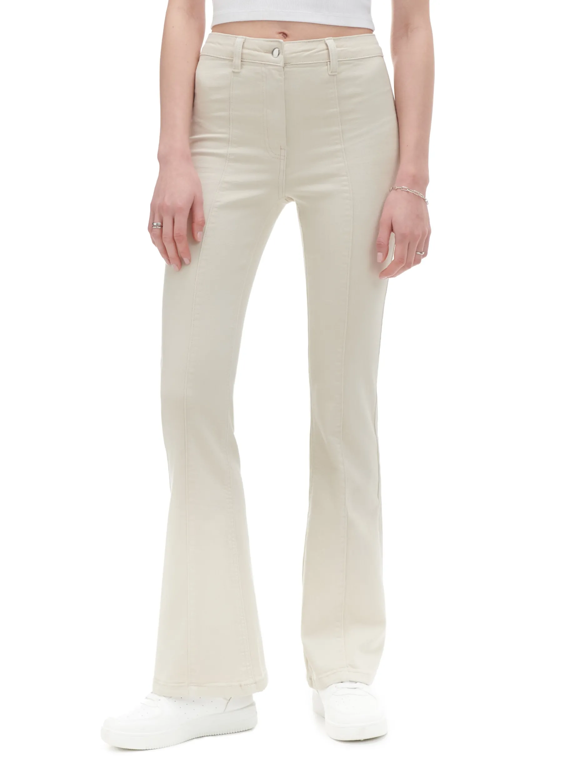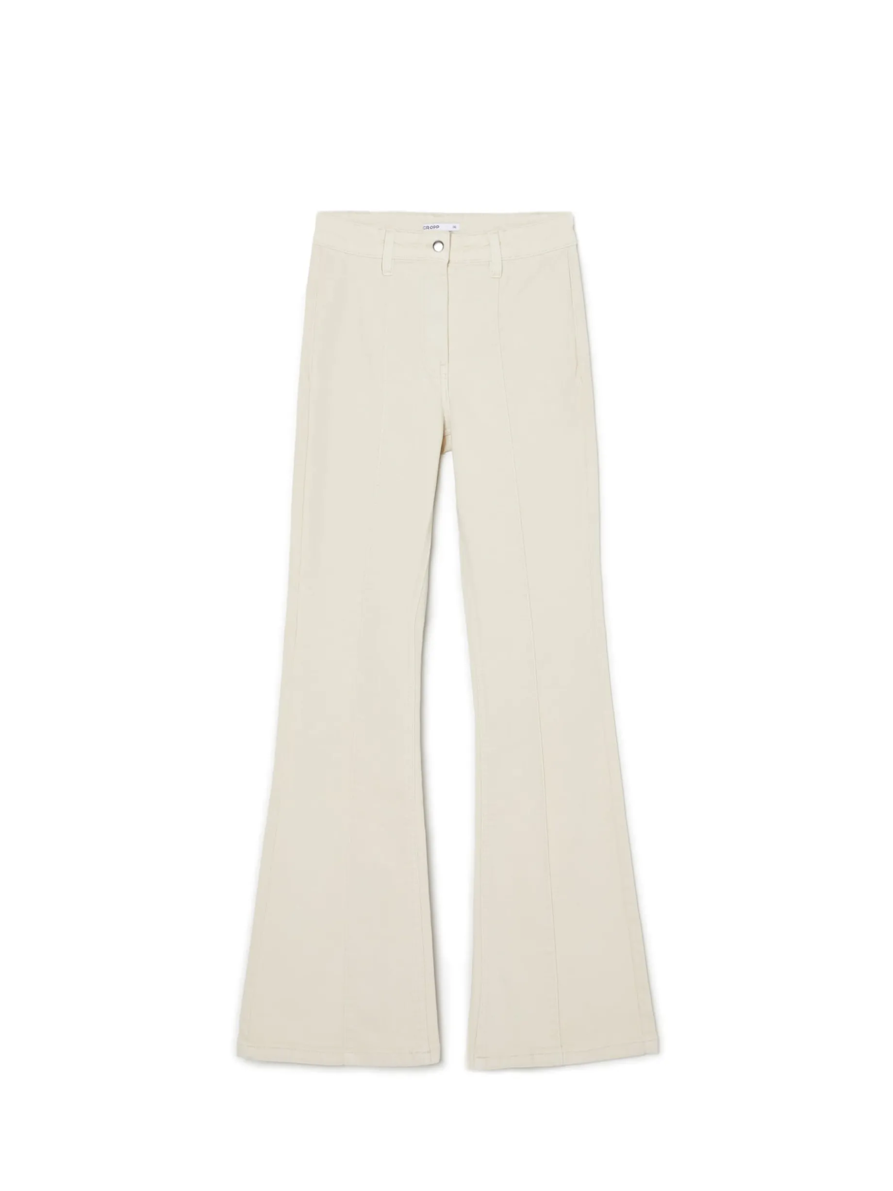 Kremowe damskie spodnie o kroju dzwonów, uszyte z bawełny z dodatkiem elastycznych włókien. regularny stan zapięcie na zamek i zatrzask dwie kieszenie z tyłu nogawka rozszerzająca od kolana w dół szlufki na pasek ozdobny szew z przodu Wzrost modelki: 177 cm Wzrost modelki: 170 cm