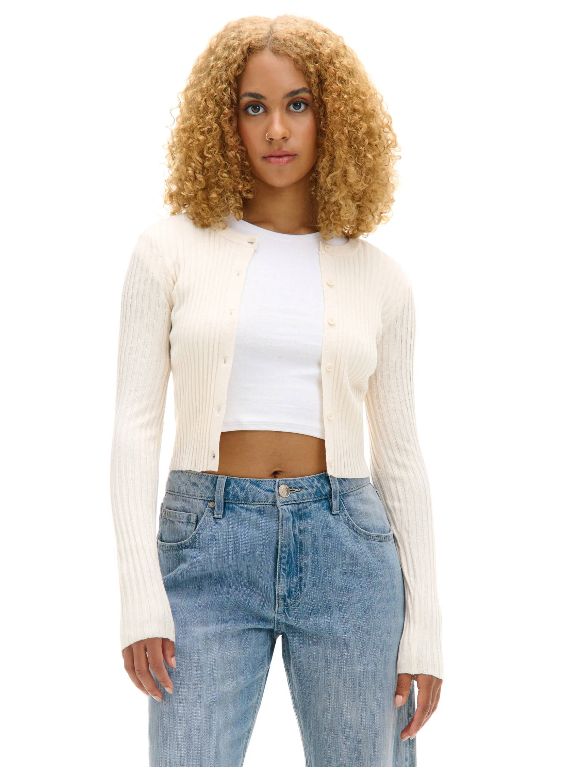 Krótki sweter damski typu kardigan uszyty z mieszanki dzianin. Wiskoza nadaje temu casualowi lekkości, a prążkowanie na całej powierzchni odpowiedniego stylu. Ten retro item warto mieć w szafie na wszelki wypadek. uszyty z dzianiny o wysokiej zawartości wiskozy prążkowany materiał krótki krój zapięcie na guziki na całej długości okrągły dekolt z lamówką długie, dopasowane rękawy