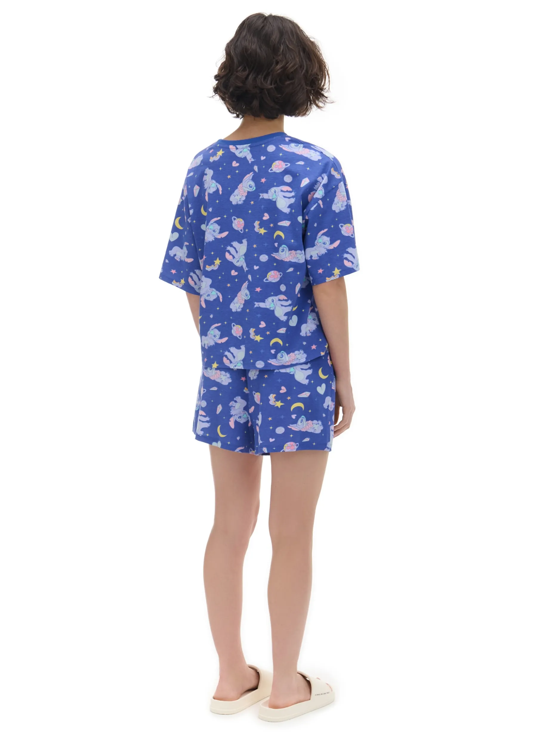 Lekka damska piżama, uszyta z bawełnianej dzianiny. luźna koszulka z krótkim rękawem szorty z gumką w pasie na całości nadruk z motywem Stitcha ©Disney