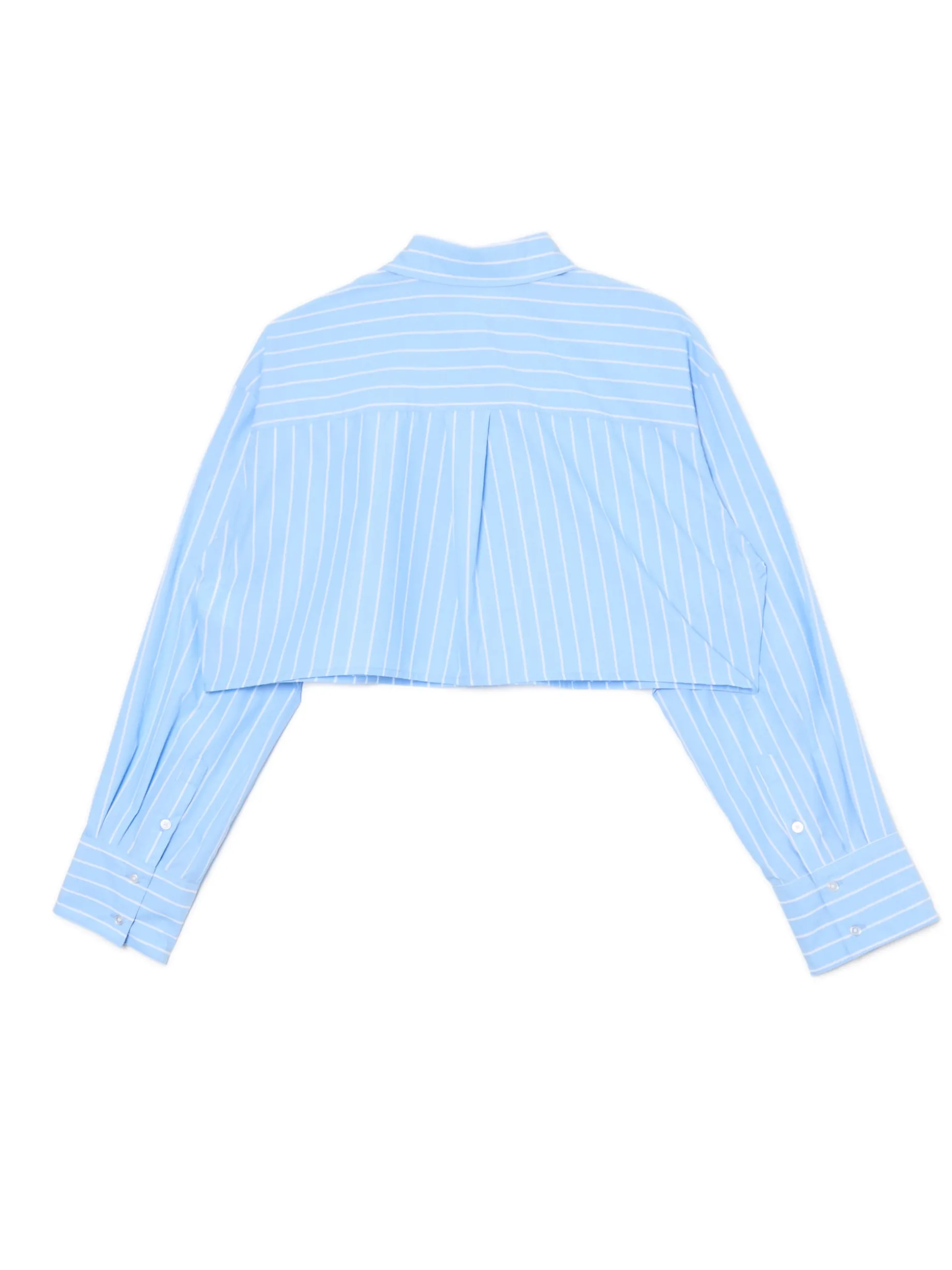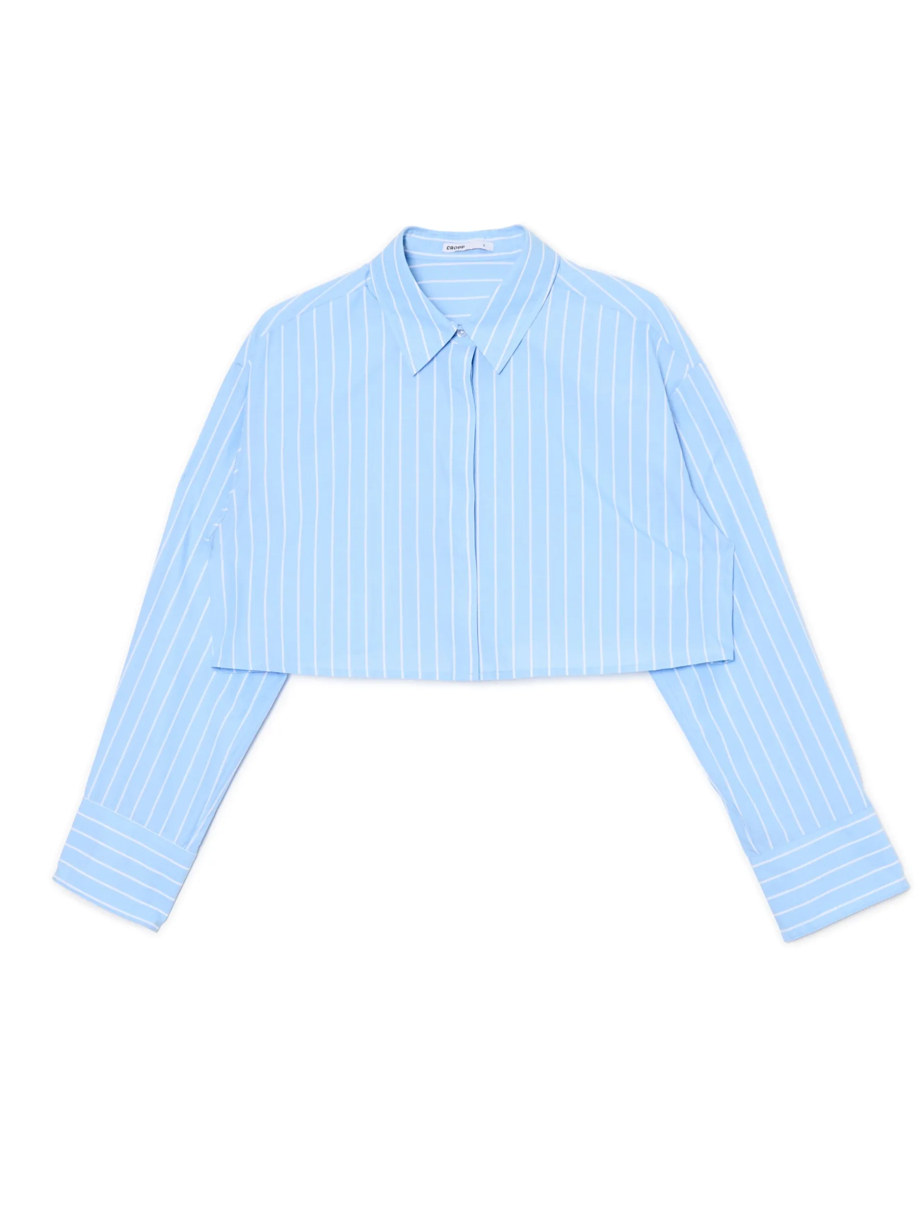 Damska koszula o krótszym kroju, uszyta z mieszanki dzianin z bawełną. Wzór w szerokie paski i oryginalny fason sprawiają, że ten item idealnie pasuje do casualowych stylizacji. dzianinowy materiał z bawełną krótszy krój jednorzędowe zapięcie na guziki klasyczny kołnierzyk długie rękawy zakończone mankietem z guzikami wzór w paski all over