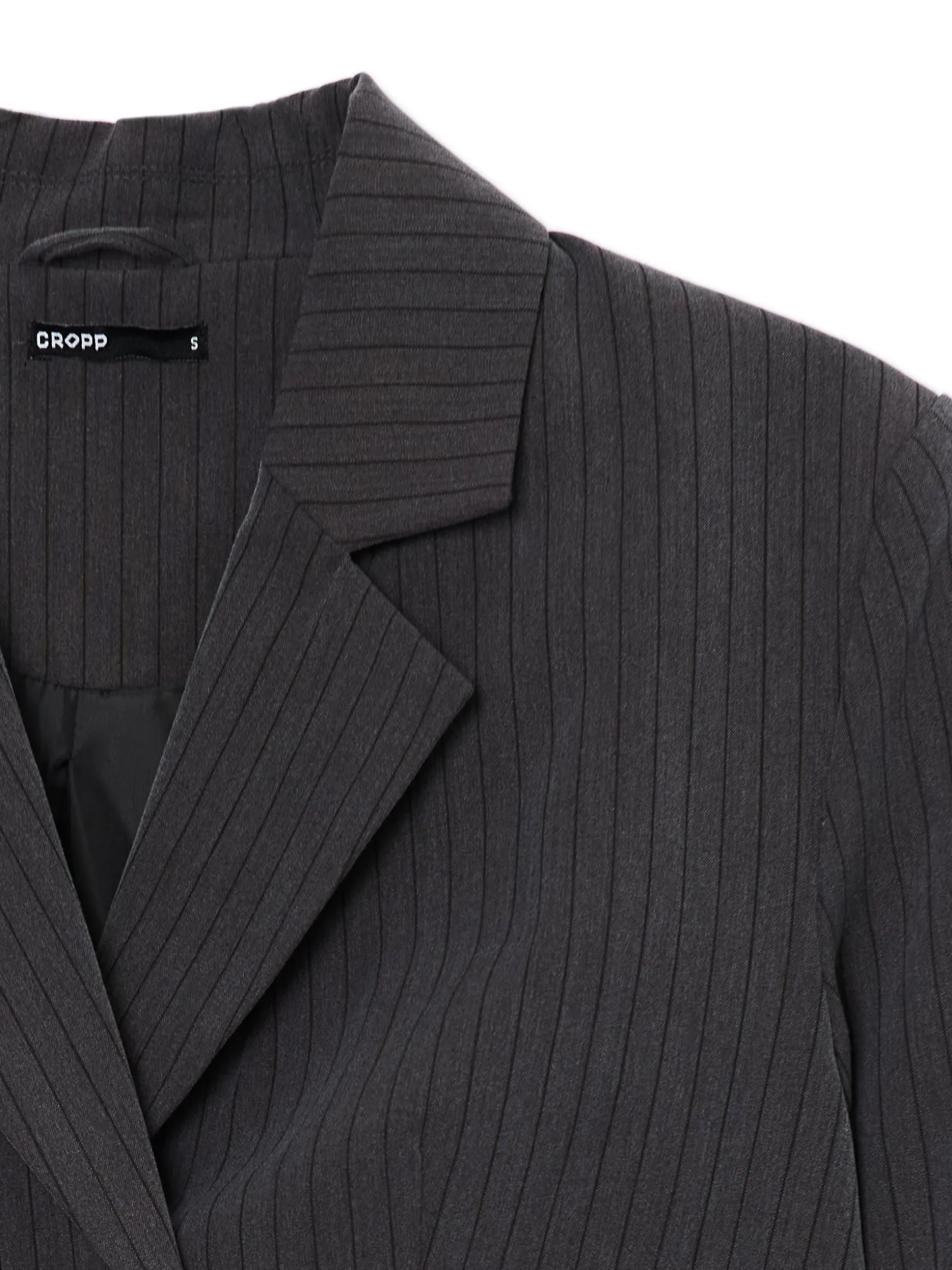 Damski żakiet o krótszym kroju, uszyty z lekkiej, trwałej tkaniny. Idealny jako dodatek do eleganckich i casualowych stylizacji. lekki materiał zapięcie na guziki kołnierz z otwartymi klapami długie rękawy z rozcięciami wzór w paski na całości