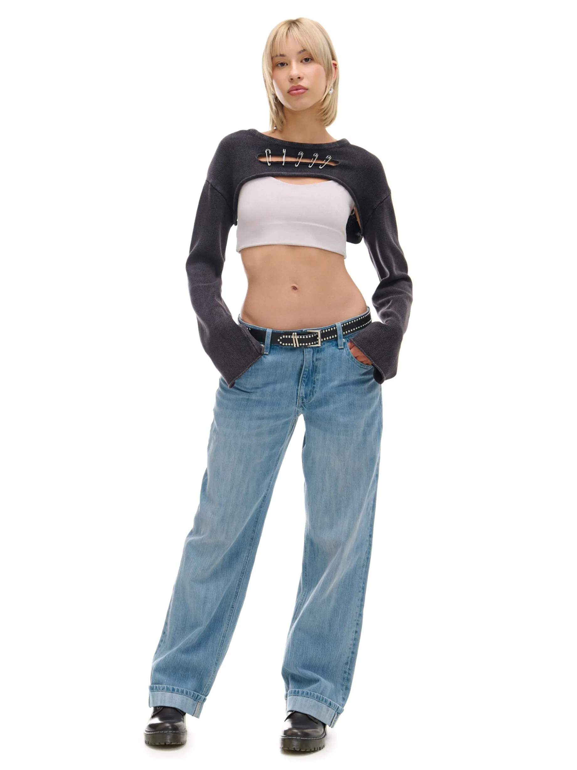 Damski sweter o krótkim kroju, uszyty z bawełnianej dzianiny. Na przodzie ozdobne wycięcie i duże, dekoracyjne agrafki. 100% bawełny krótki krój długie, swobodne rękawy półokrągły dekolt dekoracyjne wykończenie brzegów metalowe detale Wzrost modelki: 177 cm