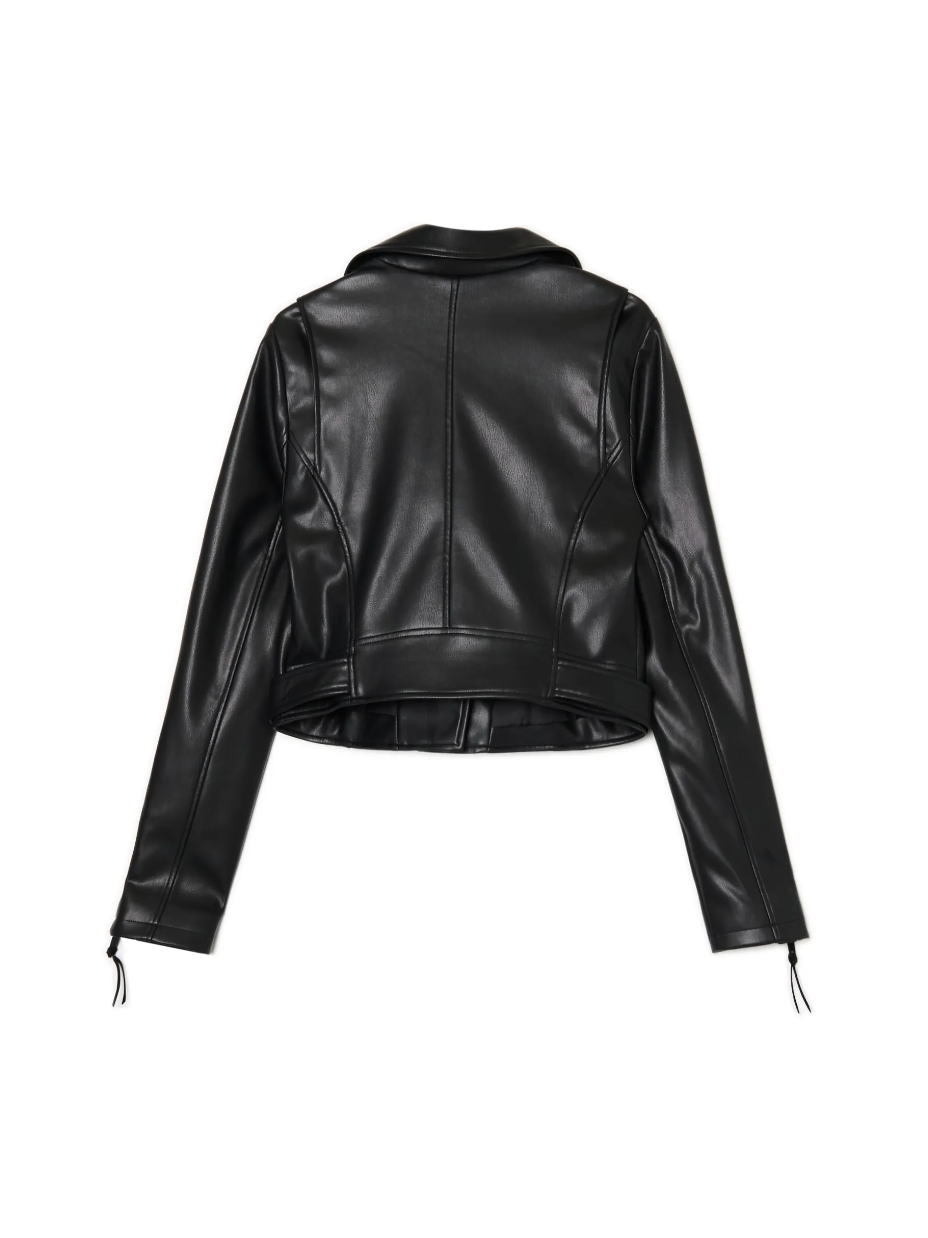 Damska kurtka typu biker, wykonana ze sztucznej skóry. Ten czarny model będzie idealnym dodatkiem do Twoich stylizacji. zapinana na zamek na całej długości dół wykończony paskiem z metalową sprzączką długie rękawy z suwakiem przy mankiecie kołnierz z otwartymi klapami góra zapinana na zatrzaski dwie kieszenie z zamkami po bokach ozdobne pullery przy rękawach