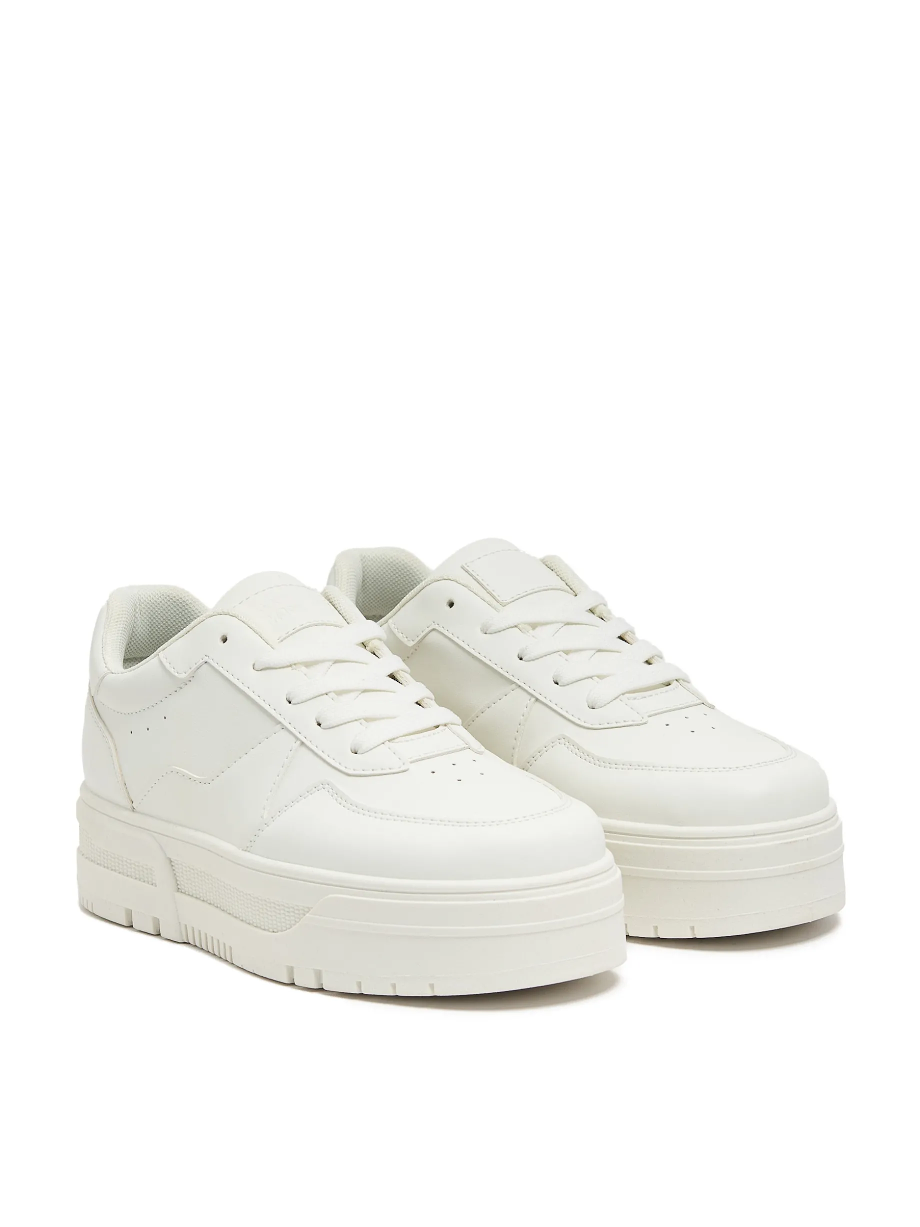 Damskie buty przejściowe typu sneakersy, uszyte z mieszanych materiałów. Solidna podeszwa i jednolity kolor zwrócą na siebie uwagę w tłumie! wysokie sneakersy z elastyczną cholewką wykonane z łączonych materiałów masywna podeszwa białe, płaskie sznurowadła