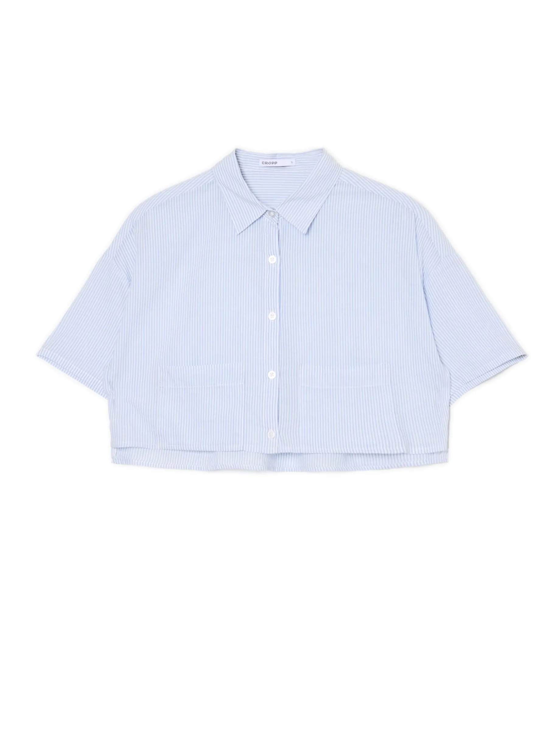 Damska koszula w kolorze niebieskim, uszyta w 100% z lekkiej bawełnianej tkaniny ze wzorem w paski. Możesz sparować ją z jeansami z wysokim stanem albo spódnicą mini – Twój wybór! obszerny, regularny krój zapięcie na guziki kołnierzyk pod szyją krótkie rękawy dwie kieszenie na piersiach wzór w paski na całości Wzrost modelki: 172 cm