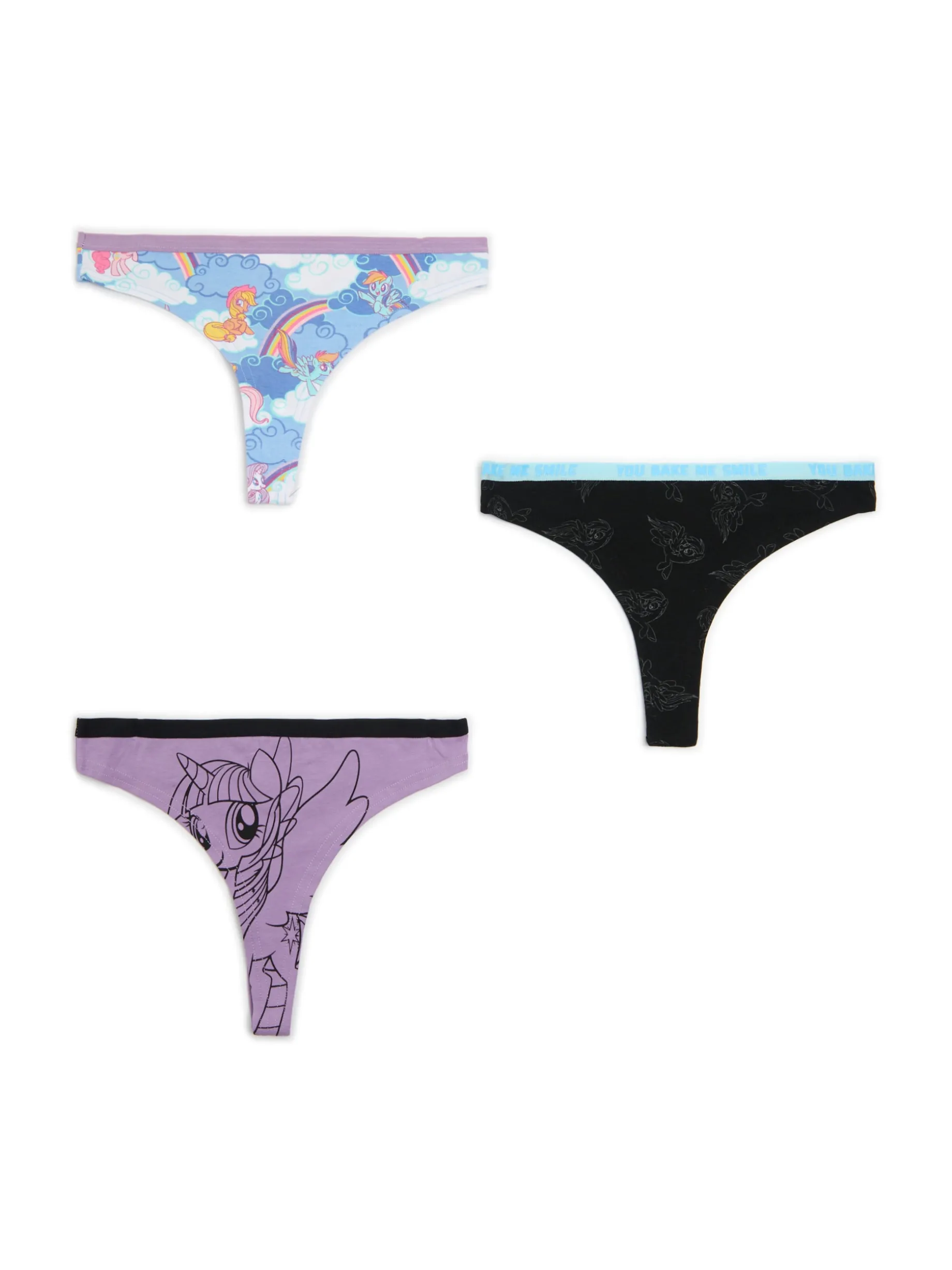 Spróbuj nie odlecieć! Mamy zestaw 3 par damskich majek typu stringi uszytych z bawełny z dodatkiem elastycznych włókien. Na każdej parze nadruk z motywem My Little Pony.