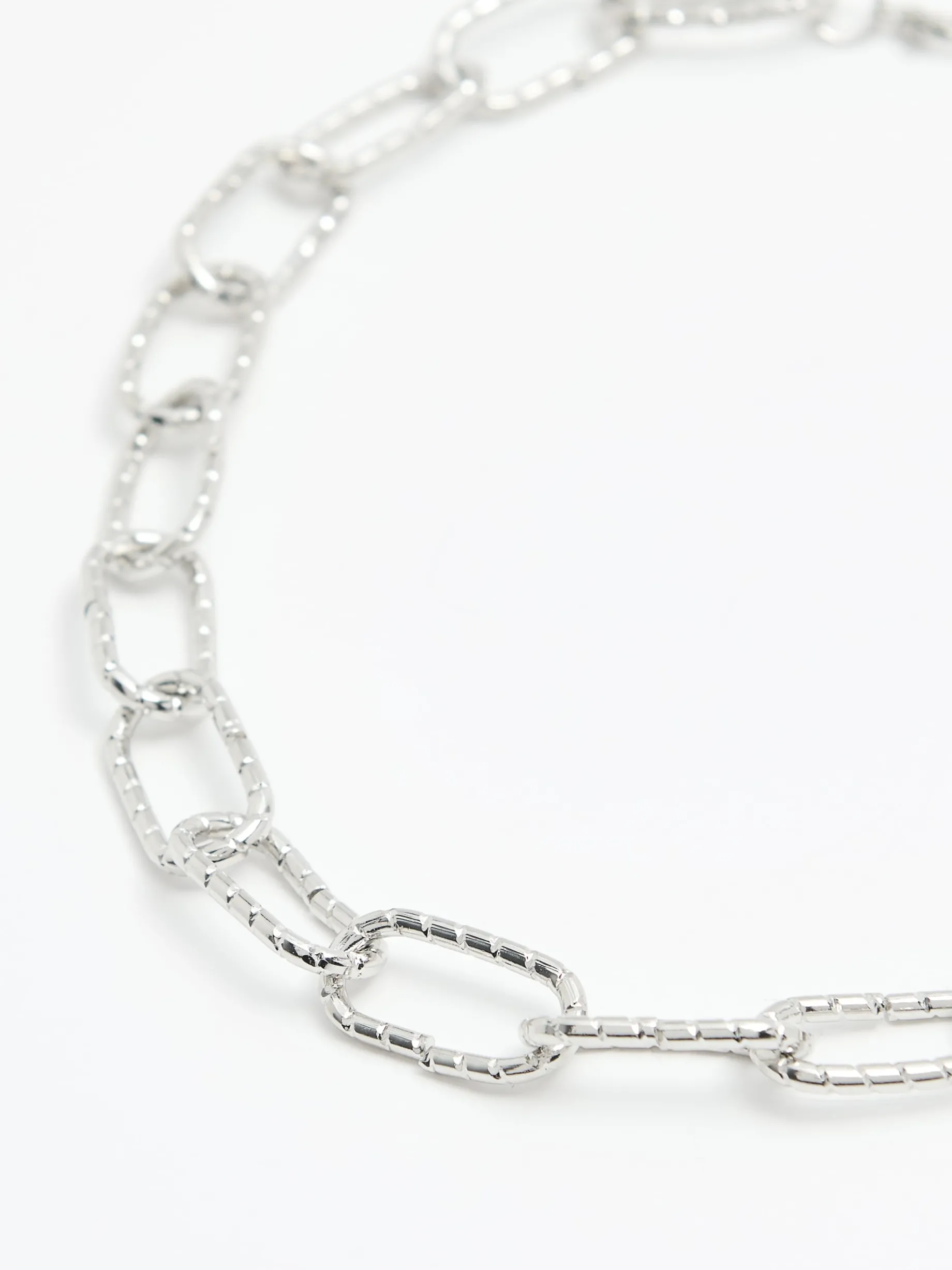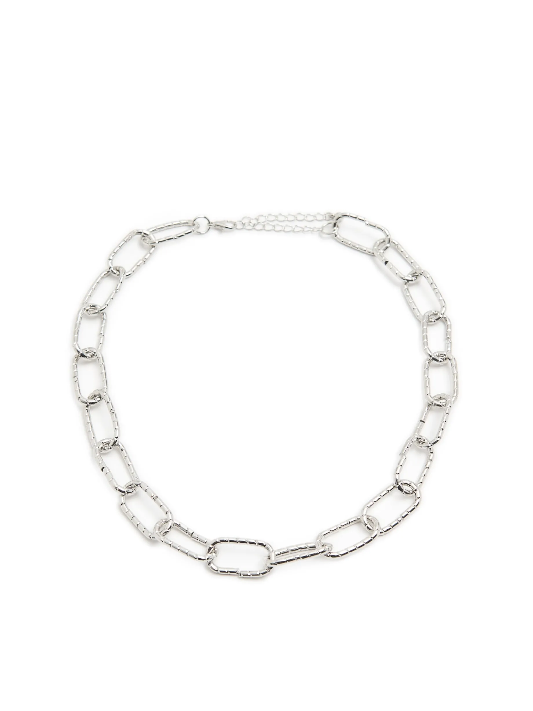 Damski naszyjnik typu łańcuch, wykonany z tworzywa w kolorze srebrnym. Z tyłu wygodne zapięcie na karabińczyk.