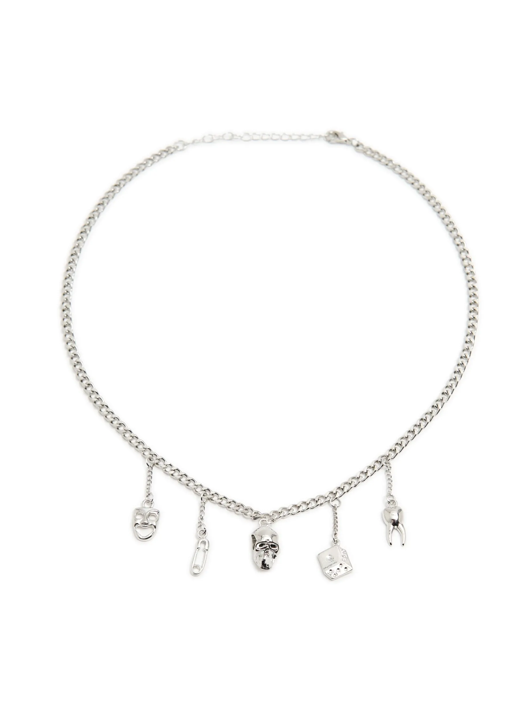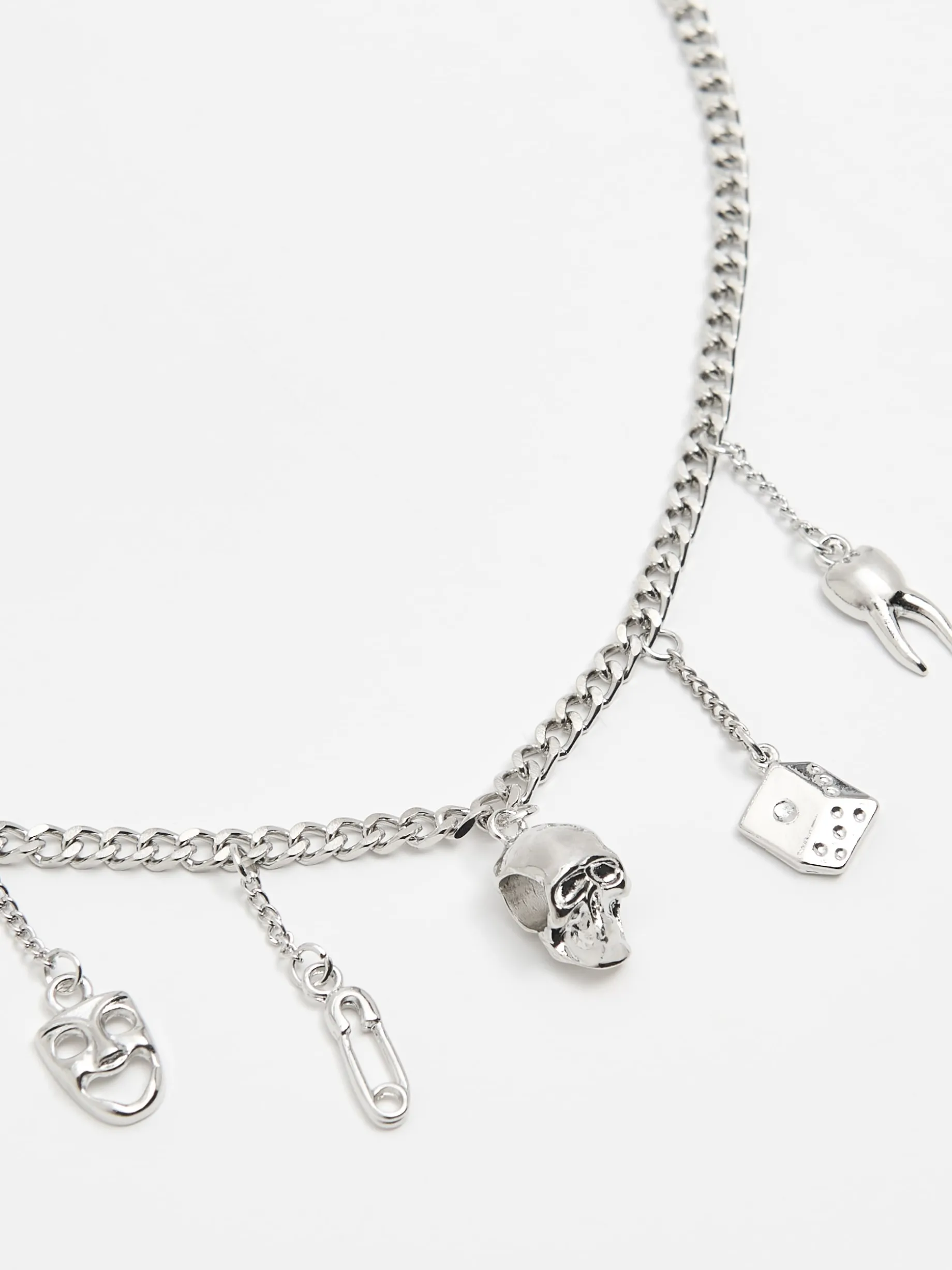 Męski naszyjnik wykonany z tworzywa z dodatkiem mosiądzu. Wyposażony w wygodne zapięcie na karabińczyk i 5 oryginalnych zawieszek – ząb, czaszkę, maskę, kostkę do gry i spinacz.