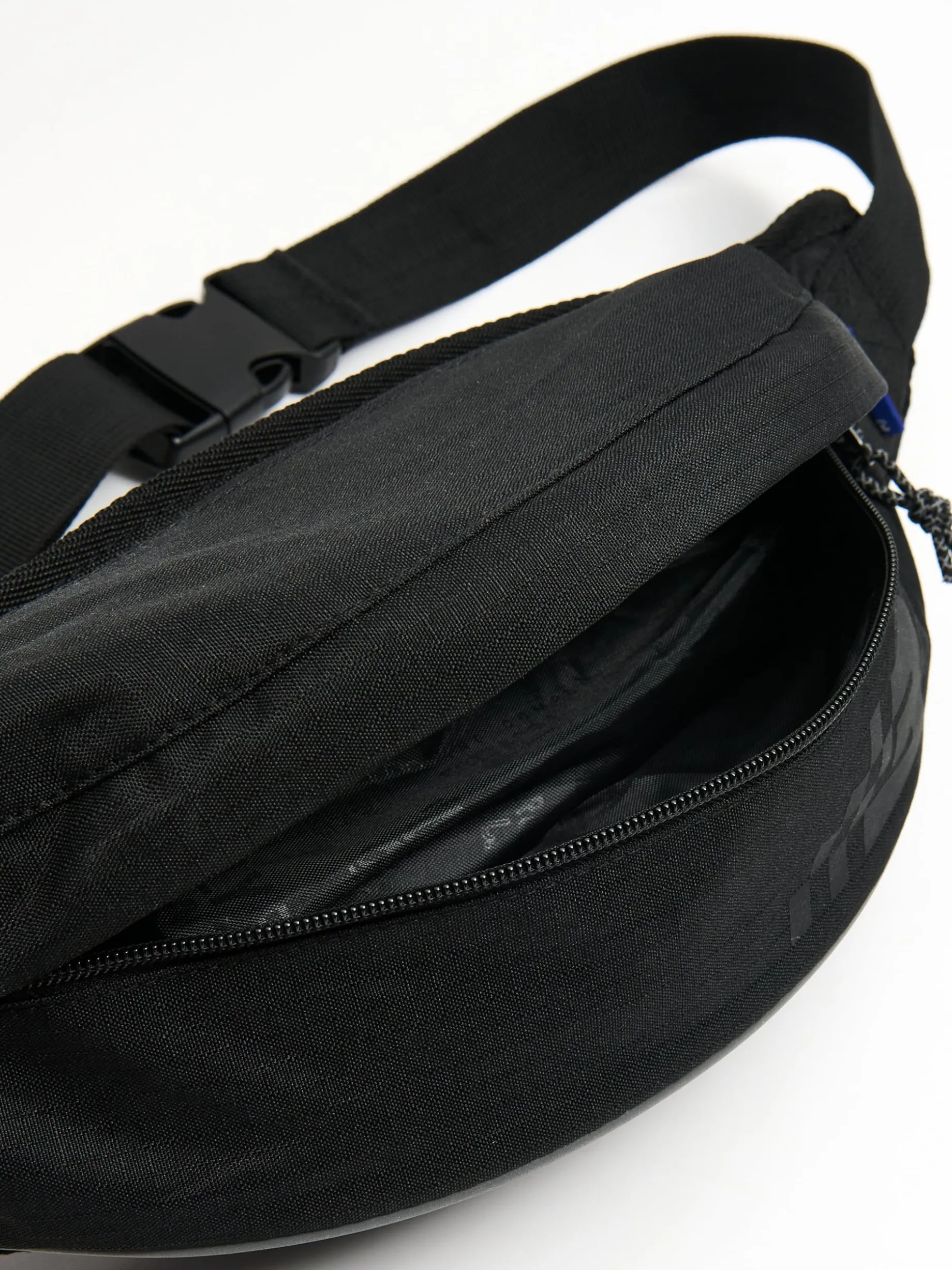 Męska czarna saszetka typu nerka uszyta z łączonych materiałów. Taki praktyczny i wygodny item będzie sztosowym dodatkiem podczas Baltic Games! wykonana z łączonych materiałów saszetka basic regulowany pasek, zapinany klamrą główna komora z zapięciem na zamek dodatkowa kieszeń z zapięciem na zamek wewnętrzna kieszeń z siateczki mesh z zapięciem na suwak dodatkowa regulacja za pomocą elastycznej szlufki wygodne i miękkie wykończenie przy biodrach nadruk z efektem reflective