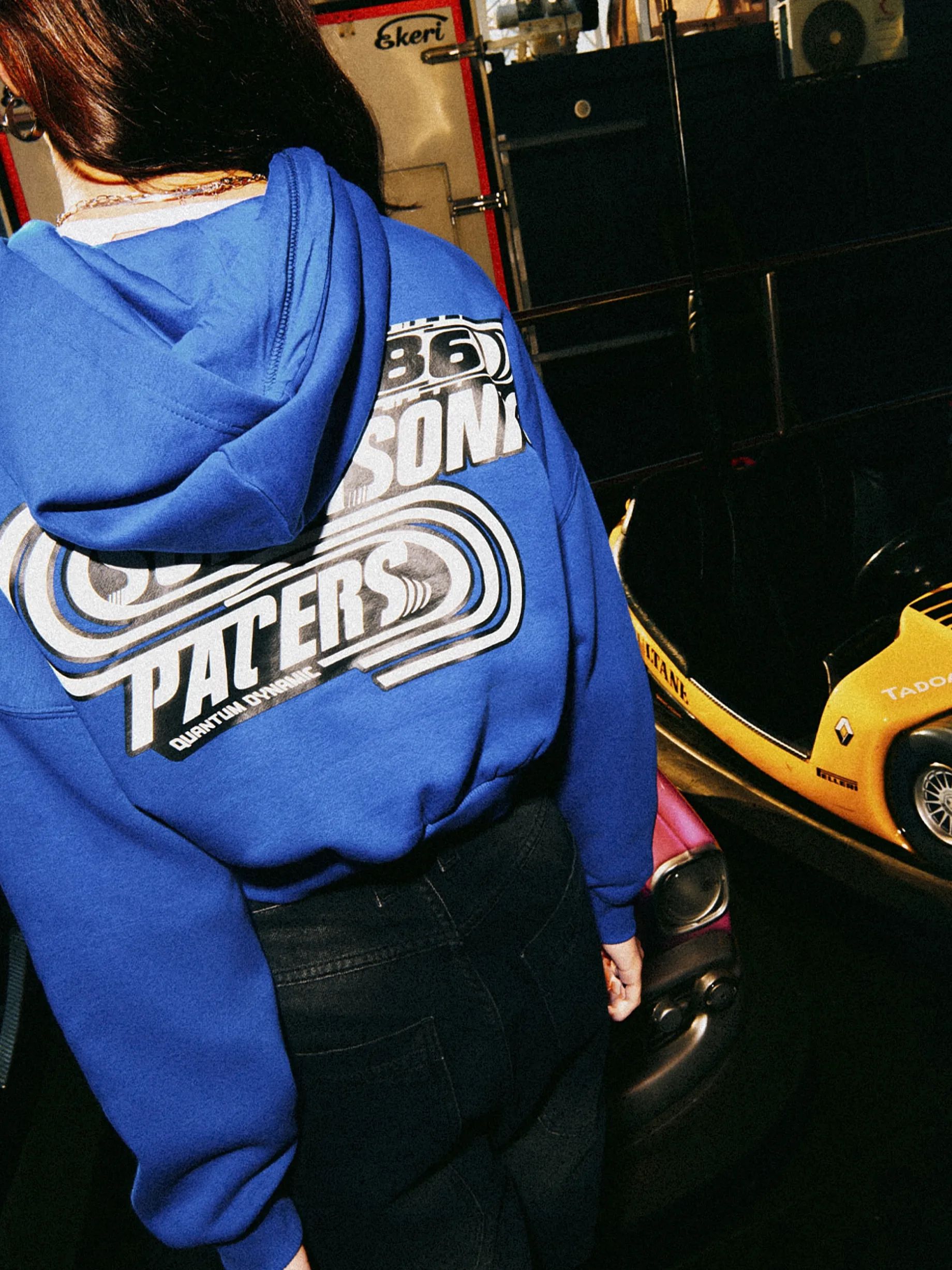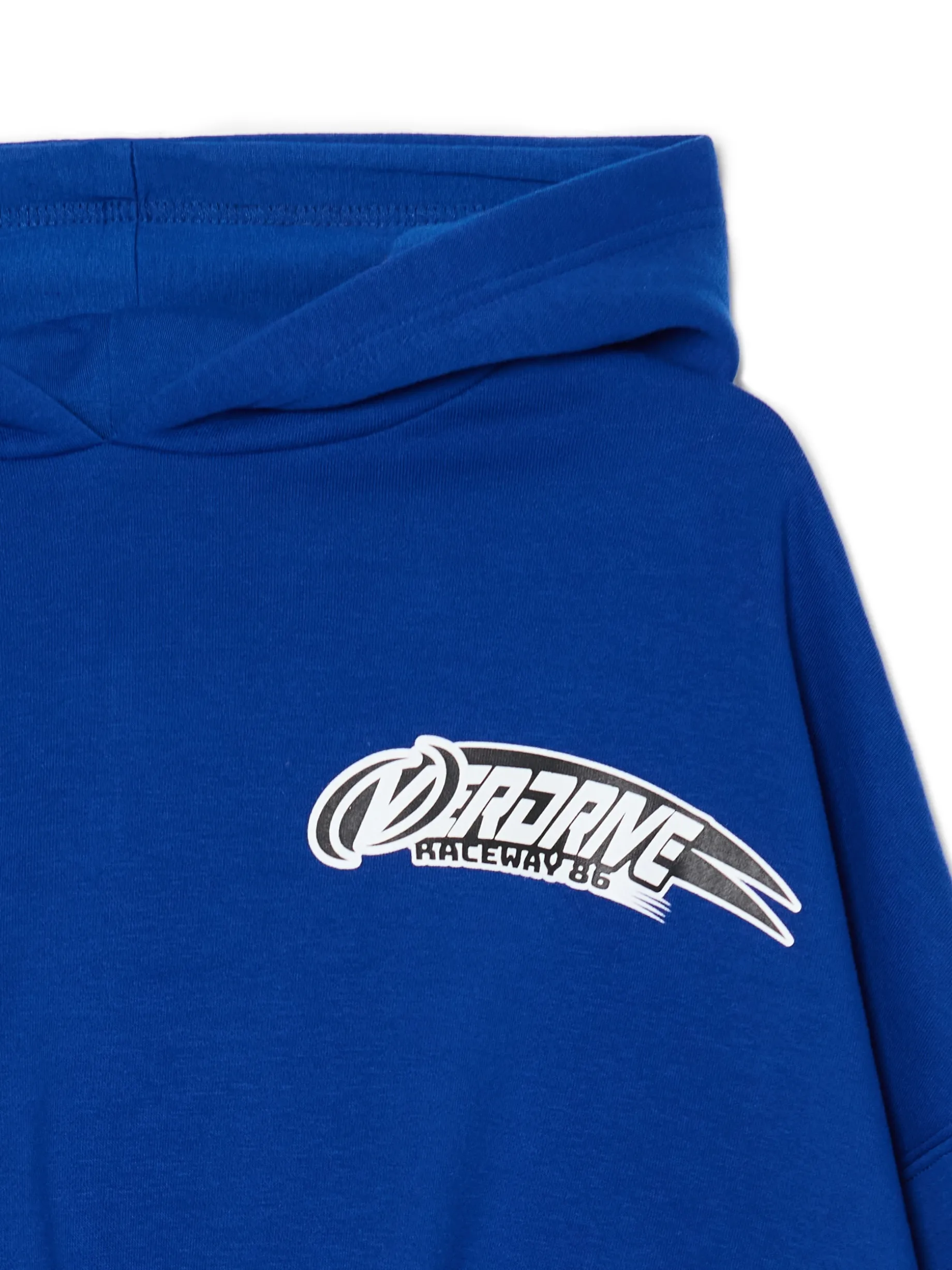 Damska bluza dresowa, uszyta z dzianiny zawierającej bawełnę. Let the Baltic Games begin! krótki i szeroki krój crop opuszczona linia ramion rękawy i dolny brzeg zakończone ściągaczem miękki kaptur z przodu i z tyłu nadruki w stylu skate Wzrost modelki: 172 cm