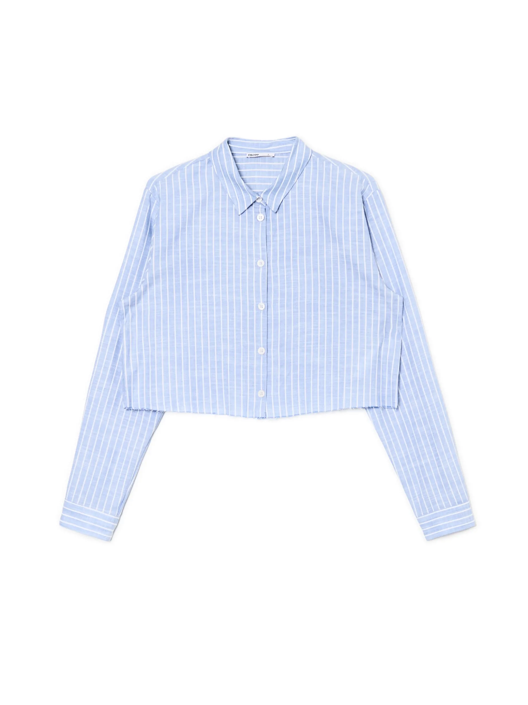 Oryginalna damska koszula w naturalnym faosnie, uszyta z bawełny w biało-niebieskie paski. 100% bawełny krótki krój długie, proste rękawy zapięcie na guziki surowe wykończenie brzegów tworzy zestaw z szortami z tego samego materiału Wzrost modelki: 172 cm