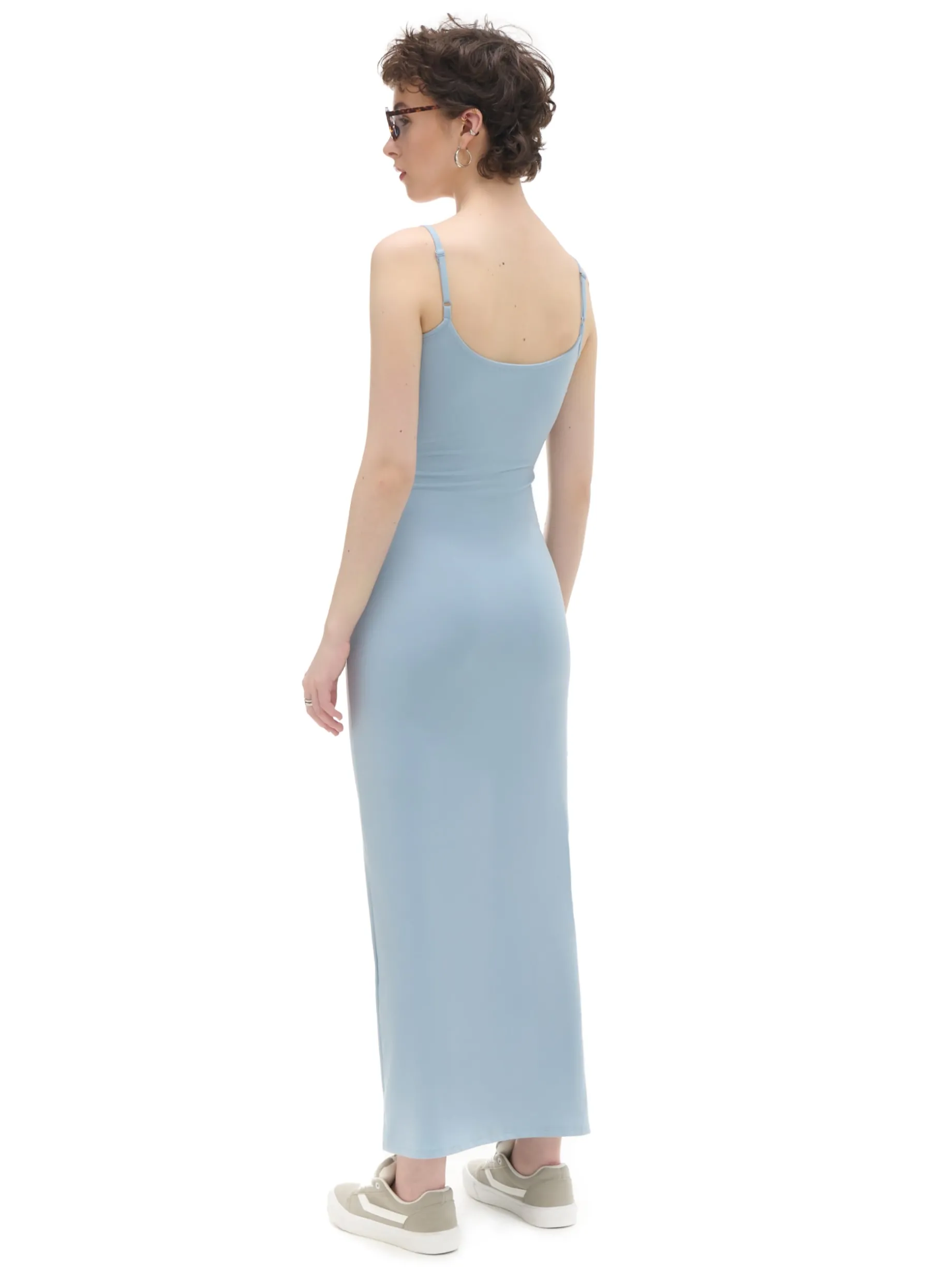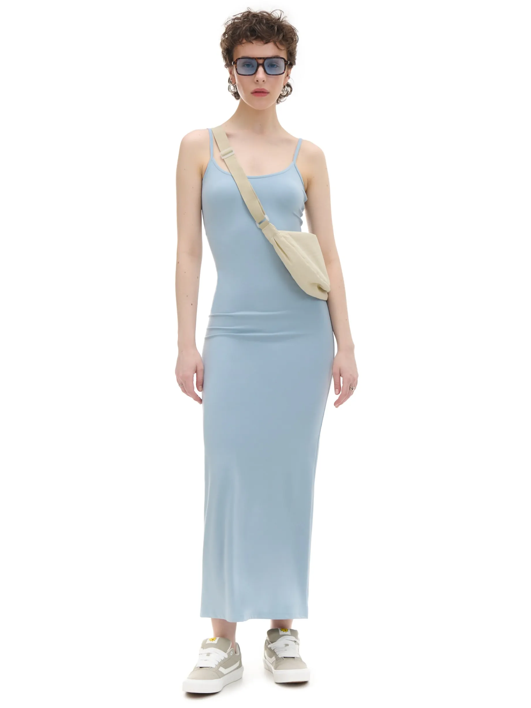 Długa sukienka, uszyta z jasnoniebieskiej dzianiny. dzianina z domieszką elastycznych włókien długość maxi dopasowany krój podkreślający sylwetkę okrągły dekolt wąskie ramiączka z regulacją długości Wzrost modelki: 176 cm