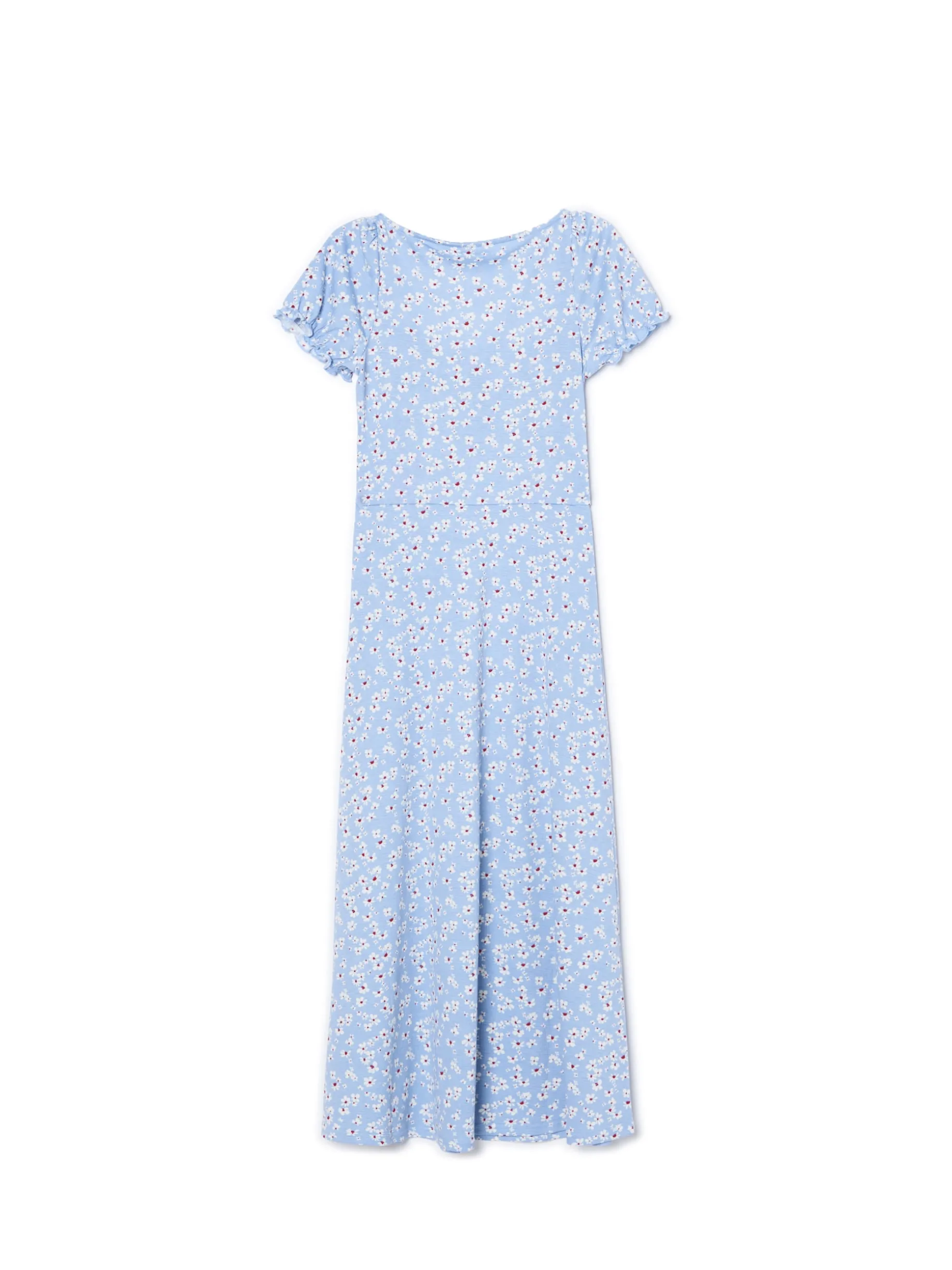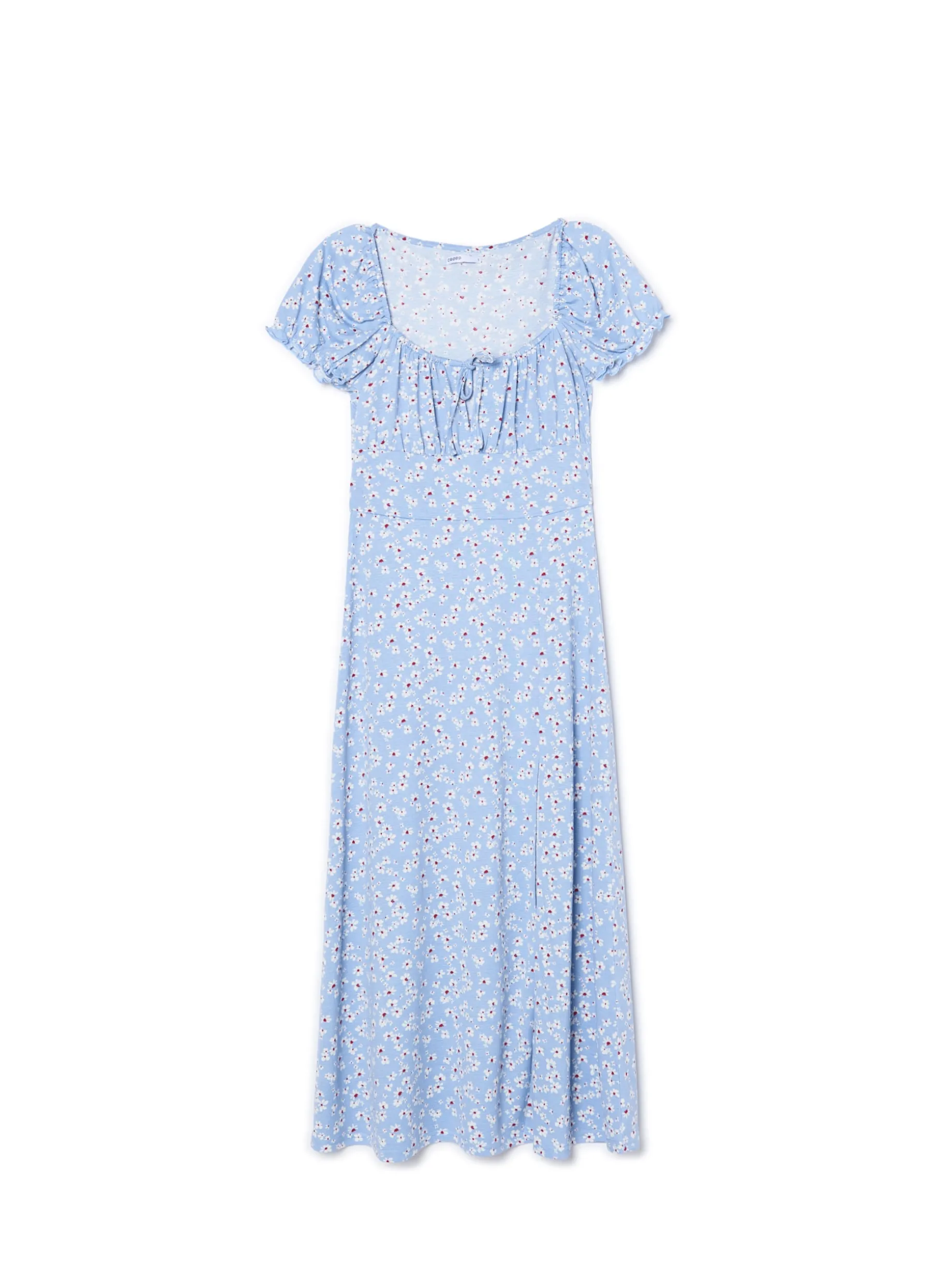 Lekka sukienka, uszyta z wzorzystej dzianiny, utrzymana w niebieskiej kolorystyce. Dostępne inne warianty kolorystyczne. długość midi fason typu empire – odcięcie tuż po biustem krótkie, bufiaste rękawy dekolt z rozcięciem i wiązaniem lekko rozkloszowana spódnica z rozcięciem nadruk w stokrotki na całej powierzchni