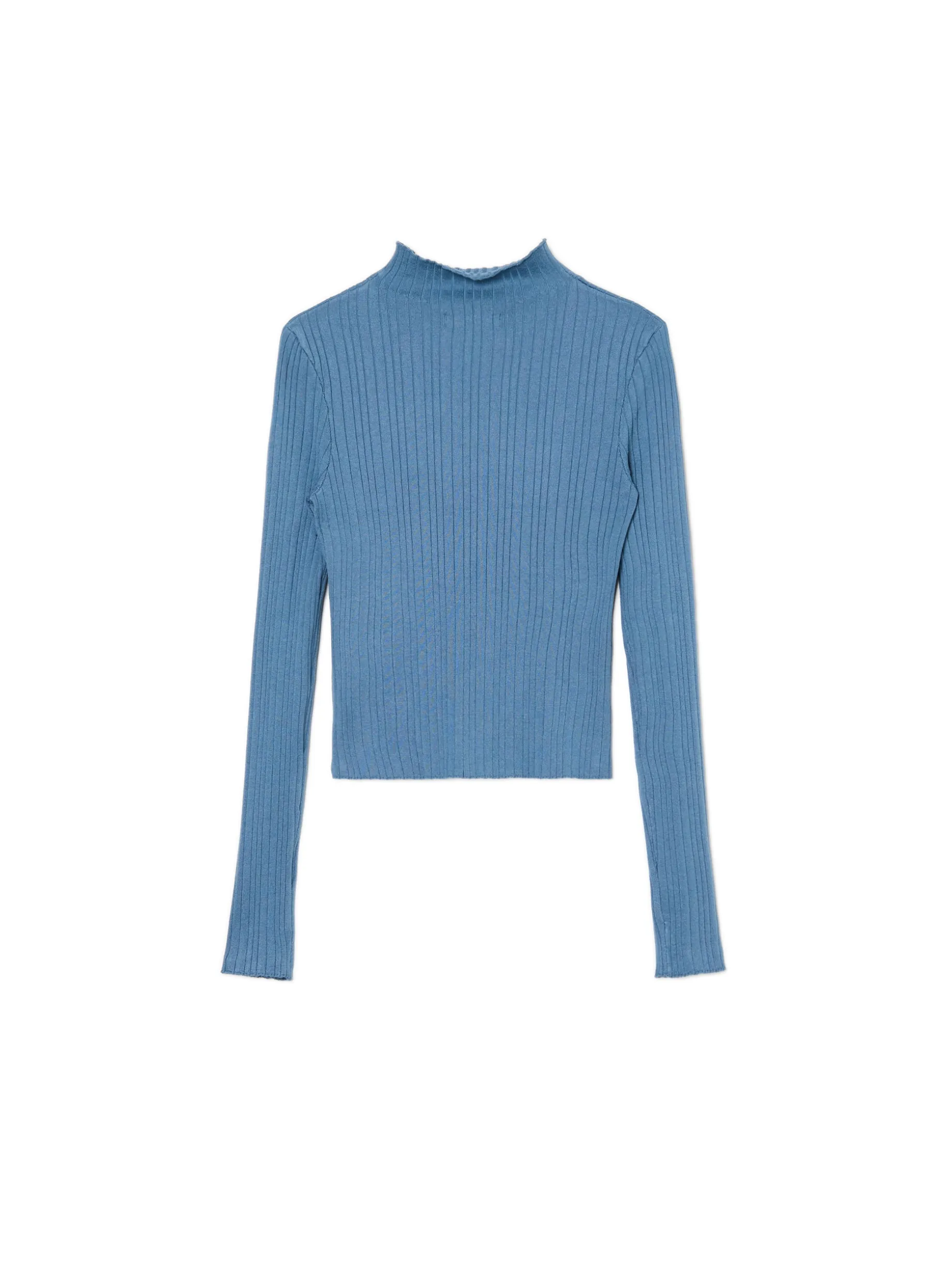 Sweter damski uszyty z mieszanki dzianin z wiskozą. Okryje Cię w chłodne wieczory! uszyty z prążkowanej dzianiny o wysokiej zawartości wiskozy dopasowany krój podkreślający sylwetkę zabudowany dekolt z półgolfem długie, dopasowane rękawy