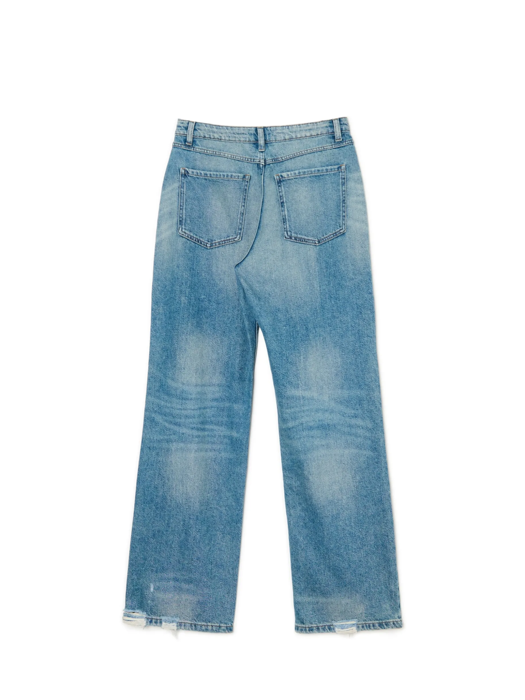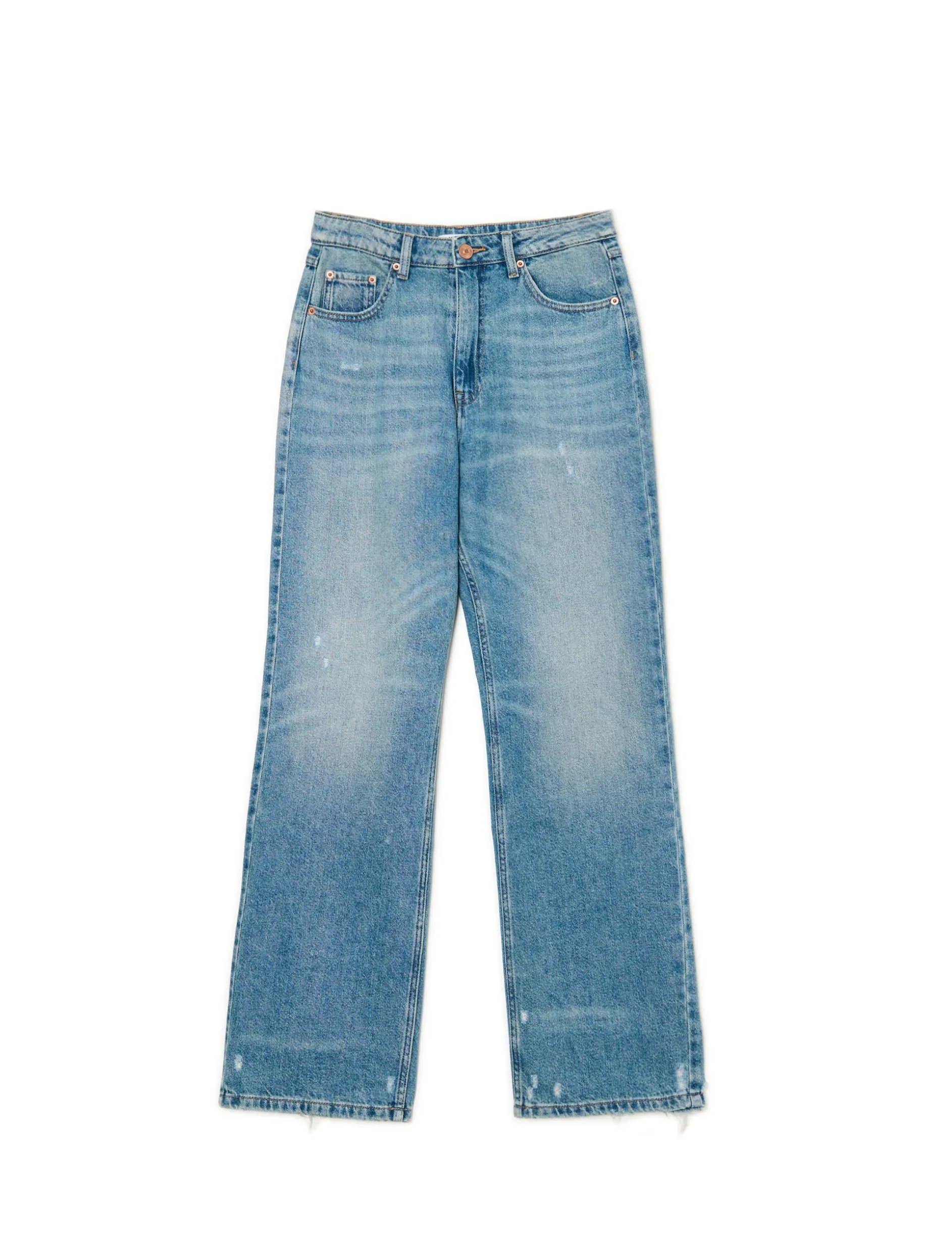 Damskie jeansy o swobodnym kroju baggy. Świetna baza wielu miejskich stylówek – sprawdź je! długa, luźna nogawka regularny stan, zapięcie na guzik i zamek cztery kieszenie szlufki na pasek efekt sprania all over lekki efekt sprania Wzrost modelki: 172 cm