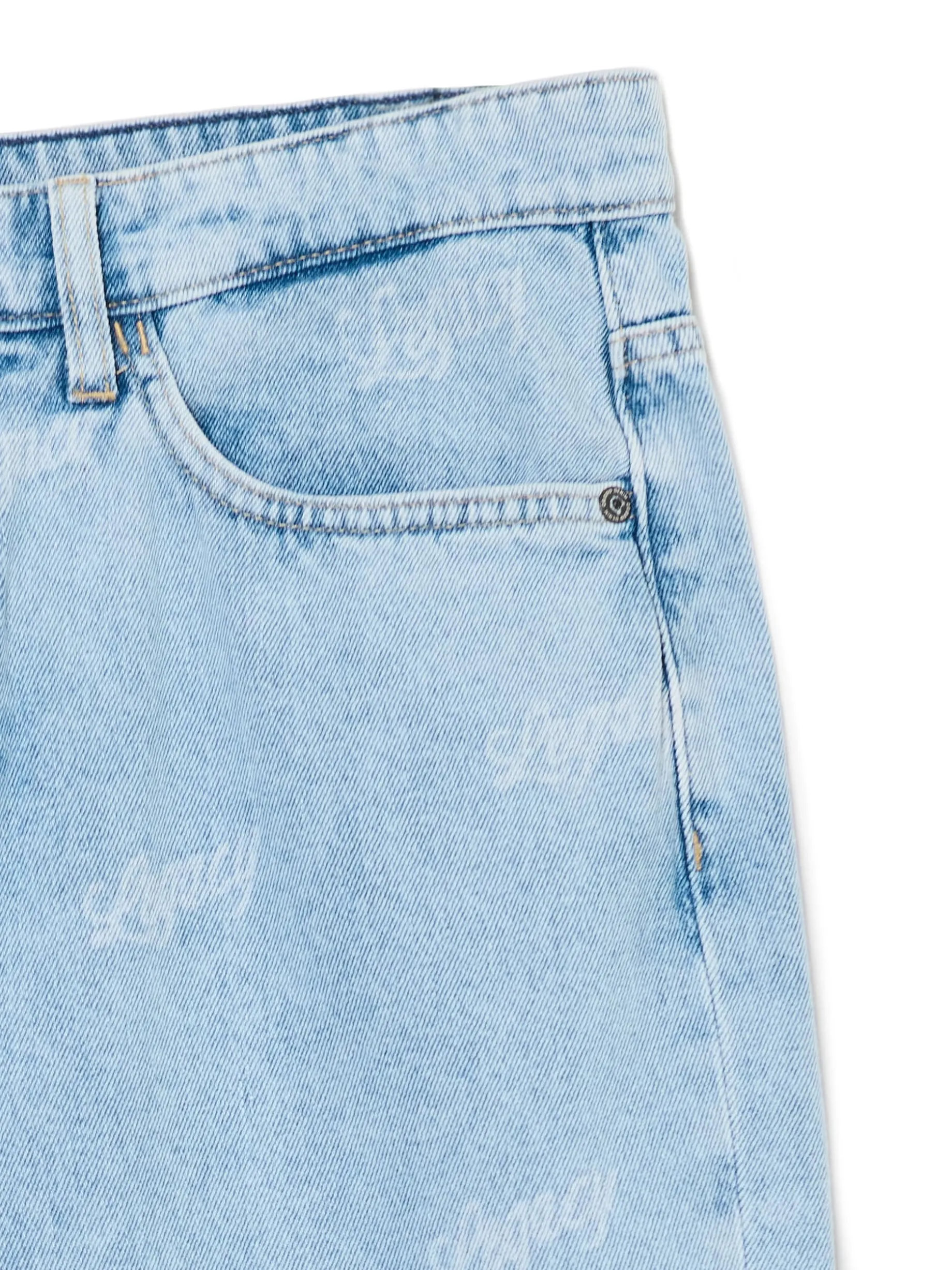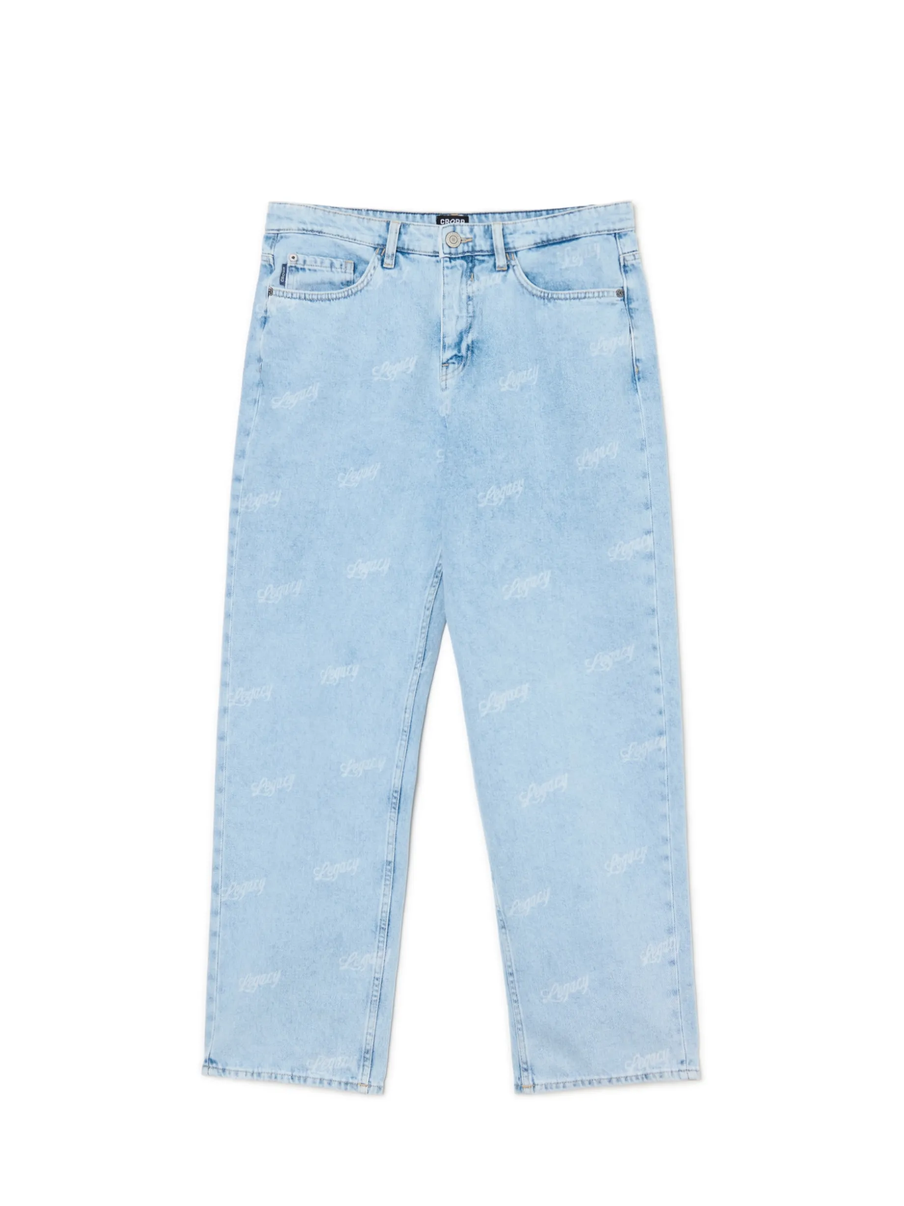 Męskie spodnie jeansowe o szerokiej nogawce, uszyte z wytrzymałego denimu w kolorze niebieskim. regularny stan zapięcie na guzik i zamek cztery kieszenie powtarzający się tekstowy nadruk all over szlufki na pasek Model prezentuje produkt w rozmiarze M/L. Wzrost modela: 185 cm