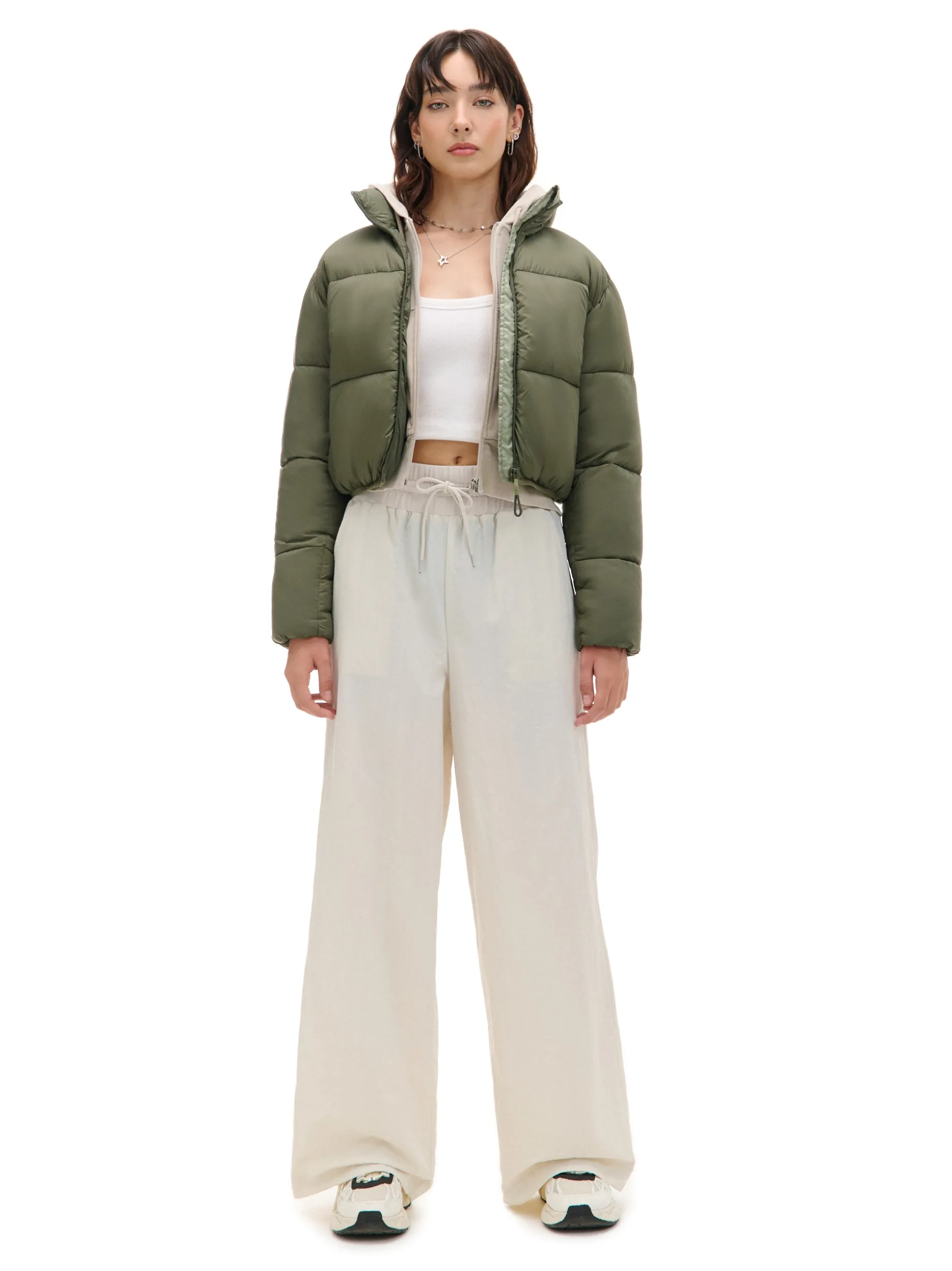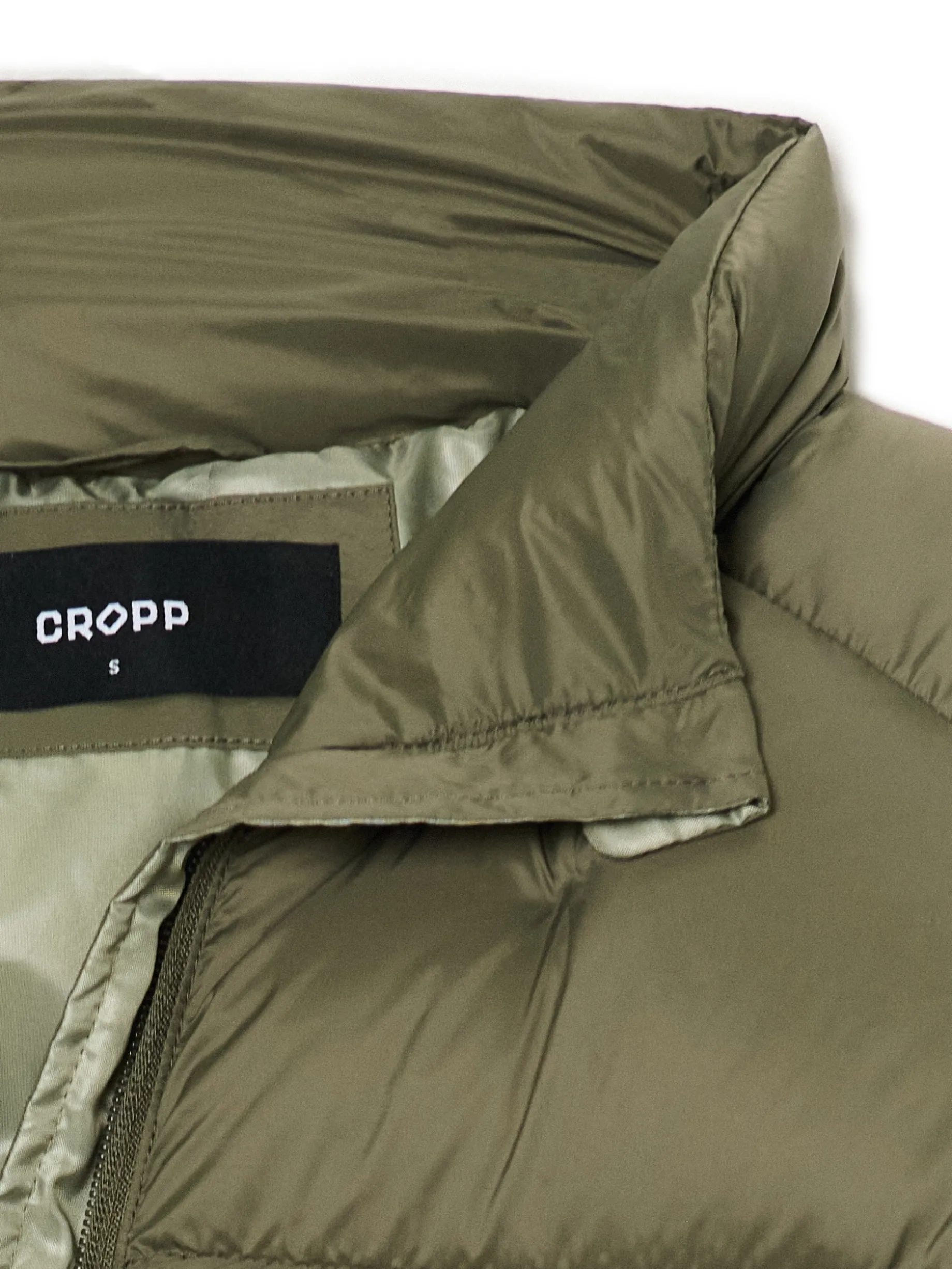 Pikowana damska kurtka typu puffer, uszyta z tkaniny w kolorze oliwkowym. Wewnątrz ocieplenie z recyklingowanego puchu syntetycznego. Ten outerwear ogrzeje Cię w sezonie zimowym! basicowa kurtka typu puffer zapinana na zamek na całej długości wewnątrz wykończenie na podszewce ocieplenie wysoki kołnierz szerokie rękawy zakończone gumką kieszenie boczne z zamkami zapięcia z wygodnymi pullerami