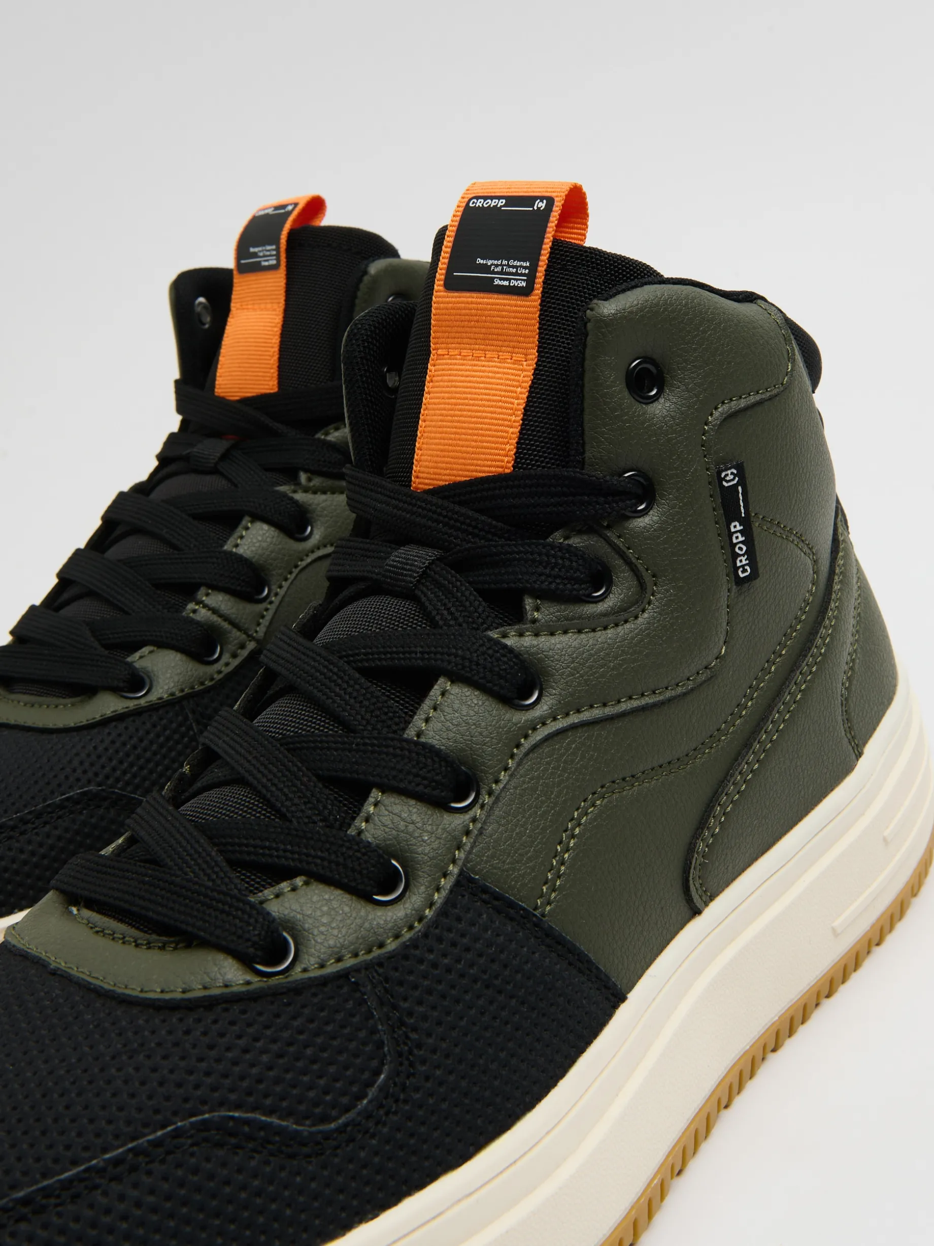 Męskie sneakersy za kostkę za sezon przejściowy w streetowym stylu. Na cholewce wstawki z efektem skóry. Dodatkowo miękka wyściółka wokół kostki zapewniająca komfort noszenia. A na tej solidnej, elastycznej podeszwie uważaj, żebyś nie odleciał. cholewka ze wstawkami ze sztucznej skóry lekkie gąbkowanie wokół kostki grubsza podeszwa z gumy termoplastycznej wiązane na płaskie, czarne sznurowadła wygodny uchwyt do wkładania i zdejmowania butów ozdobna naszywka z przodu naszywka Cropp
