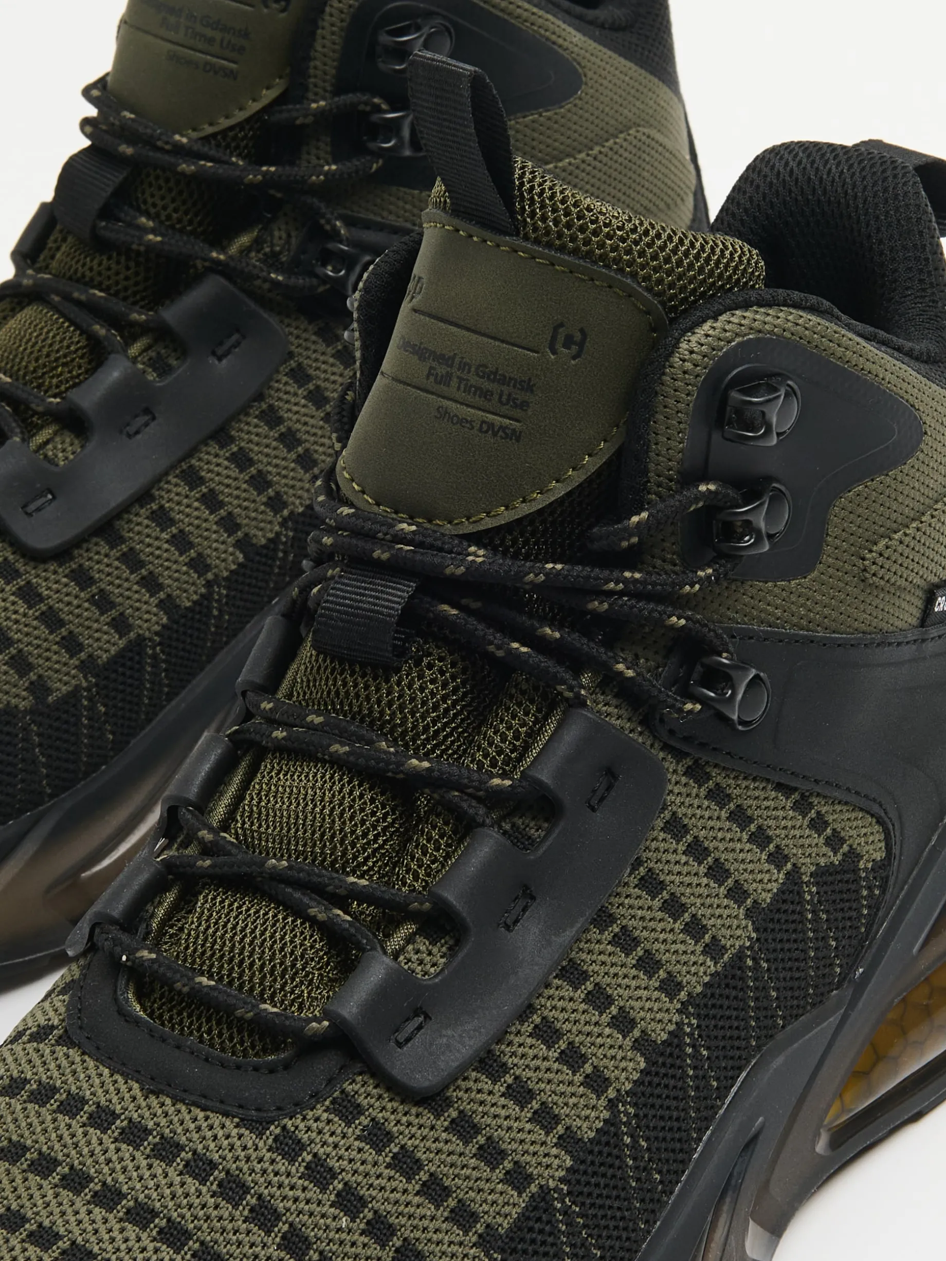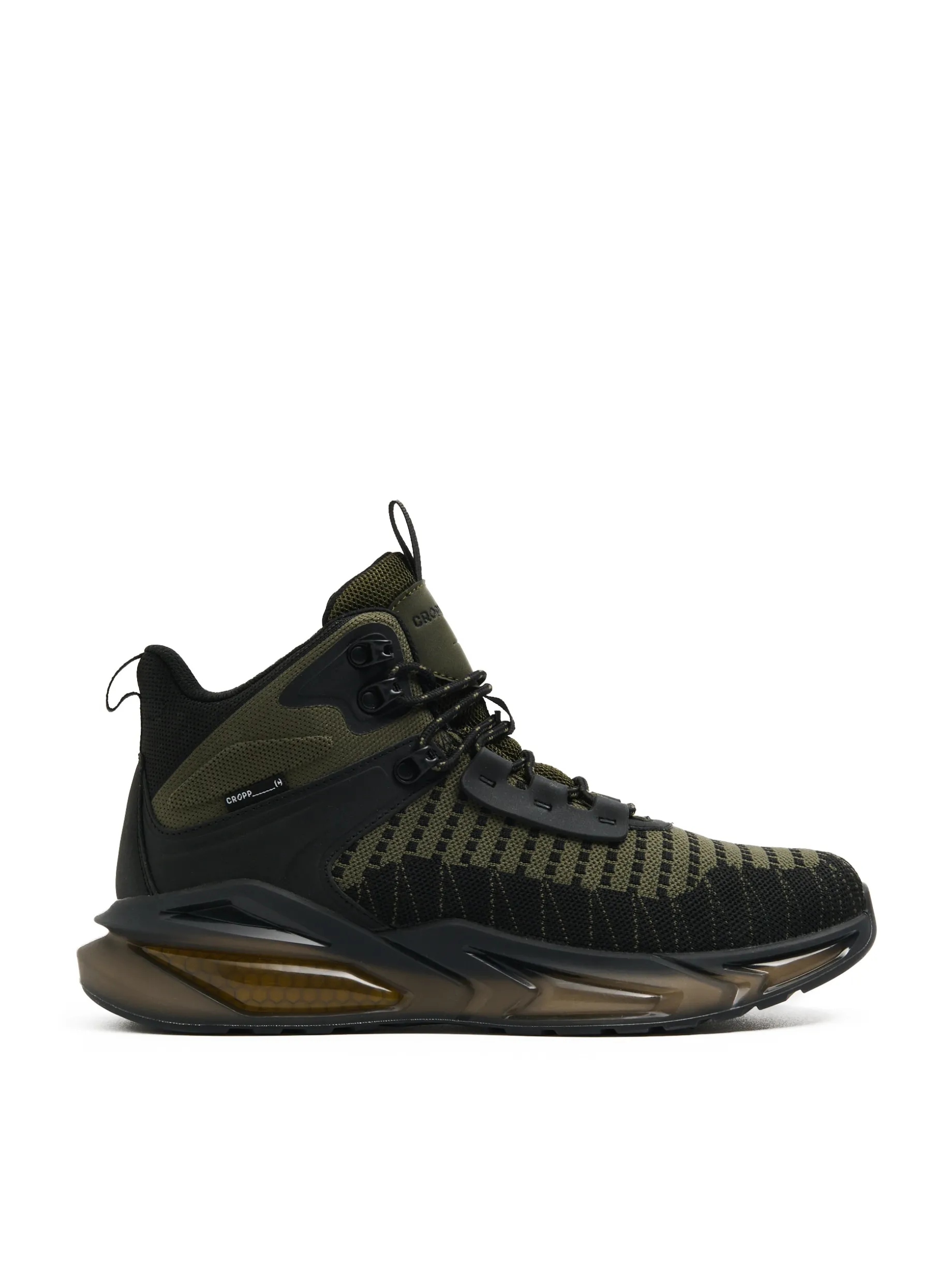Sportowe buty na zimę? Check! Męska para wysokich sneakersów wykonana z łączonych materiałów. Podeszwa amortyzuje każdy ruch, dzięki mieszance gum i miękkiej pianki EVA. Do tego wygodne wiązanie i można ruszać w drogę, z fartem! sznurowane sneakersy z ociepleniem sportowy fason ozdobna siateczka typu mesh lekkie gąbkowanie wokół kostki elastyczne sznurówki ze stoperami podeszwa wykonana z mieszanki gumy termoplastycznej, syntetycznej i miękkiej pianki EVA dodatkowa amortyzacja na piętach wzmacniany nosek zwiększający ochronę przed zużyciem naszywka Cropp