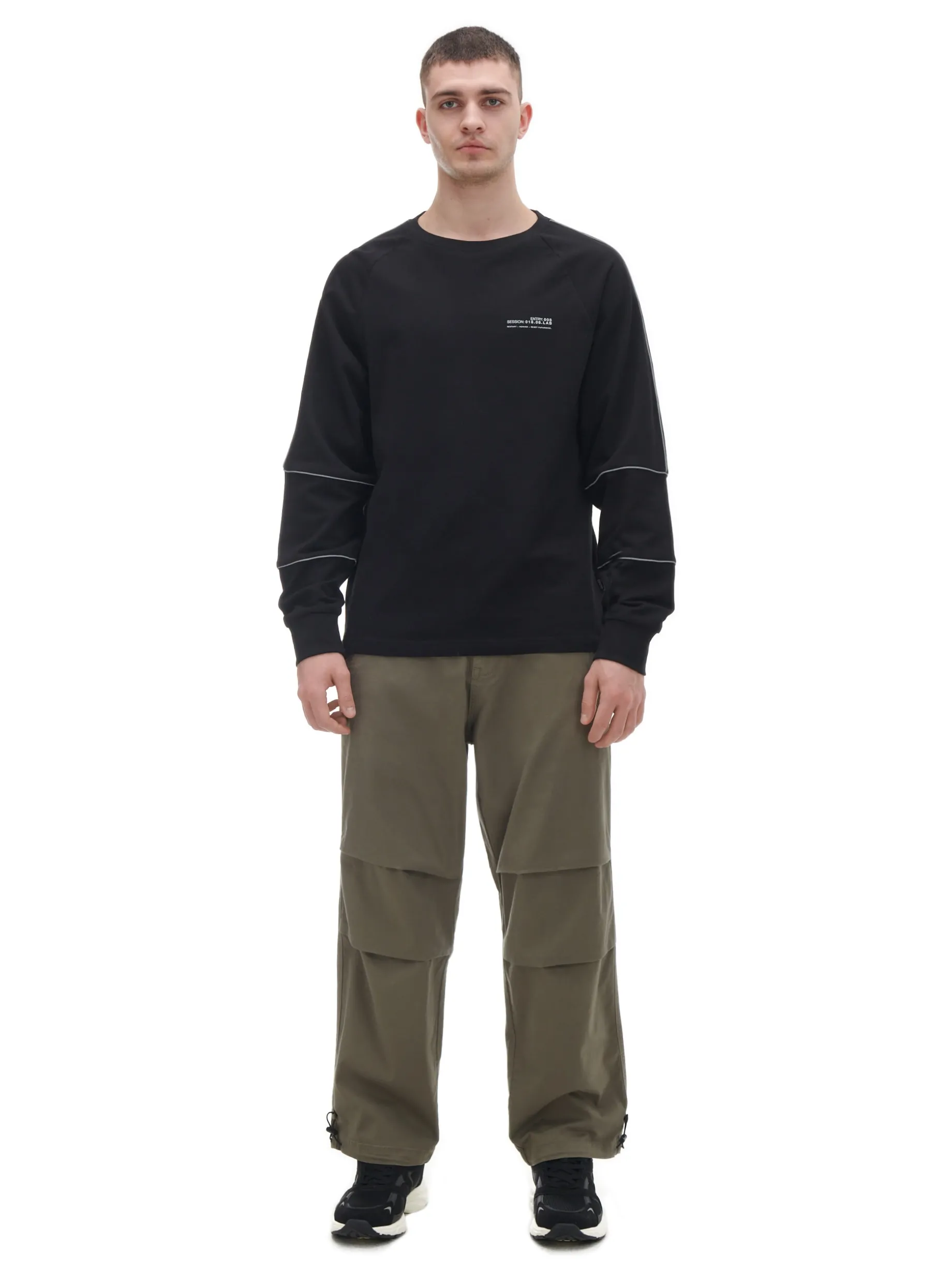 Zielone męskie spodnie o luźnym fasonie parachute, uszyte z lekkiej bawełnianej tkaniny. regularny stan rozporek z suwakiem wbudowany pasek zapinany na plastikową klamrę luźna nogawka zakończona regulacją za pomocą elastycznej gumki ze stoperem trzy kieszenie, w tym jedna z tyłu, zapinana na zatrzask Wzrost modela: 184 cm