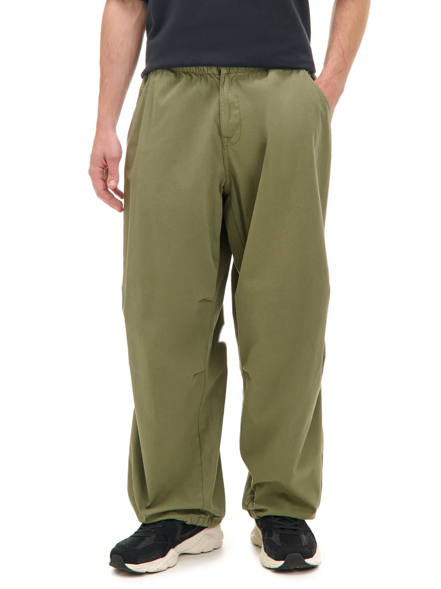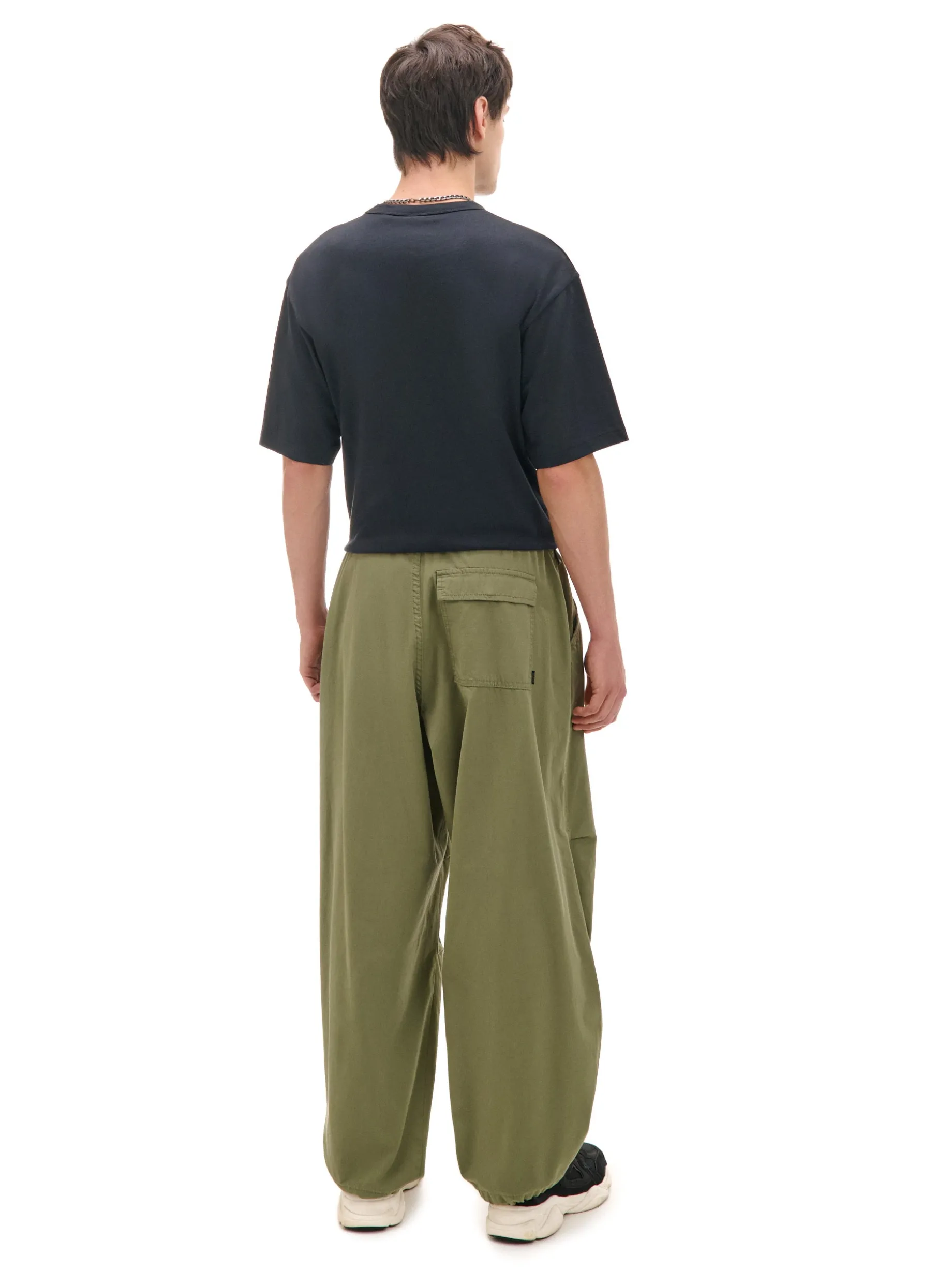 Męskie spodnie typu parachute, uszyte z bawełny w kolorze oliwkowym. Wygodna regulacja w pasie, oryginalne zakładki i pojemne kieszenie to must have spontanicznych wypadów. 100% bawełny swobodny, luźny krój zapięcie na zatrzask i zamek regulacja dołu i pasa za pomocą sznurka ze stoperem trzy kieszenie, jedna zapinana na zatrzask ozdobne zakładki