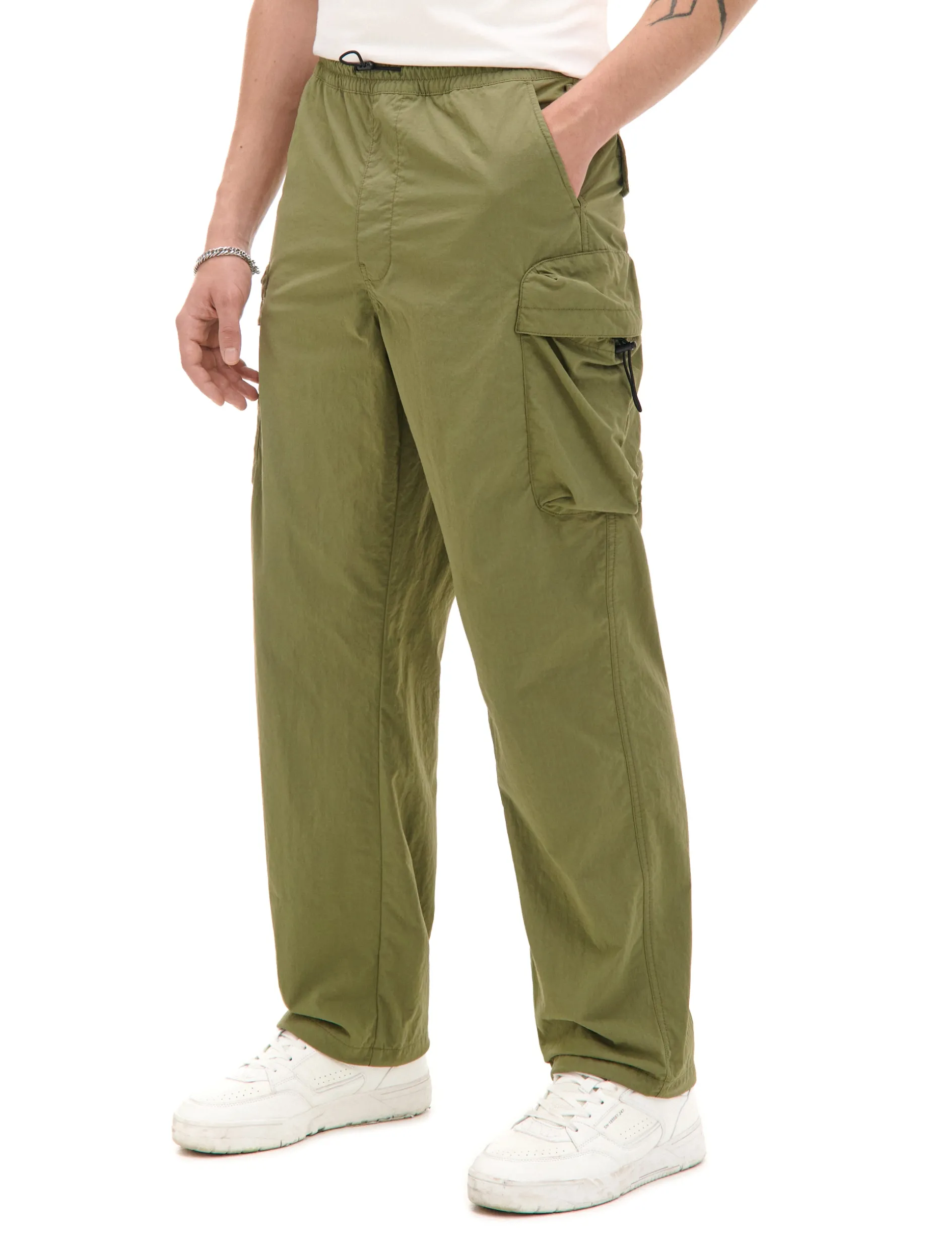 Męskie spodnie o kroju comfort uszyte z gładkiej tkaniny. Wyposażone w 6 praktycznych kieszeni – otwartych i z patkami. Regulacje za pomocą elastycznej gumy ze stoperami w pasie i przy nogawkach zapewniają dopasowanie do sylwetki. wygodny fason comfort długa, luźna nogawka zakończona gumką ze stoperem ściągacz tunelowy ze stoperami w talii dwie kieszenie z patkami i zapięciem na zatrzaski kieszenie z patkami na udach regulacja kieszeni za pomocą elastycznej gumki ze stoperem skośne kieszenie z przodu