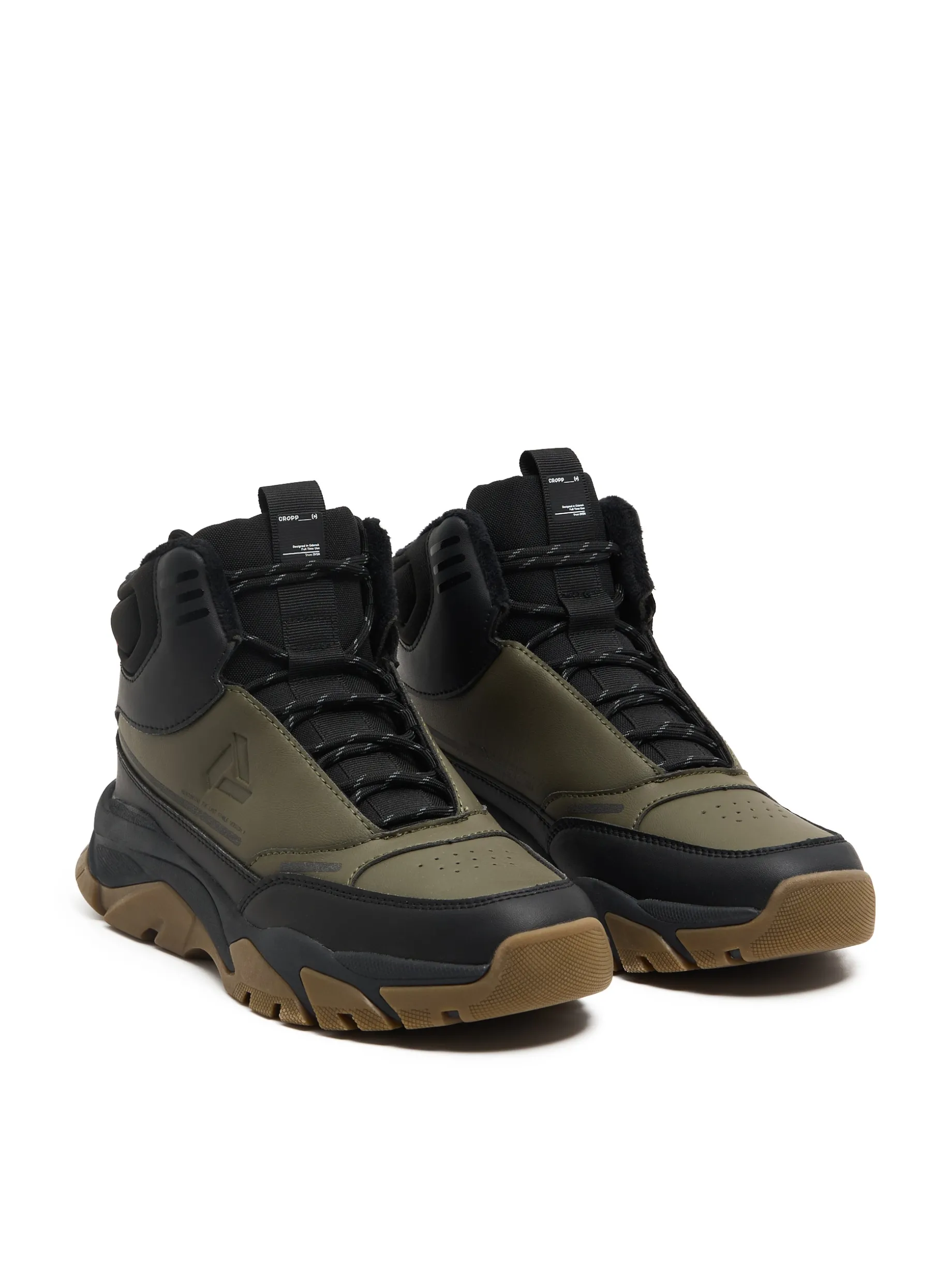 Męskie sneakersy za kostkę wykonane z mieszanki solidnego materiału i imitacji skóry. Dodatkowe wypełnienie w kostce i języku zapewnia ciepło i amortyzację. Wejdź w zimę na pełnej z naszymi butami! sznurowane sneakersy z ociepleniem cholewka ze wstawkami ze sztucznej skóry lekkie gąbkowanie wokół kostki delikatne wypustki z przodu usprawniające przepływ powietrza dodatek lycry wmacnia język i zapobiega zabrudzeniom wiązane na elastyczne, prążkowane sznurówki podeszwa wykonana z mieszanki phylonu i gumy termoplastycznej wzmacniany nosek zwiększający ochronę przed zużyciem wygodne uchwyty do wkładania i zdejmowania butów naszywka Cropp ozdobne naszywki metodą emboss detale z efektem reflective
