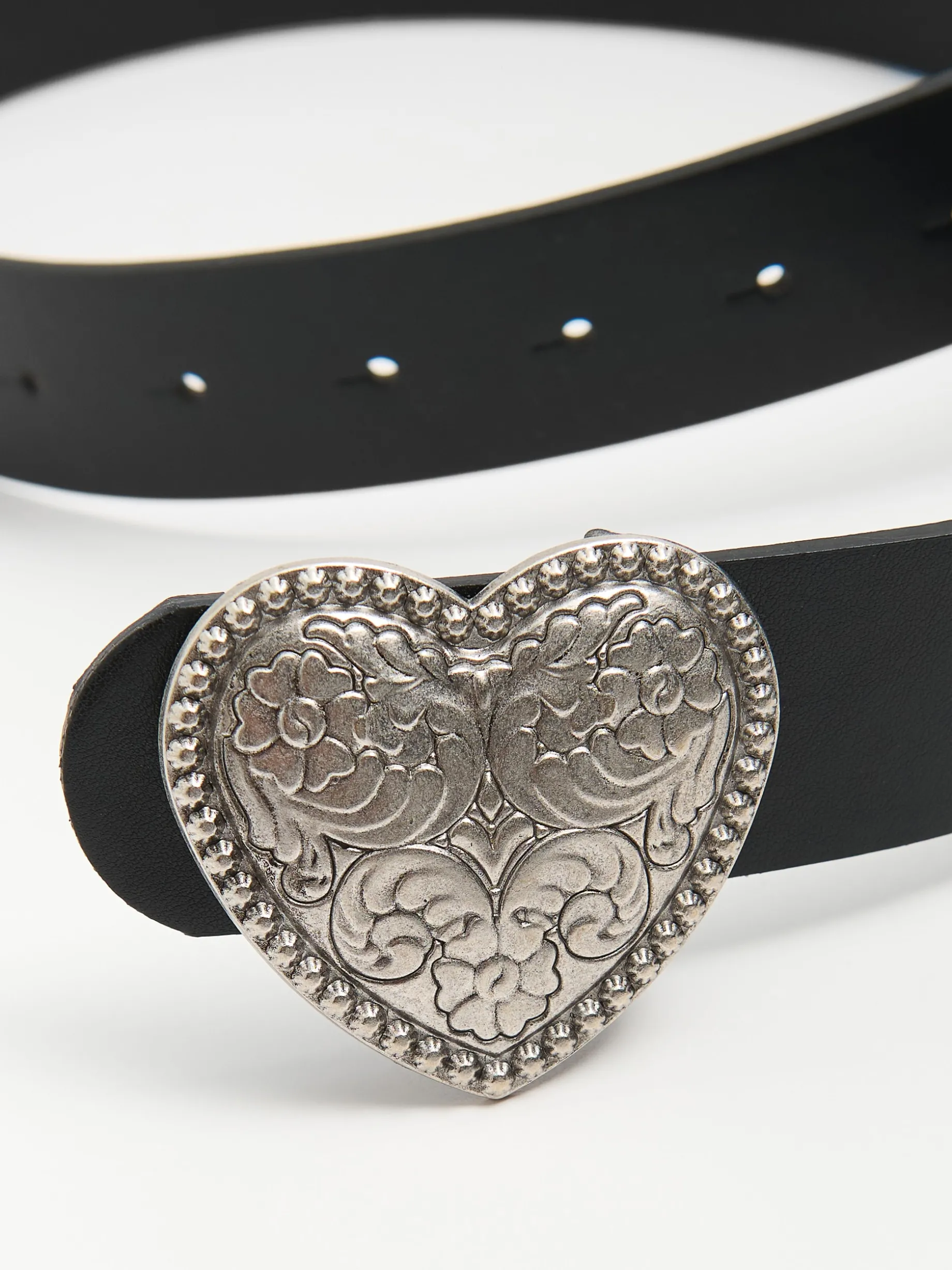 Damski pasek do spodni z dekoracyjną klamrą w kształcie serca ułatwiającą regulację. Wykonany z imitacji skóry w klasycznym, czarnym kolorze. Idealny dodatek do wielu stylizacji. imitacja skóry możliwość regulacji szerokości obwodu, dzięki zapięciu z przodu dekoracyjna klamra