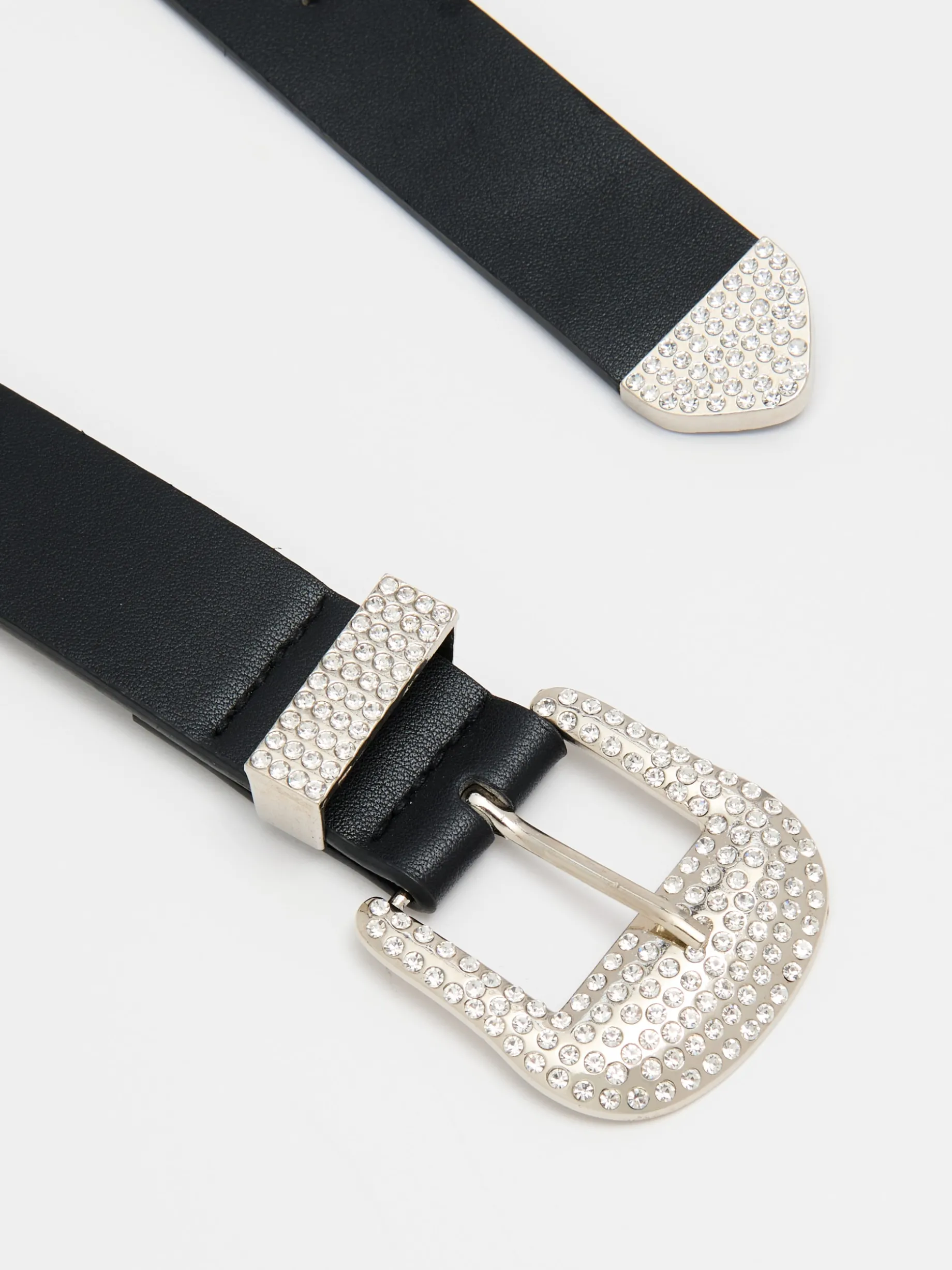 Mamy dla Ciebie damski pasek wykonany ze sztucznej skóry z metalowymi detalami. Ozdobą tego modelu jest klamra wykończona cyrkonami. Akcesoriów nigdy nie za wiele!