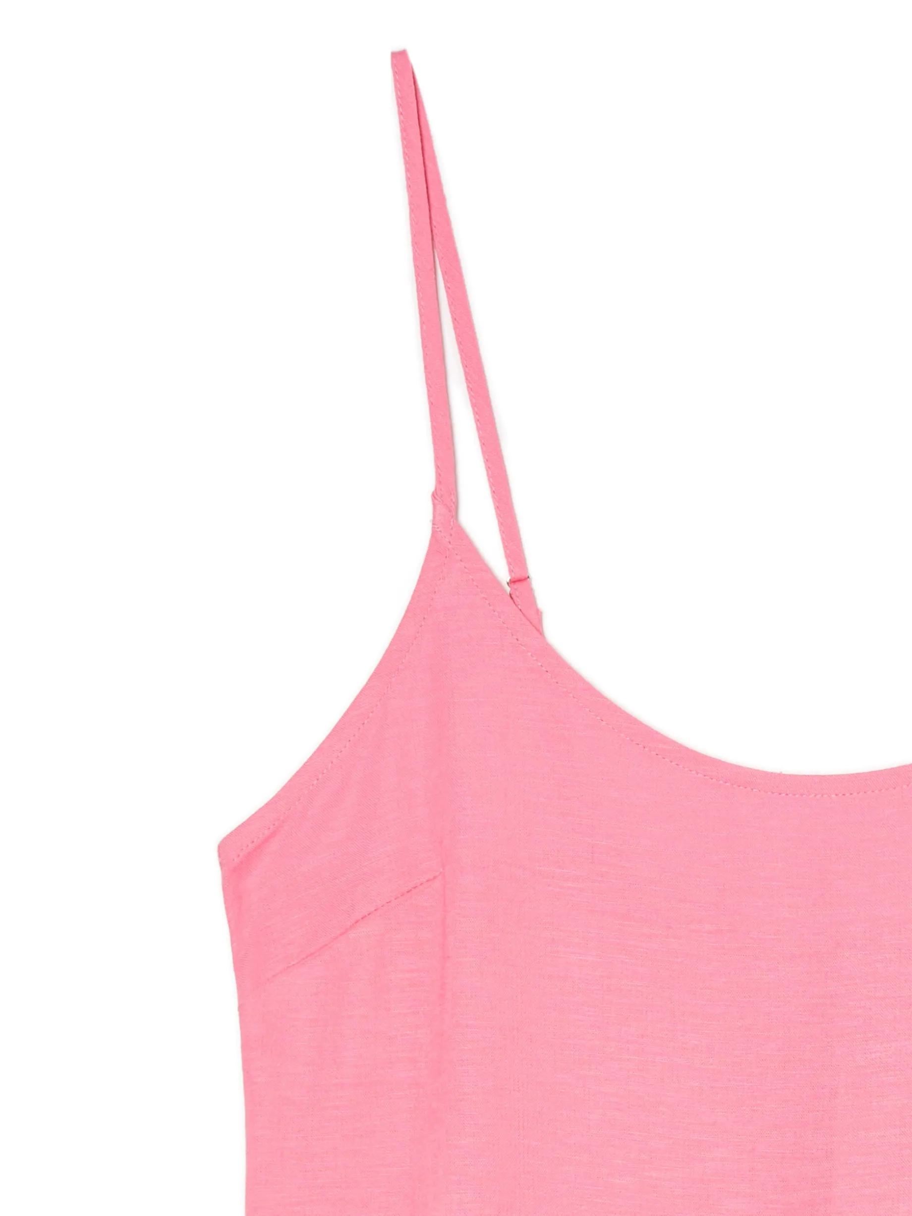 Zwiewna damska sukienka midi w różowym odcieniu uszyta z mieszanki wiskozy i lnu. Regulowane cienkie ramiączka, rozcięcia po bokach i luźny krój stawiają ją na topce letnich stylizacji. lekki materiał z wiskozą długość midi swobodny, luźny krój wąskie ramiączka z regulacją długości delikatne rozcięcia po bokach