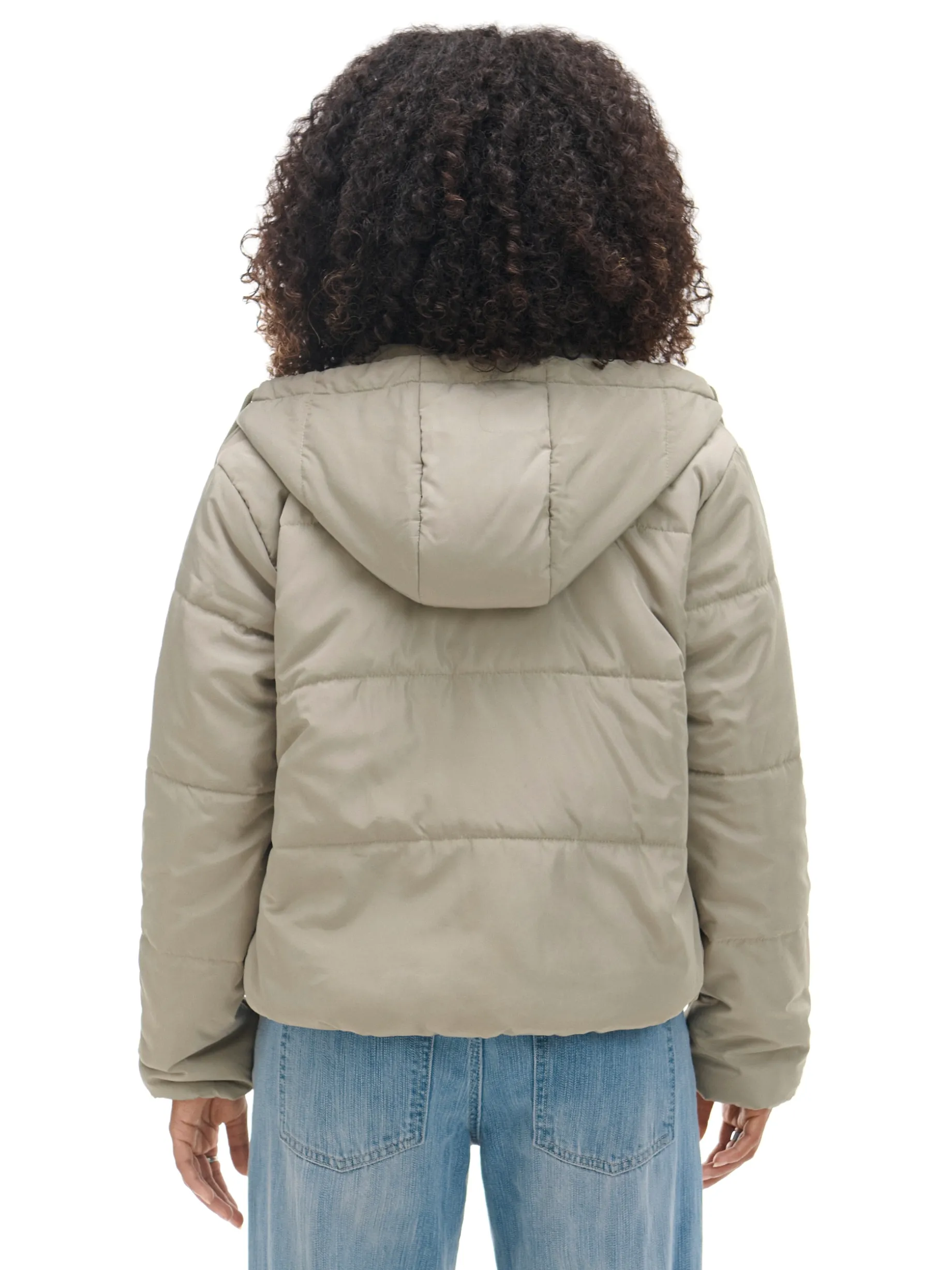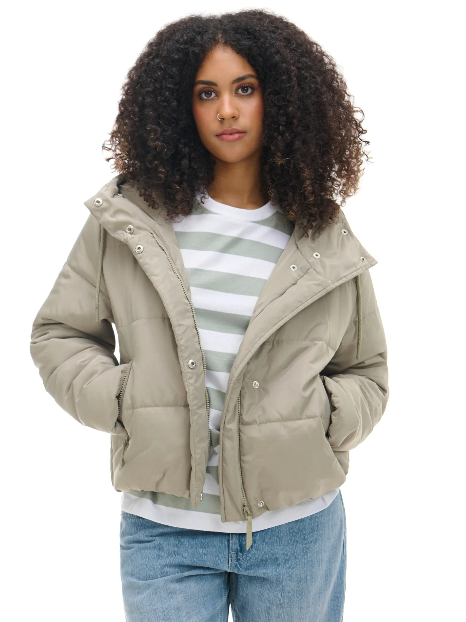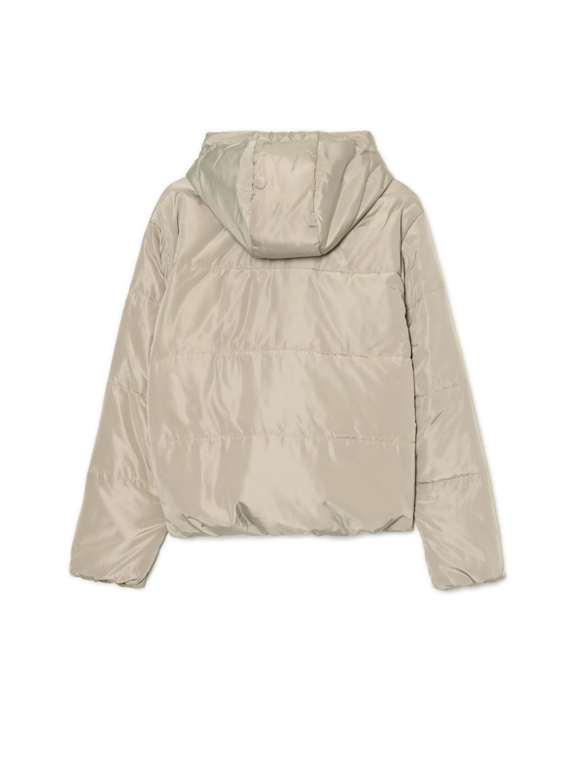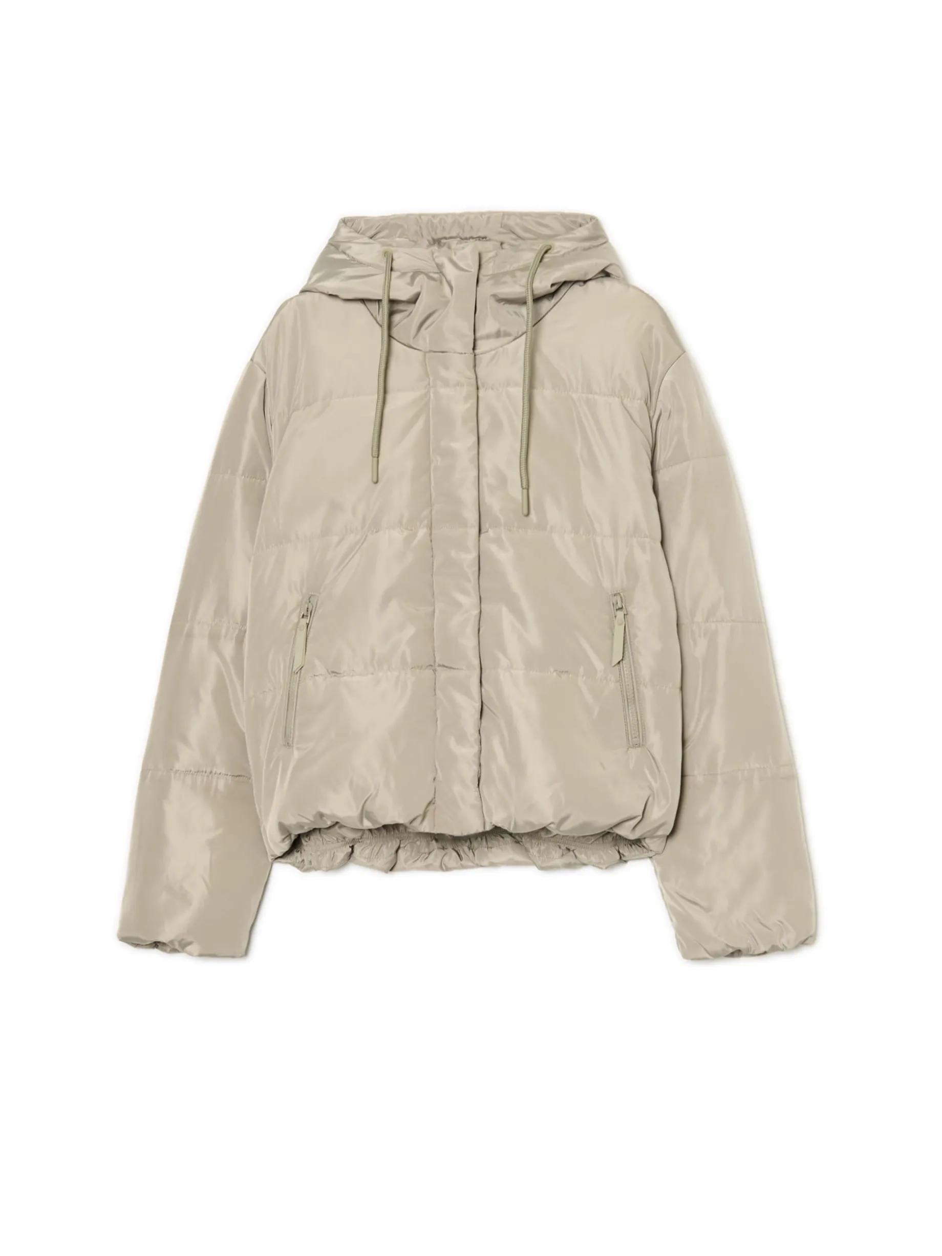 Damska biała kurtka puffer, uszyta z wodoodpornej tkaniny. Idealna na jesienny sezon przejściowy. średnia długość, regularny krój pikowanie na całej powierzchni zapięcie na suwak, kryty panelem zapinanym na zatrzaski stójka zapinana na zatrzaski kaptur regulowany sznurkiem rękawy i dolny brzeg zakończone ściągaczem z wszytą elastyczną gumką dwie kieszenie podszewka z polarowego, przyjemnego w dotyku materiału wypełnienie z poliestru