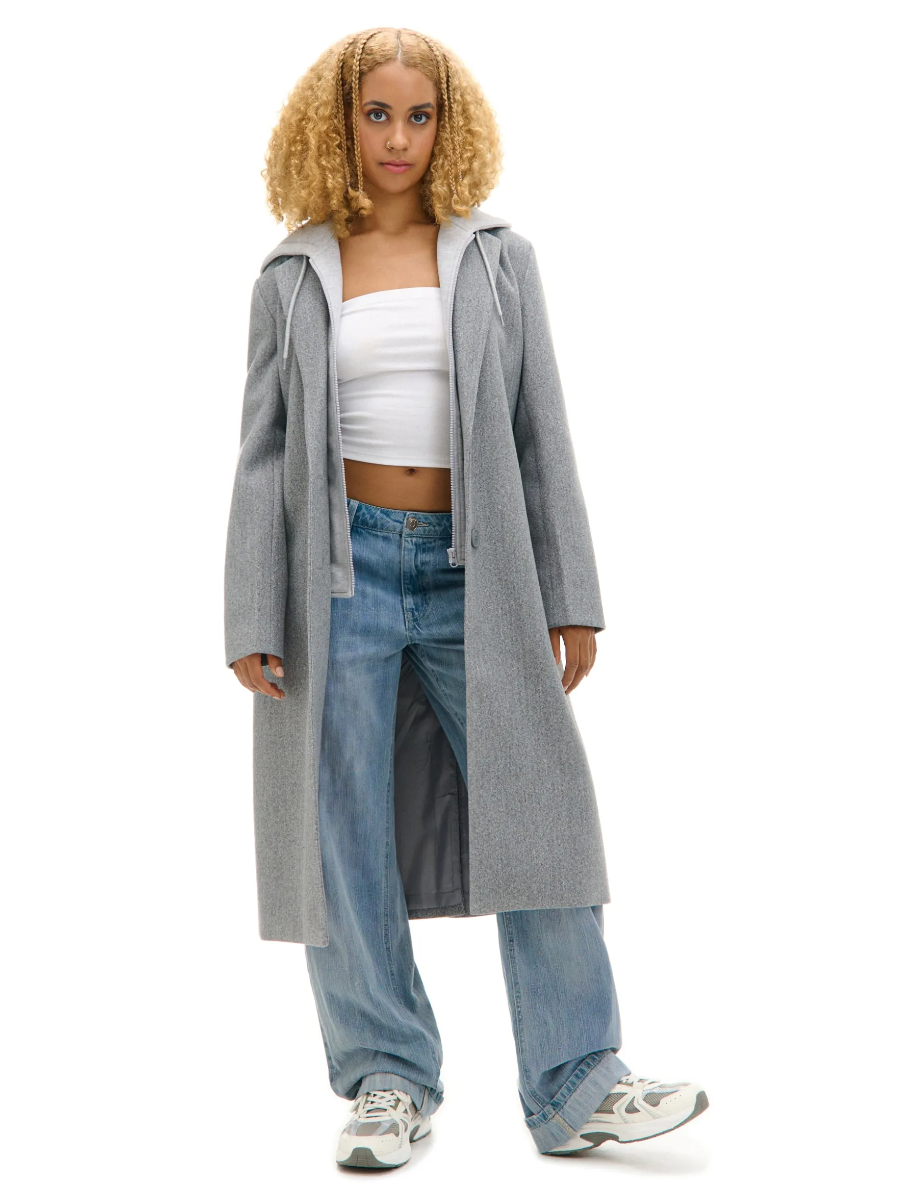 Melanżowy damski płaszcz uszyty z łączonych materiałów w kolorze szarym. Wstawka z miękkiej bluzy hoodie zapinanej na suwak nadaje jej sportowego charakteru. Oryginalny item na jesienne dni! regularny krój jednorzędowe zapięcie na guziki wykończenie na podszewce wykładany kołnierz miękki kaptur z troczkami długie rękawy dwie kieszenie po bokach praktyczne rozcięcie z tyłu