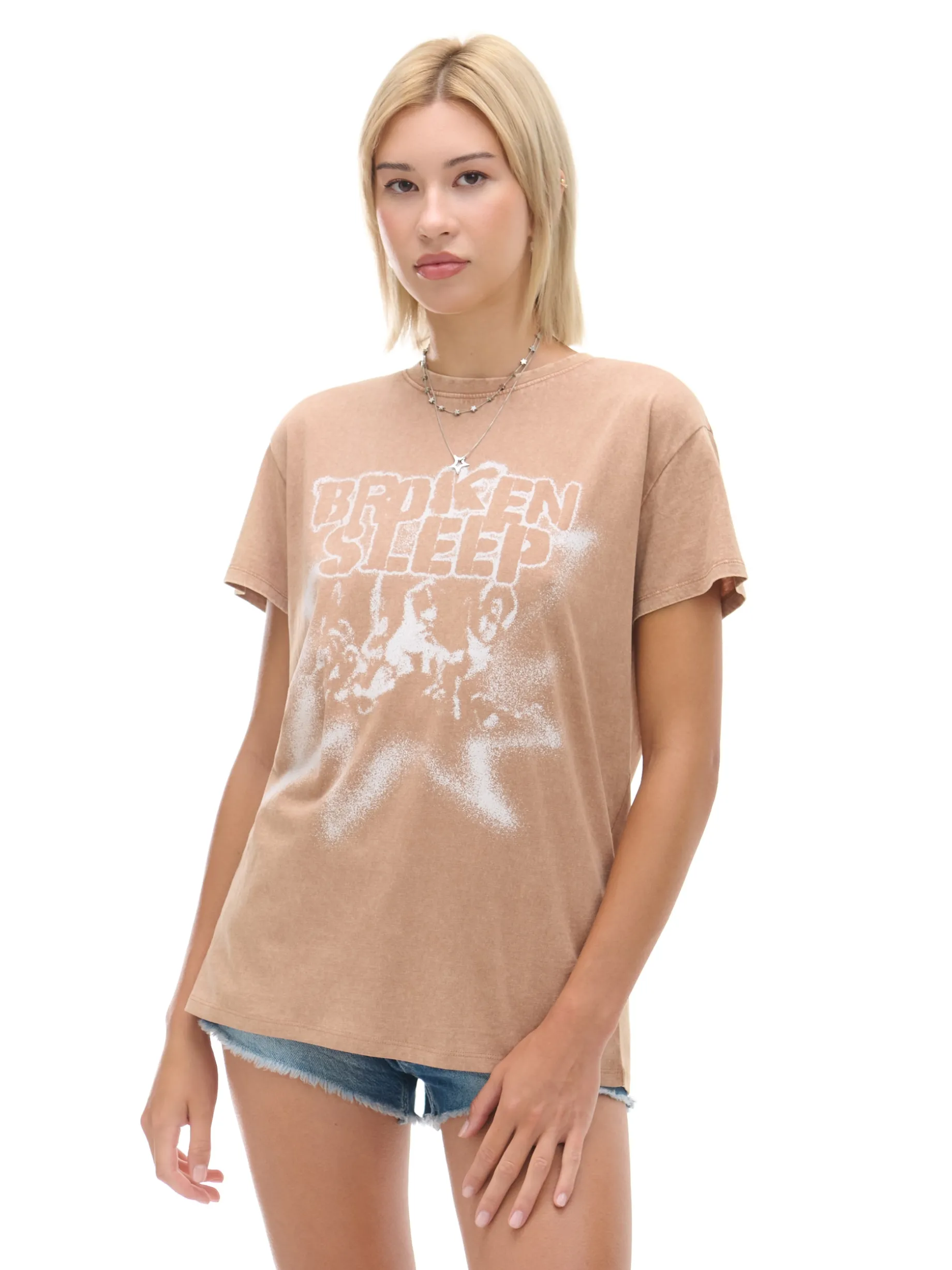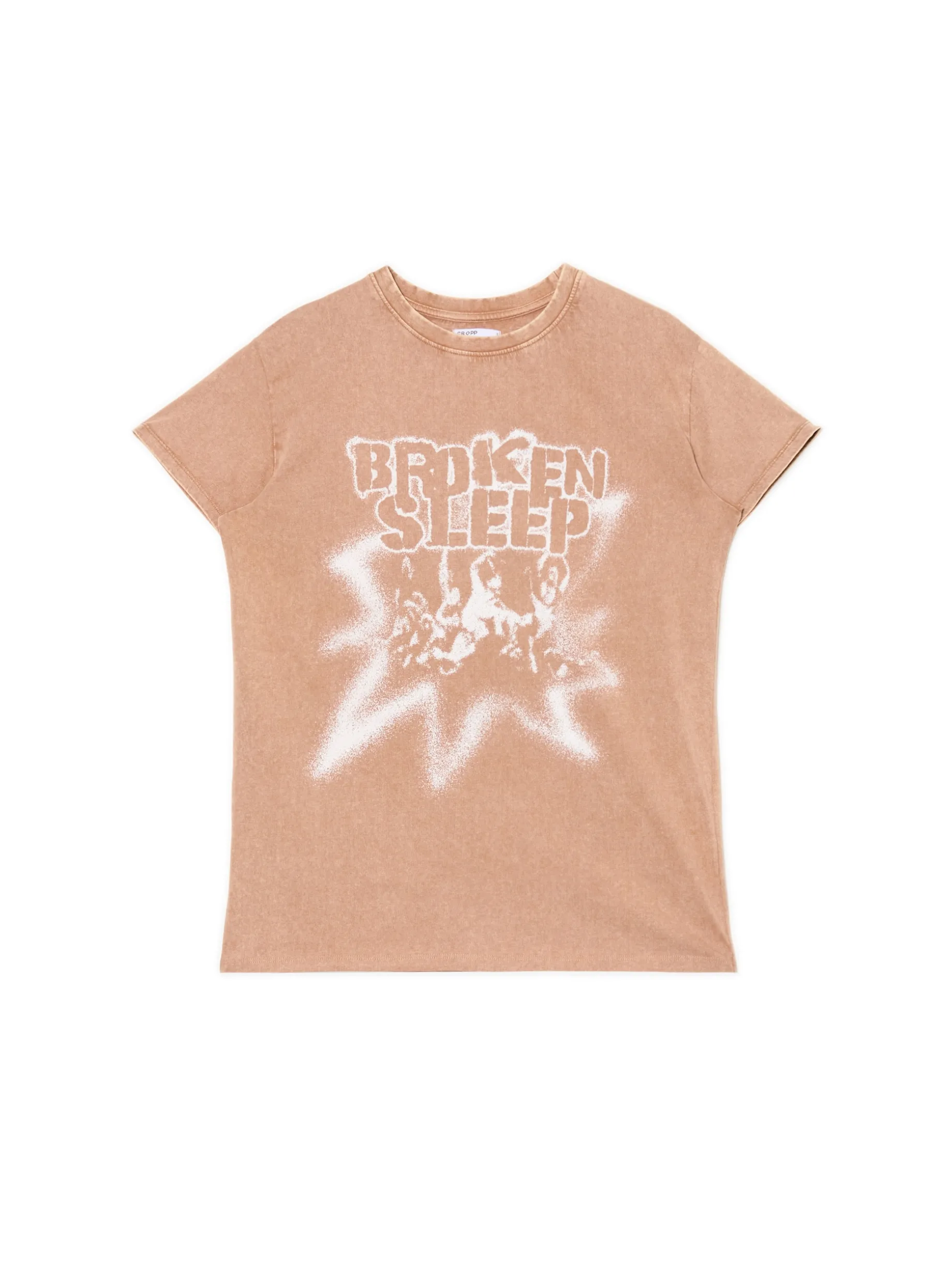 Damski t-shirt oversize, uszyty w 100% z bawełny. obszerny, luźny krój krótkie rękawy z przodu nadruk Wzrost modelki: 177 cm