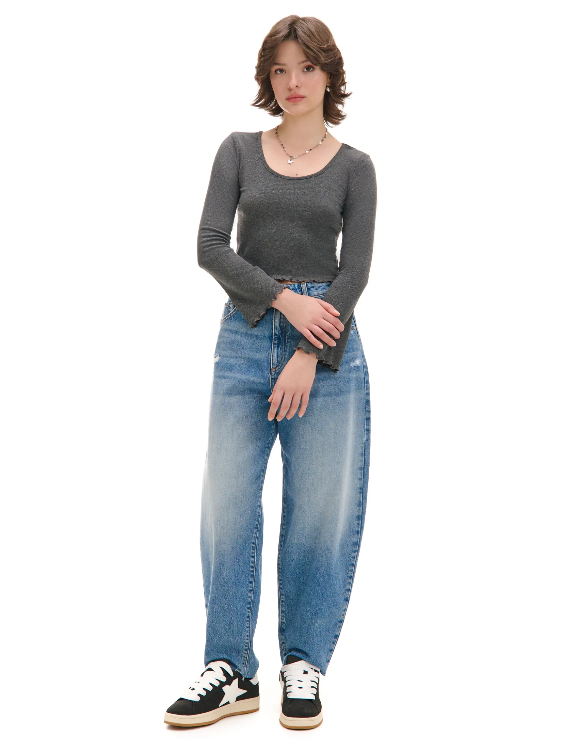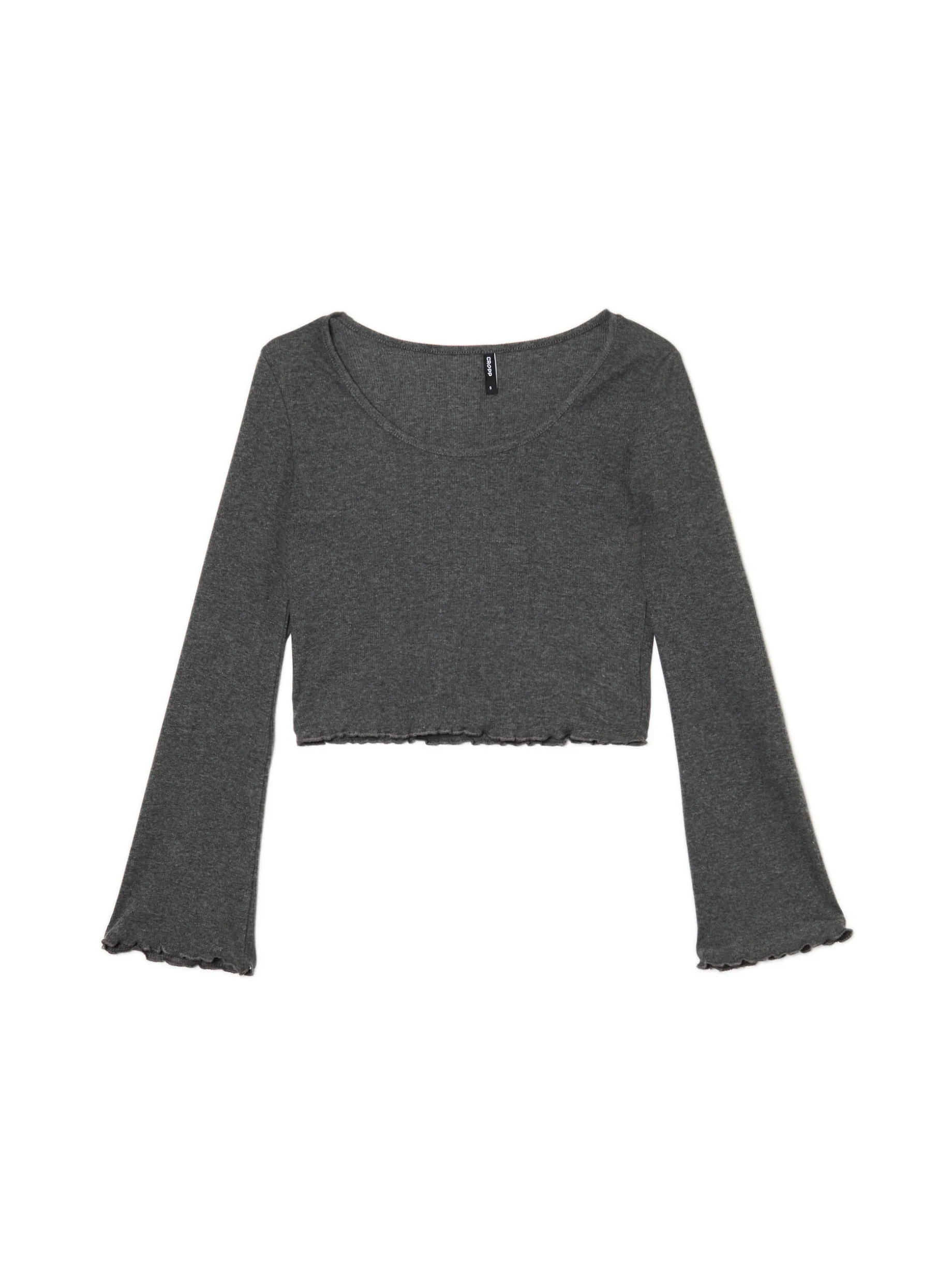 Koszulka damska z długimi rękawami uszyta z mieszanki dzianin z dodatkiem elastycznych włókien. Wyposażona w ozdobne falbanki przy brzegach, delikatnie rozkloszowane rękawy i głęboki dekolt. Idealny item na jesienny vibe! uszyta z prążkowanej dzianiny koszulka o krótszym, dopasowanym fasonie głęboki dekolt lekko rozszerzane rękawy dekoracyjne wykończenie brzegu