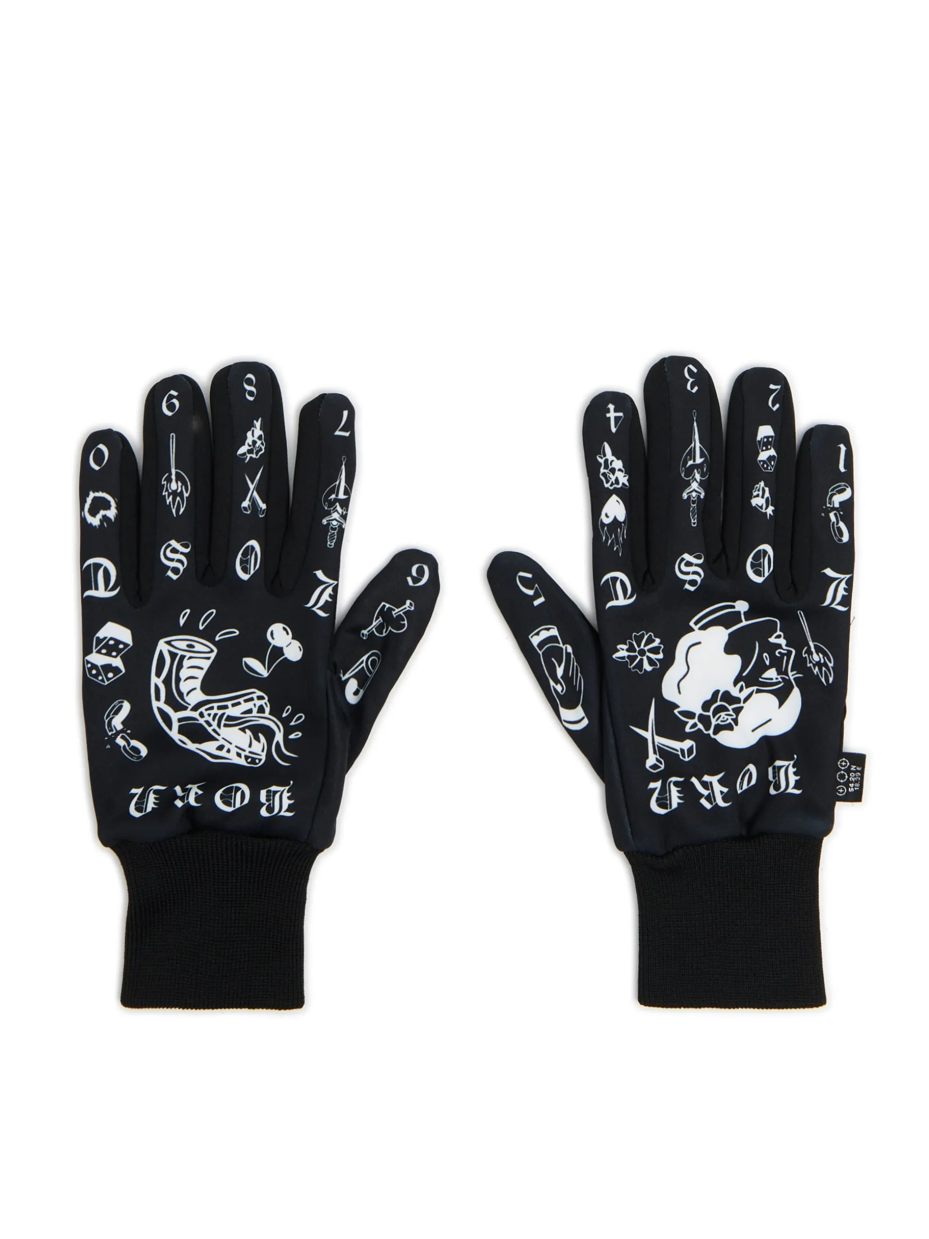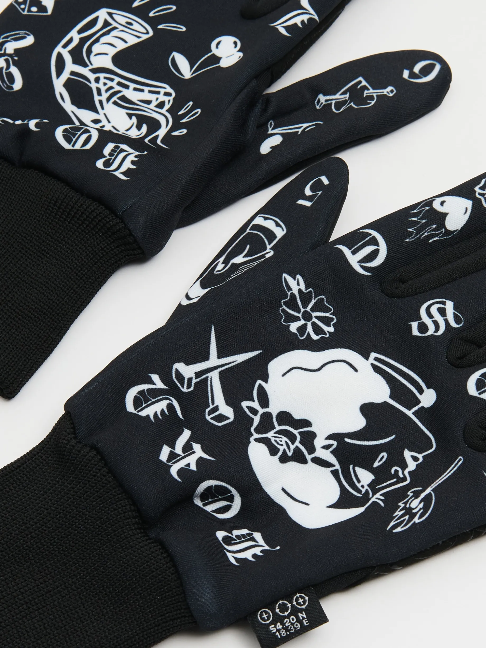 Męskie pięczopalczaste rękawiczki ze sztosowymi, punkowymi nadrukami w kontrastowym, białym kolorze. dzianina z domieszką elastycznych włókien wewnętrzna matowa strona ograniczająca ślizganie się materiału ściągacze utrzymujące materiał przy nadgarstach dodatkowe wstawki przy palcach dla wzmocnienia kontrastowy nadruk z przodu naszywka Cropp