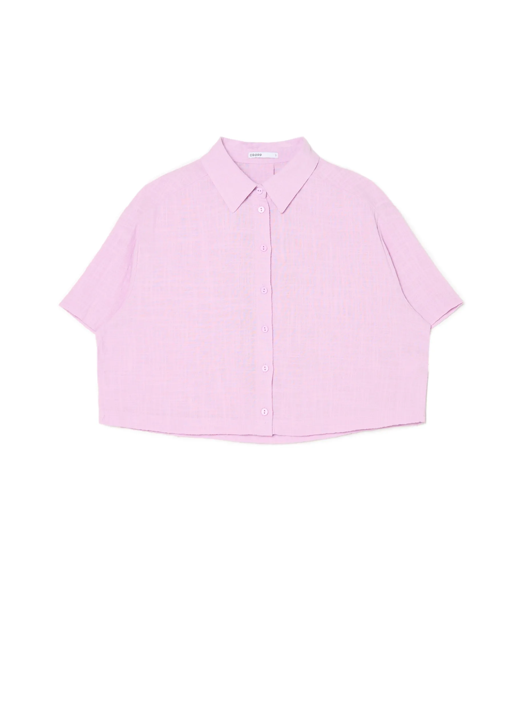 Damska luźna koszula, uszyta z bawełnianej tkaniny o wyjątkowej fakturze. krótki, obszerny krój oversize krótkie, luźne rękawy zapięcie na drobne guziki klasyczny kołnierzyk