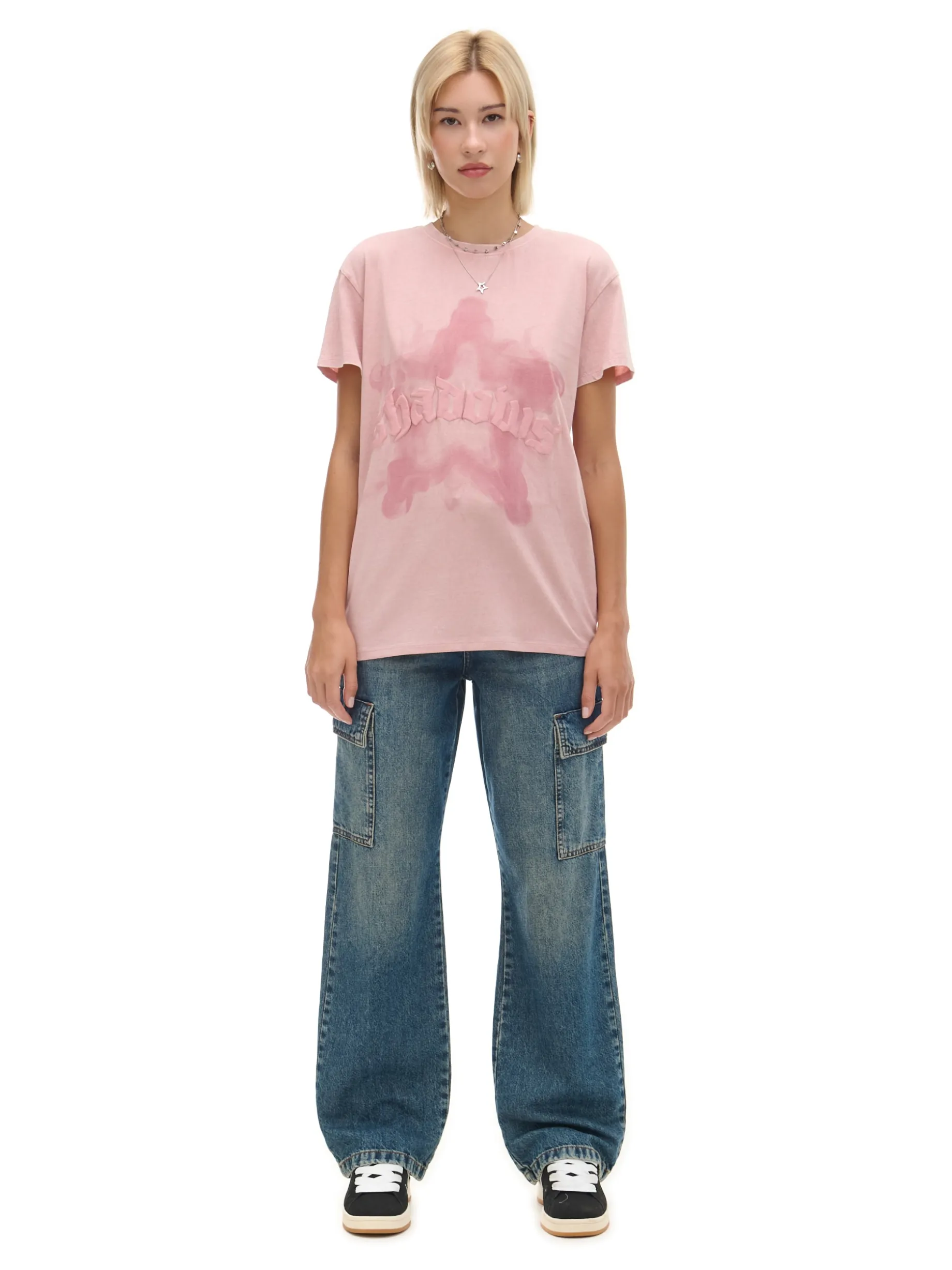 Damski t-shirt oversize, uszyty w 100% z bawełny. obszerny, luźny krój krótkie rękawy z przodu nadruk z motywem gwiazdy i wypukły puff print z napisem Wzrost modelki: 177 cm
