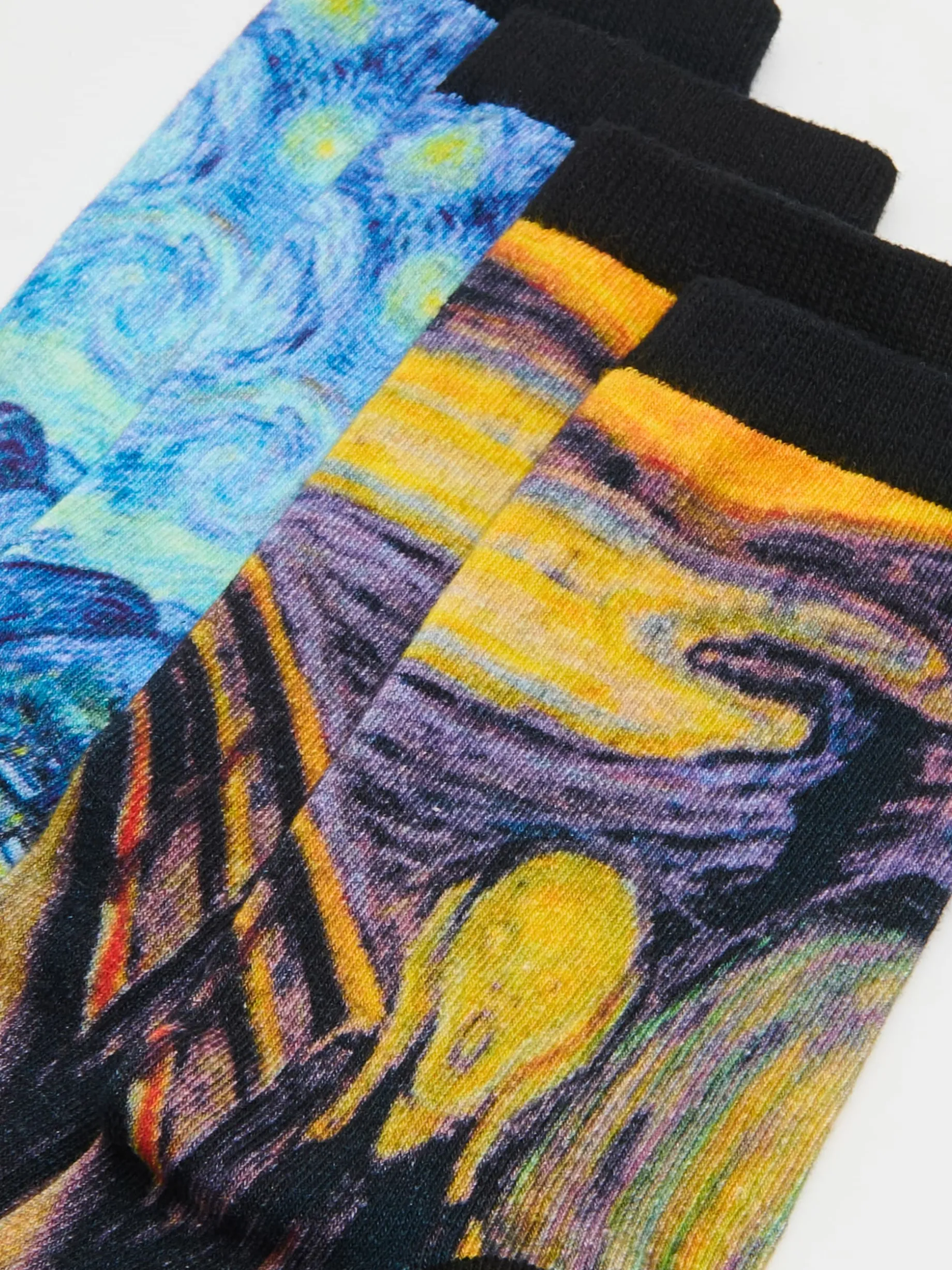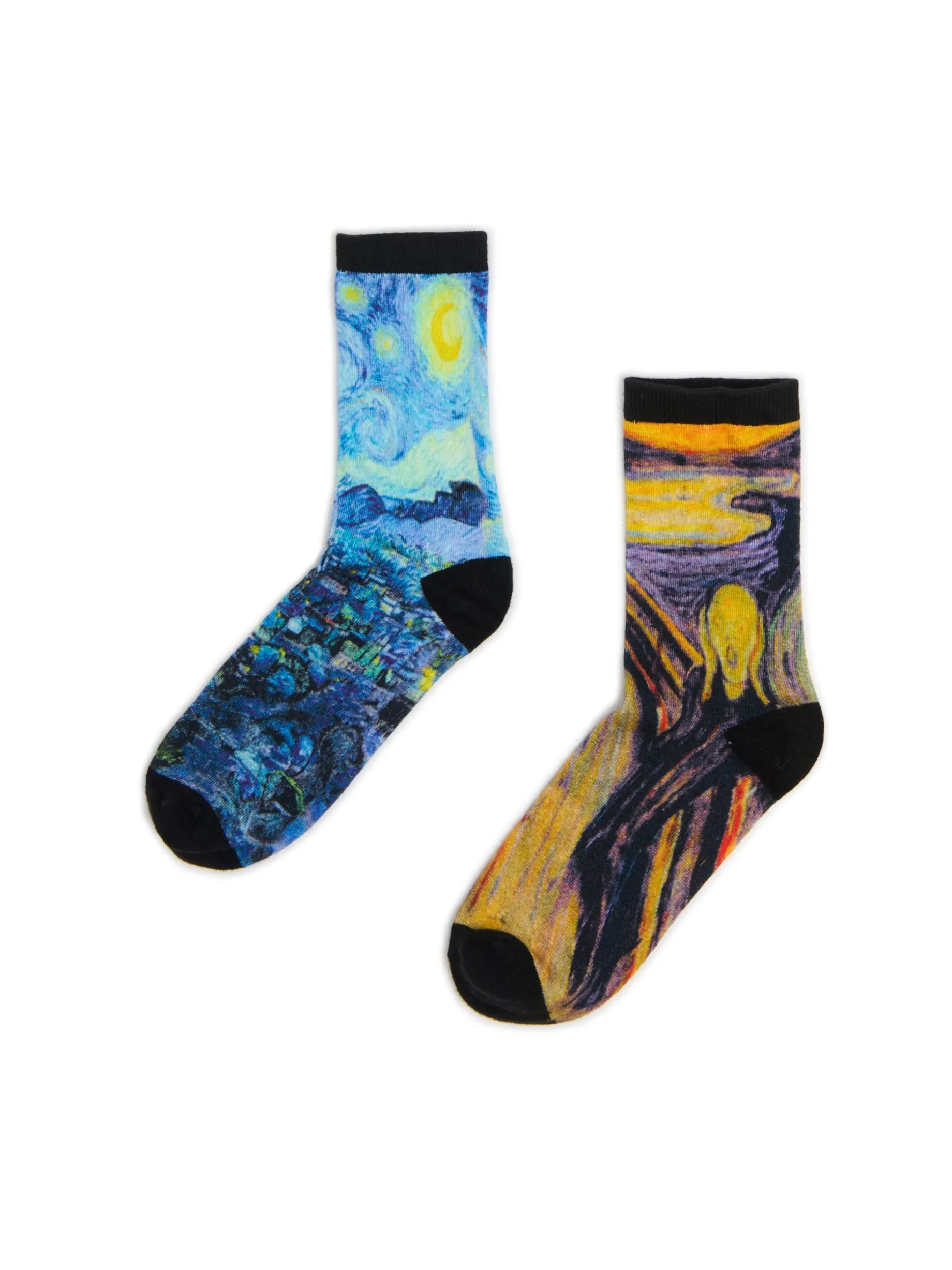 Te arcydzieła możesz mieć w swojej kolekcji. Zestaw dwóch par damskich długich skarpet uszytych z mieszanki dzianin z dodatkiem wysokiej jakości bawełny. Na każdym secie nadruki inspirowane pracami wybitnych malarzy. W tym pakiecie: „Gwiaździsta noc” Vincenta Van Gogha „Krzyk” Edvarda Muncha