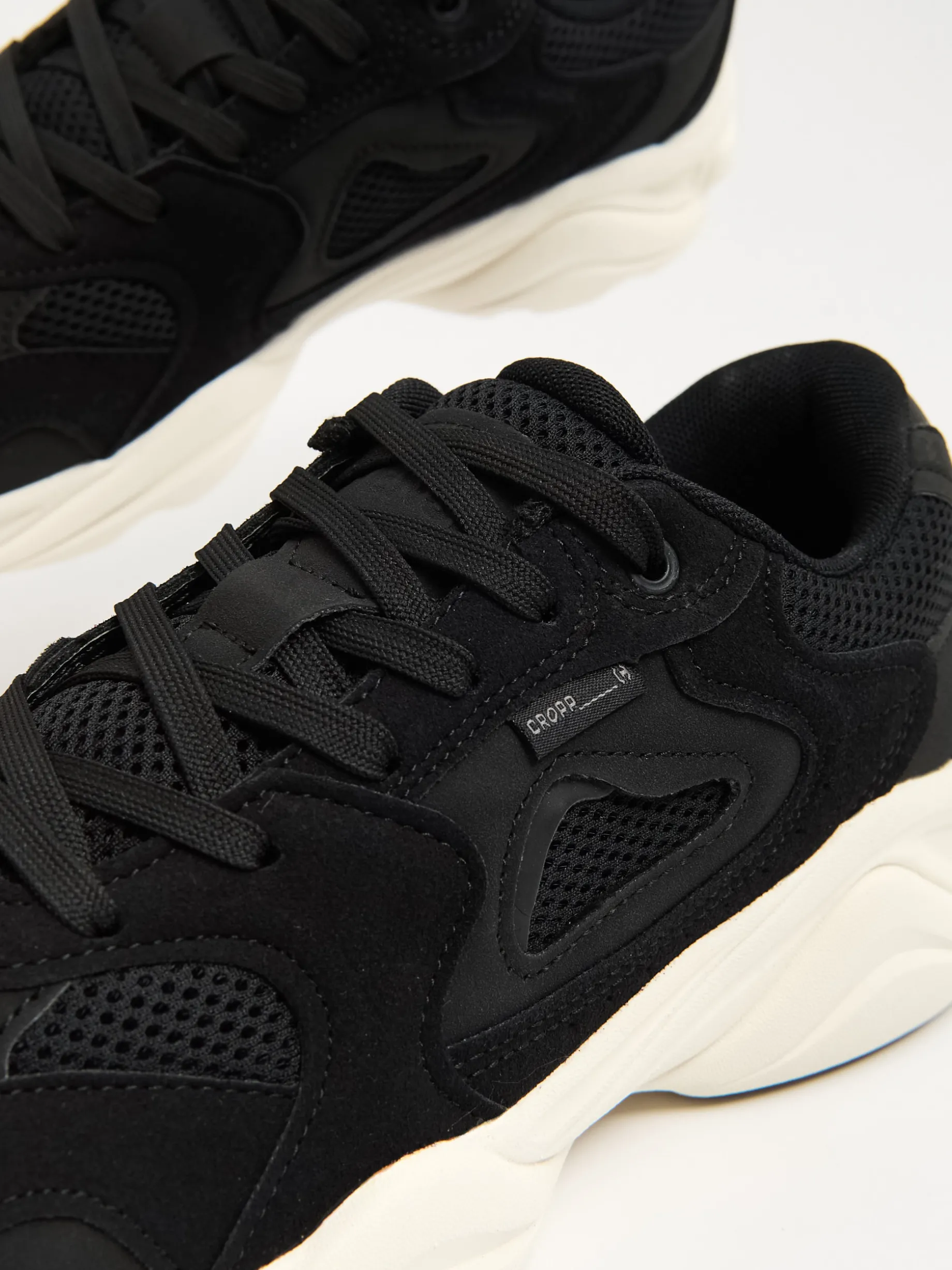 Męskie sportowe sneakersy na płaskiej, kontrastowej podeszwie. Elastyczna cholewka, płaskie sznurowadła i oddychająca siateczka zapewnią Ci komfort podczas każdej aktywności. Wypróbuj ten item! niskie sneakersy w sportowym stylu elastyczna cholewka z łączonych materiałów ozdobna siateczka typu mesh podeszwa wykonana z mieszanki phylonu i gumy termoplastycznej wiązane na płaskie, czarne sznurowadła naszywka z napisem Cropp