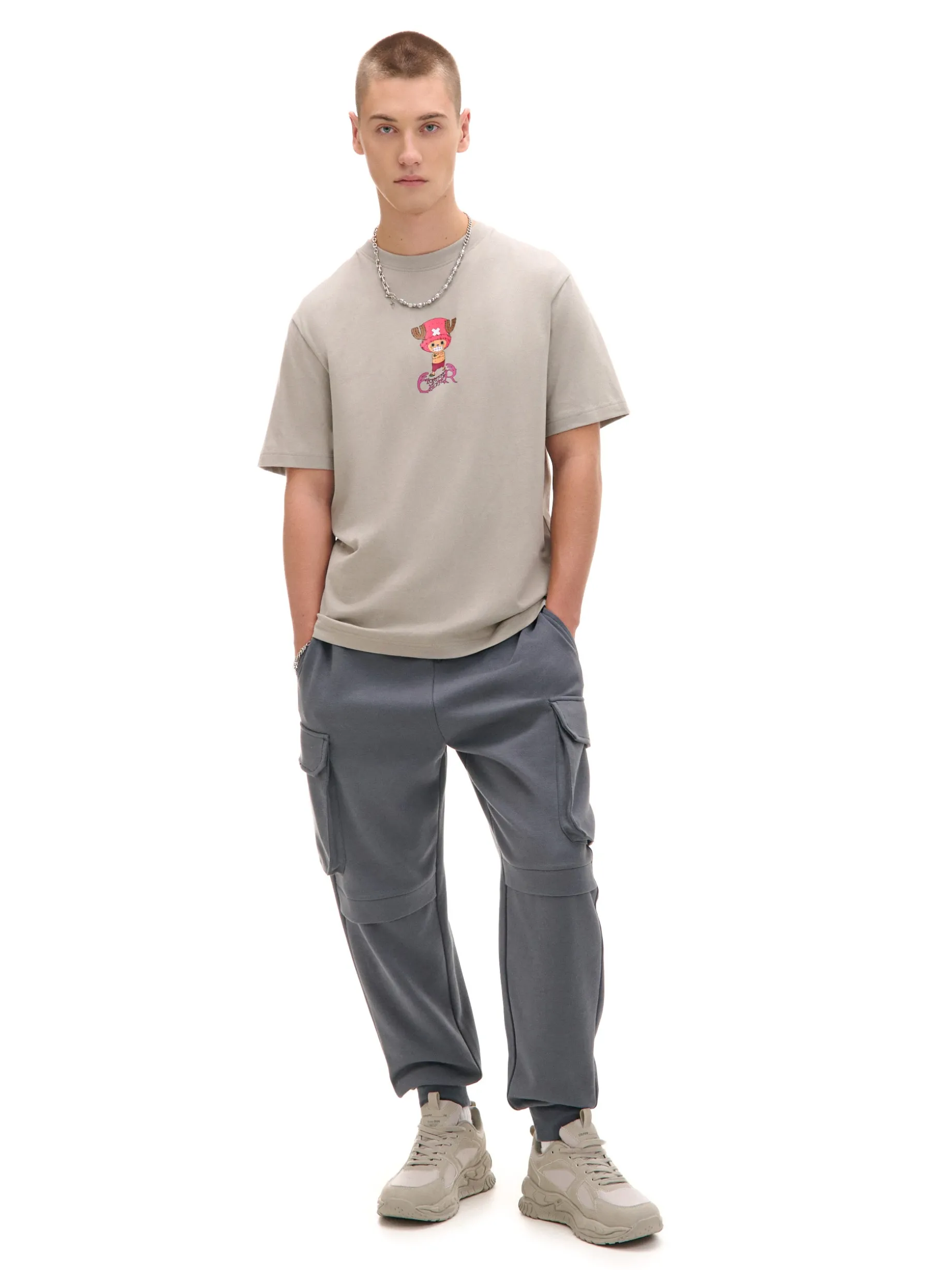 Szare męskie dresy uszyte z solidnej, dżersejowej dzianiny. Ten item wyznaje ponadczasową zasadę „przydasie”, bo podczas jesiennego chillowania przyda się swoboda i komfort. regularny stan guma w pasie ze sznurkiem do regulacji troczki w pasie długa nogawka zakończona ściągaczem otwarte kieszenie po bokach kieszenie z patkami na udach naszywana kieszeń z tyłu na zatrzask Wzrost modela: 185 cm