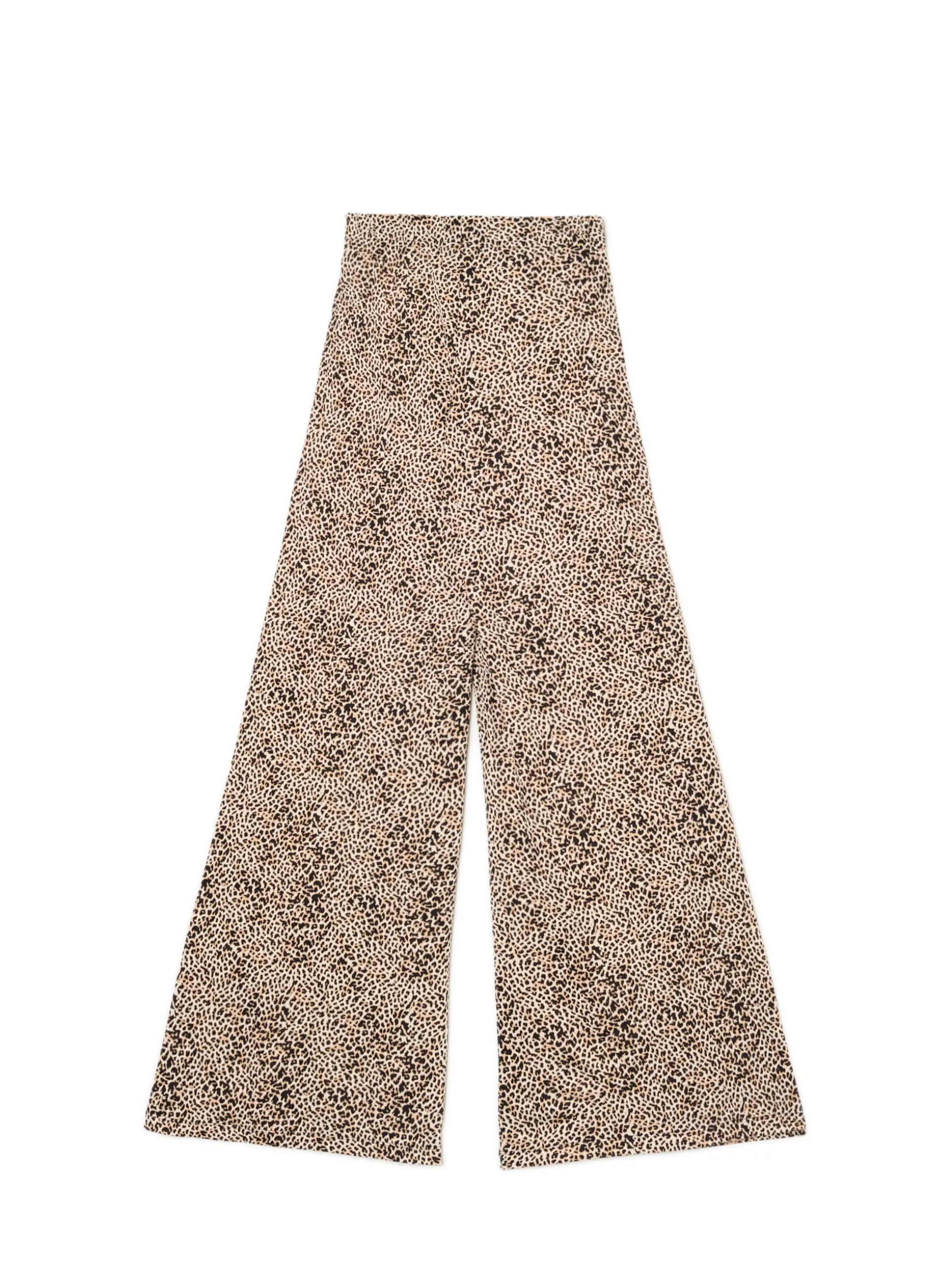 Spodnie damskie typu flare z wygodnymi, szerokimi nogawkami w stylu lat 80-tych. Ozdobą tego modelu jest ponadczasowy wzór w panterkę na całej powierzchni materiału. dzianinowe spodnie o kroju flare rozszerzane nogawki elastyczna gumka w pasie zwierzęcy print all over Wzrost modelki: 177 cm
