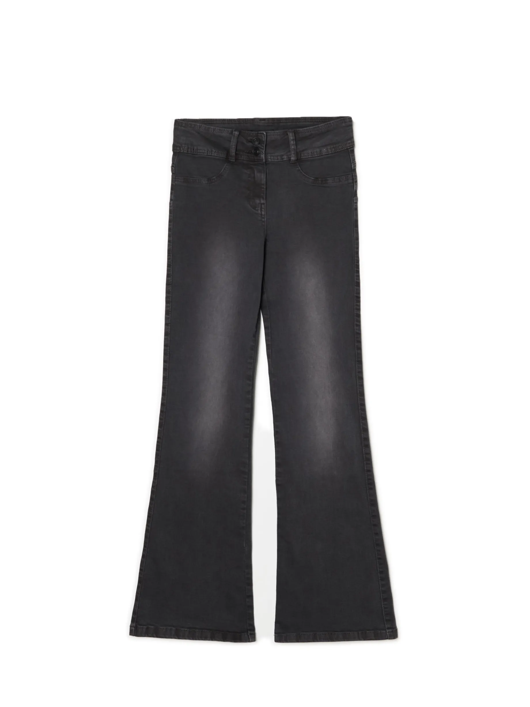 Damskie spodnie uszyte z trwałej i elastycznej tkaniny. Ciekawe zapięcie na 2 guziki i ozdobny efekt sprania na nogawkach wyróżniają ten model. bawełna z dodatkiem elastycznych włókien spodnie o kroju flare regularny stan zapięcie na dwa guziki i zamek długie nogawki rozszerzane u dołu imitacja kieszeni z przodu naszywane kieszenie z tyłu ozdobne zakładki z tyłu lekki efekt sprania na udach szerokie szlufki na pasek Wzrost modelki: 177 cm