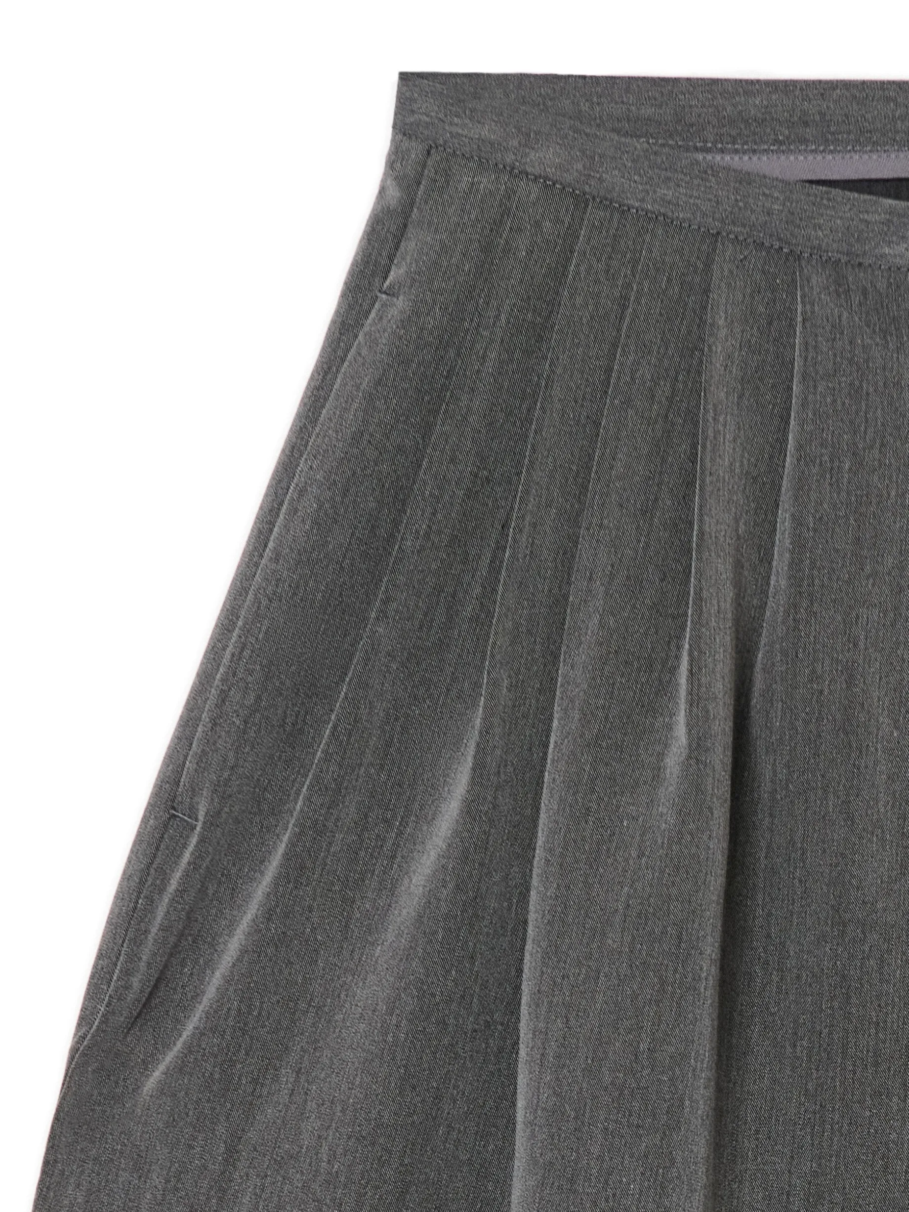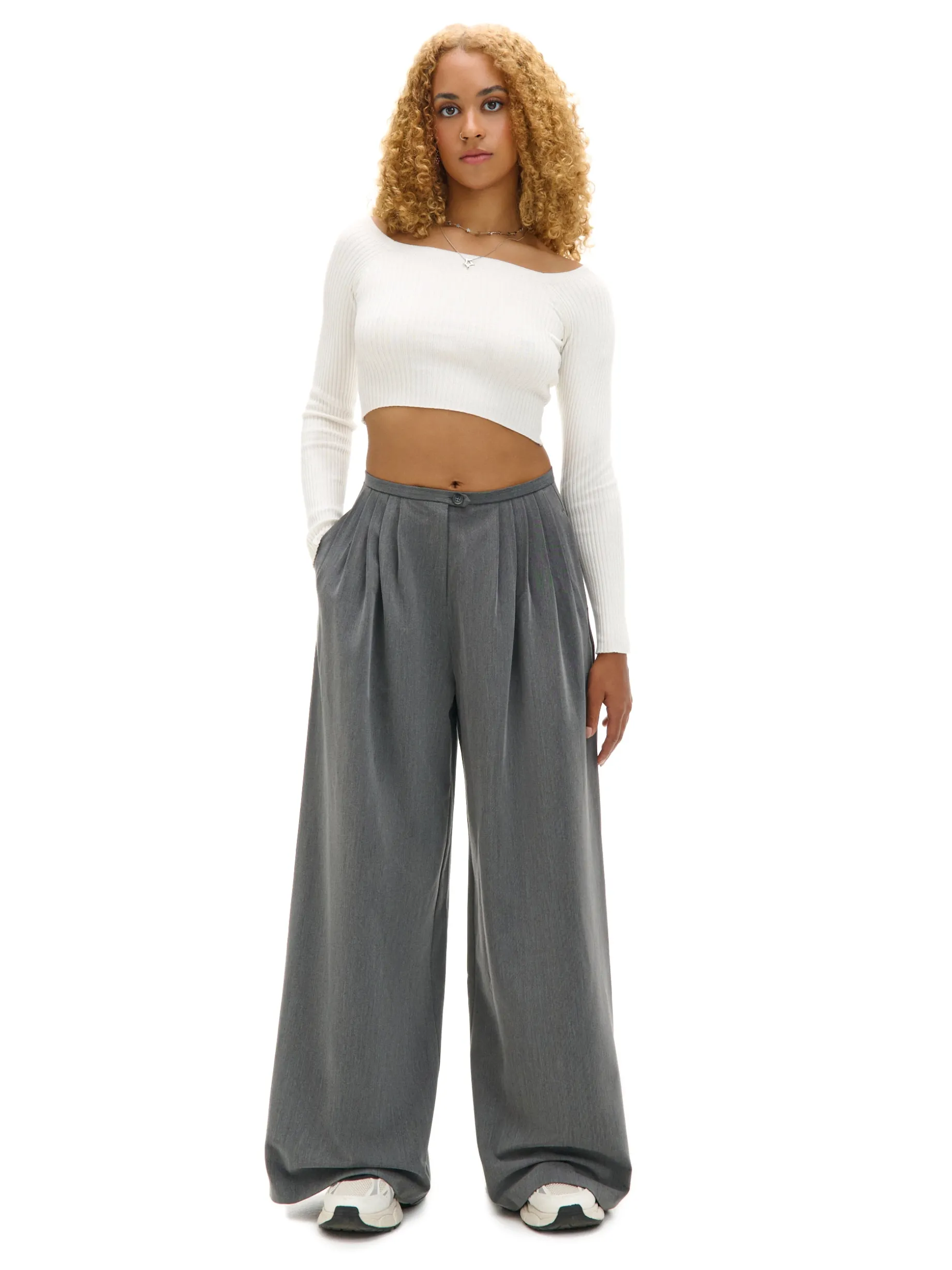 Spodnie damskie z szerokimi nogawkami, uszyte z mocnej tkaniny typu twill z dodatkiem wiskozy i elastycznych włókien. FItuje zarówno z białą koszulą, jak i bardziej casualowymi stylizacjami. spodnie o fasonie tailoring zapięcie na suwak i guzik wewnątrz dodatkowy, ukryty guzik dwie kieszenie po bokach ozdobne marszczenia z przodu zakładki modelujące z tyłu