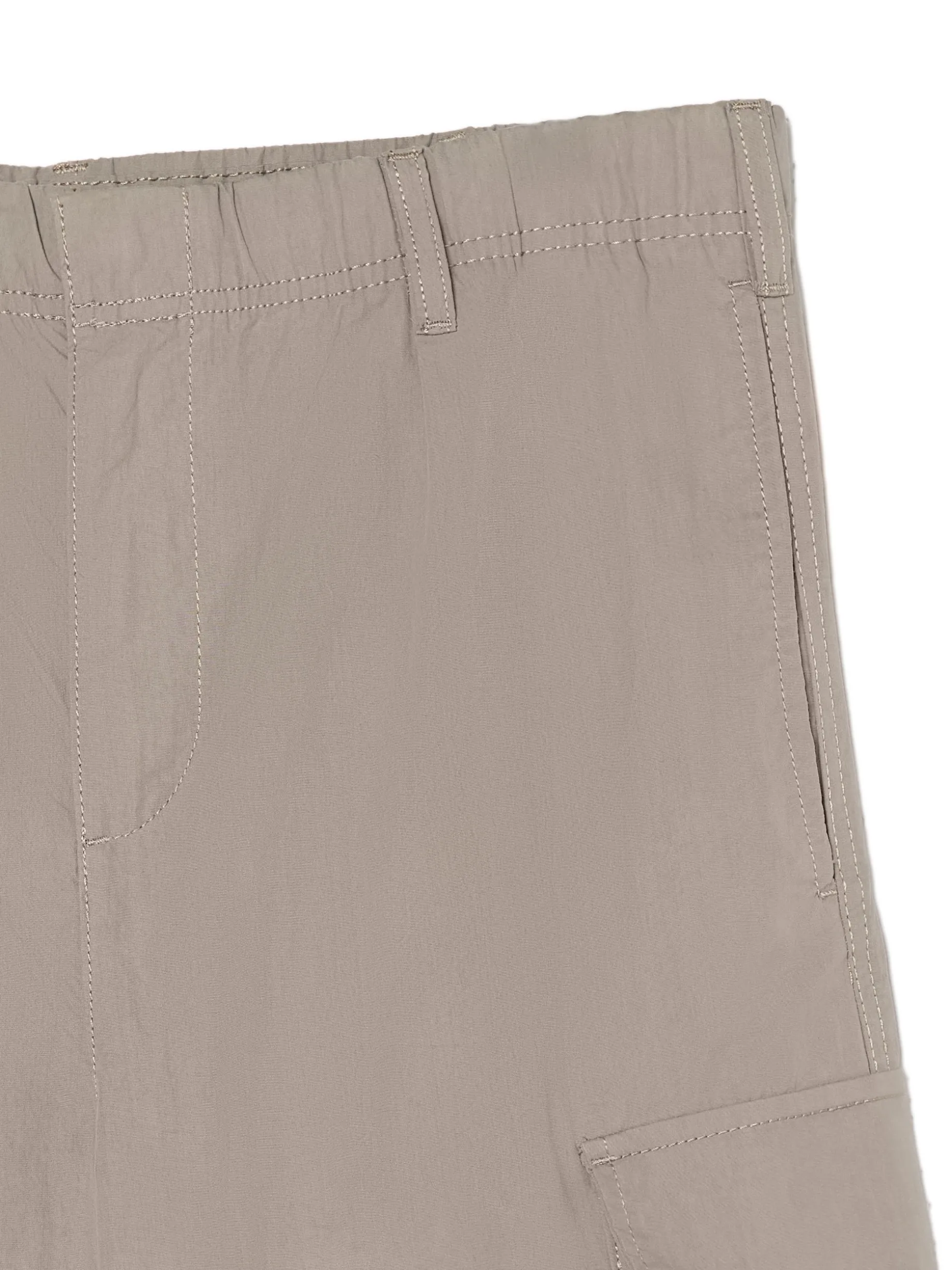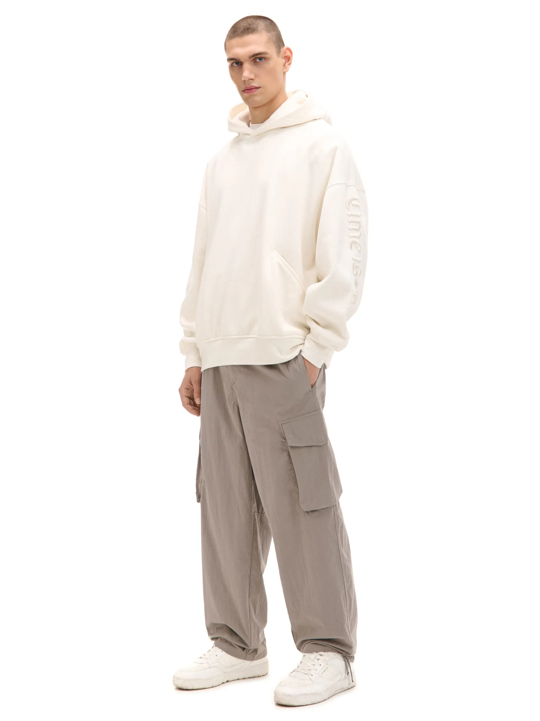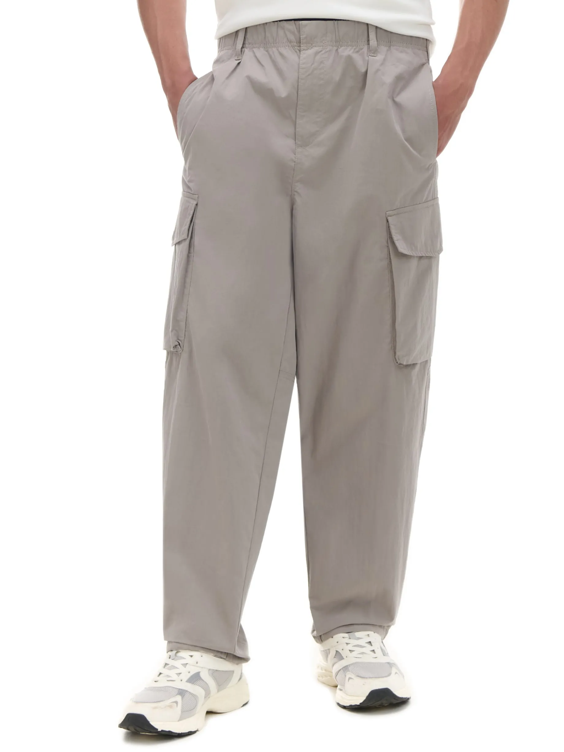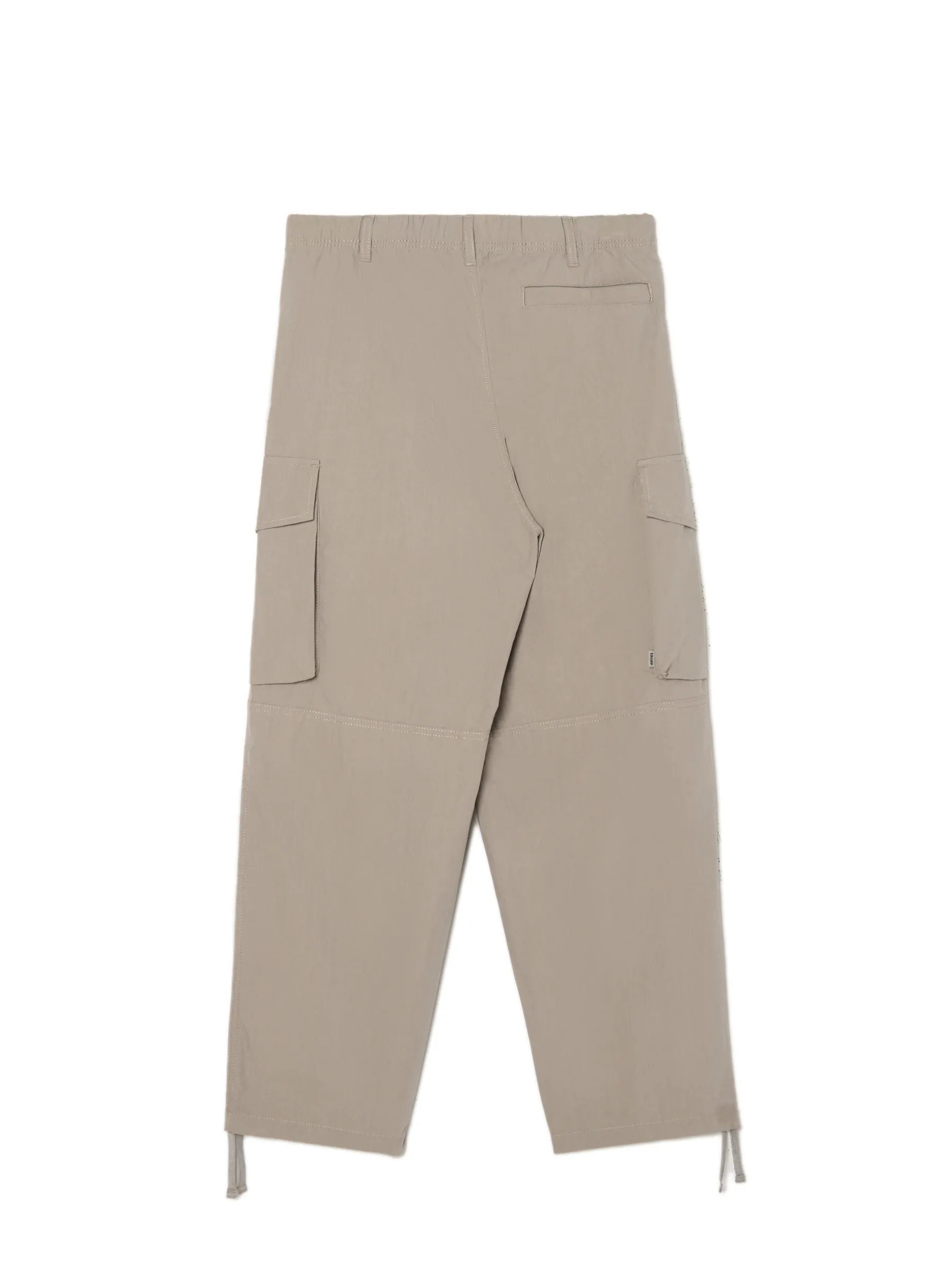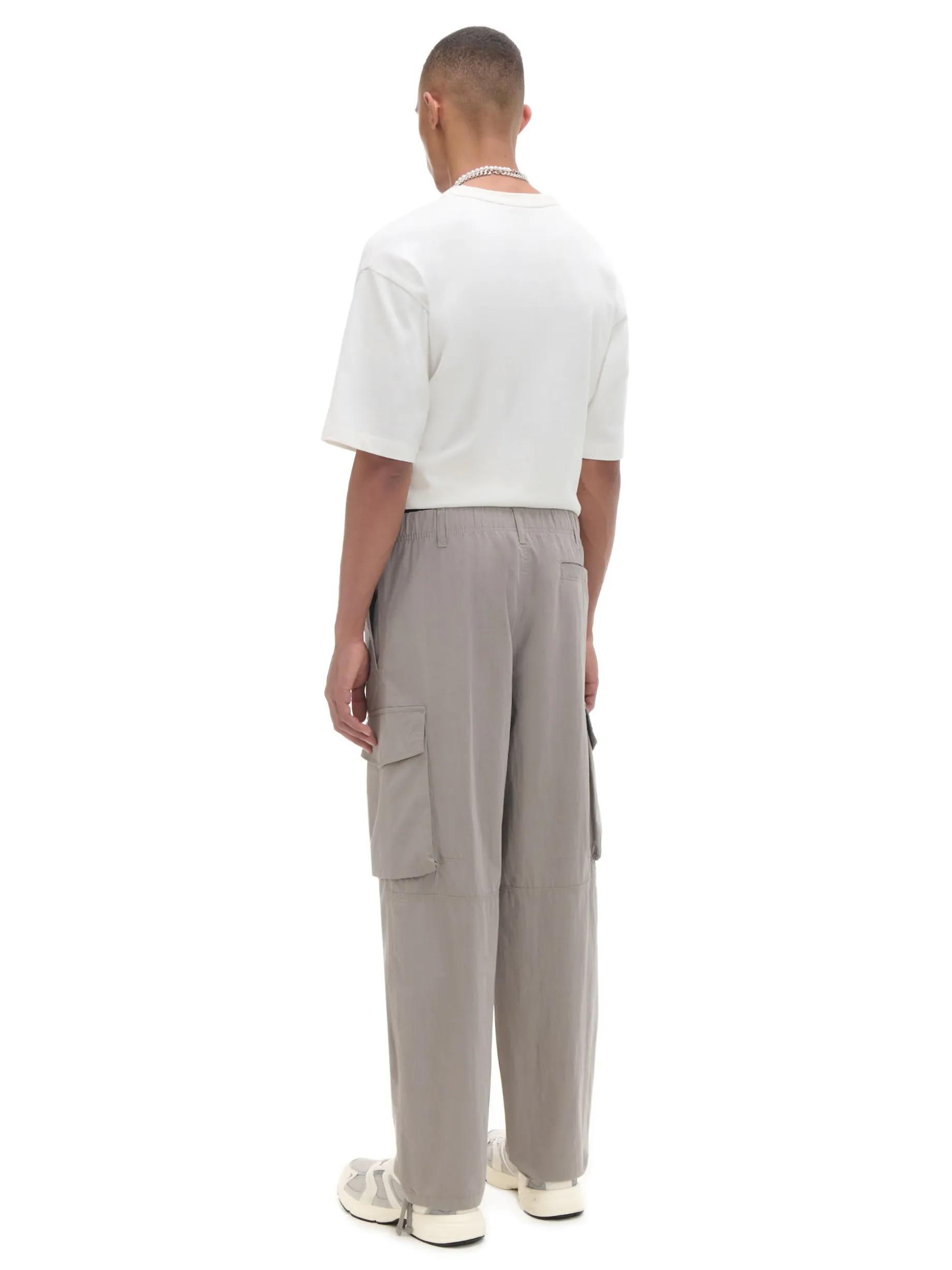 Spodnie męskie uszyte z mieszanki tkanin w jasnoszarym kolorze. Ten model zawiera praktyczne zapięcie na suwak i zatrzask, pojemne kieszenie i wygodną regulację przy nogawkach. wygodny krój comfort zapięcie na metalowy zamek i zatrzask w pasie od wewnątrz wszyta gumka długie, swobodne nogawki wykończone ściągaczem dwie kieszenie z przodu naszywana kieszeń z tyłu dodatkowe kieszenie cargo na nogawkach szlufki na pasek Wzrost modela: 185 cm