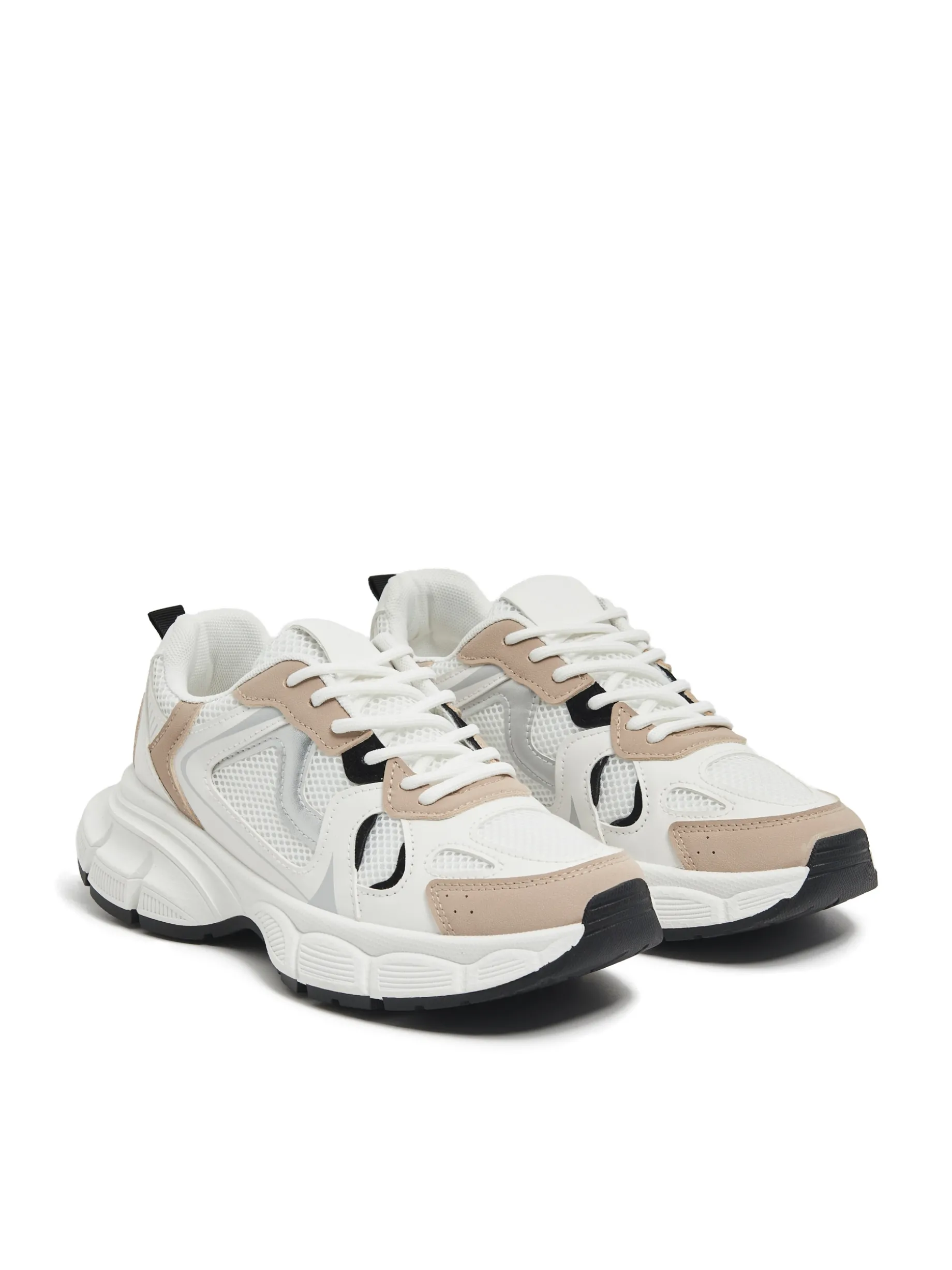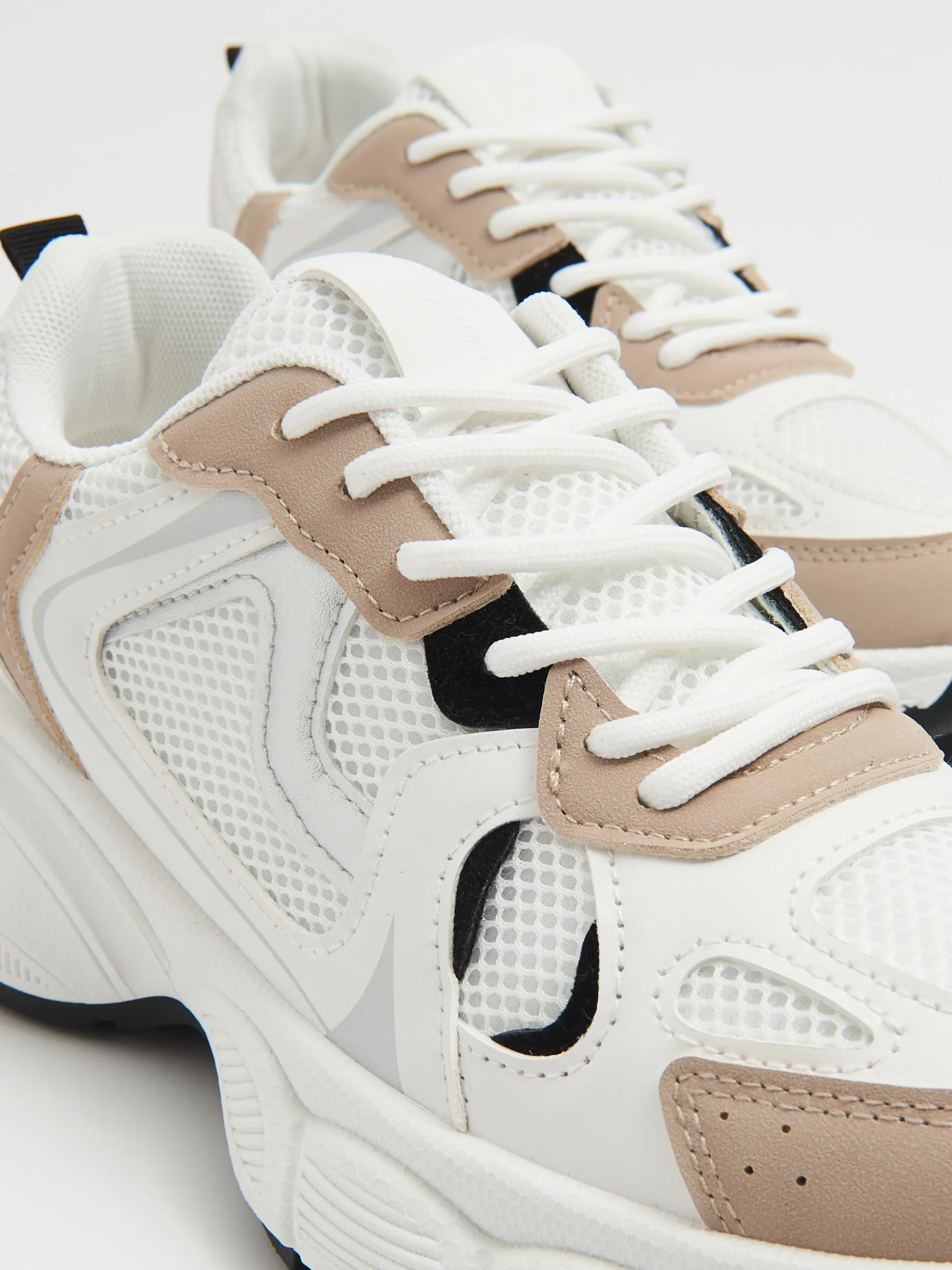 Damskie sportowe buty, wykonane m. in. z tworzywa PVC i imitacji skóry. Odpowiednie na sezon przejściowy. solidna podeszwa wiązanie na białe sznurówki wstawki z siateczki mesh ozdobne beżowe i czarne wstawki na języku wytłoczony napis