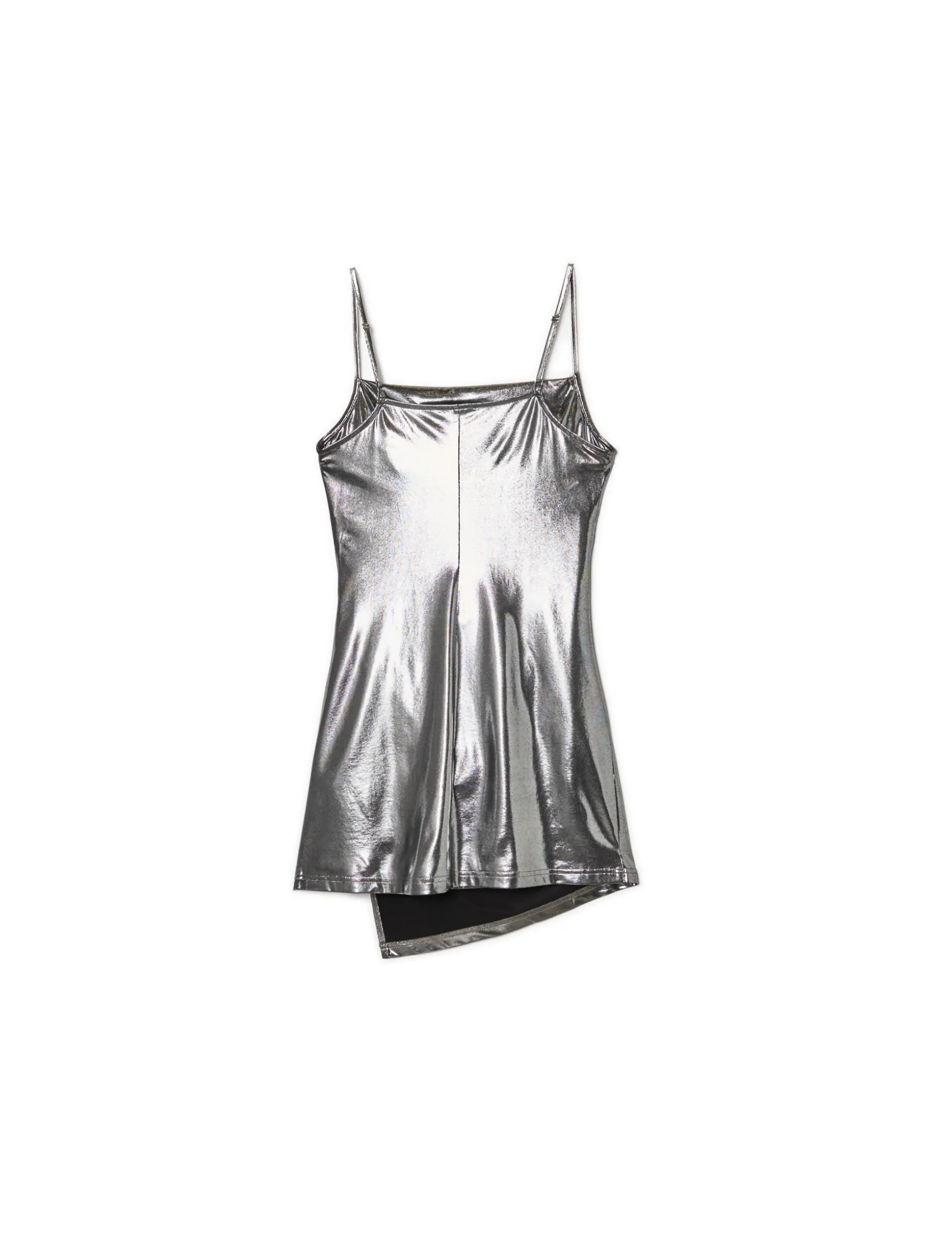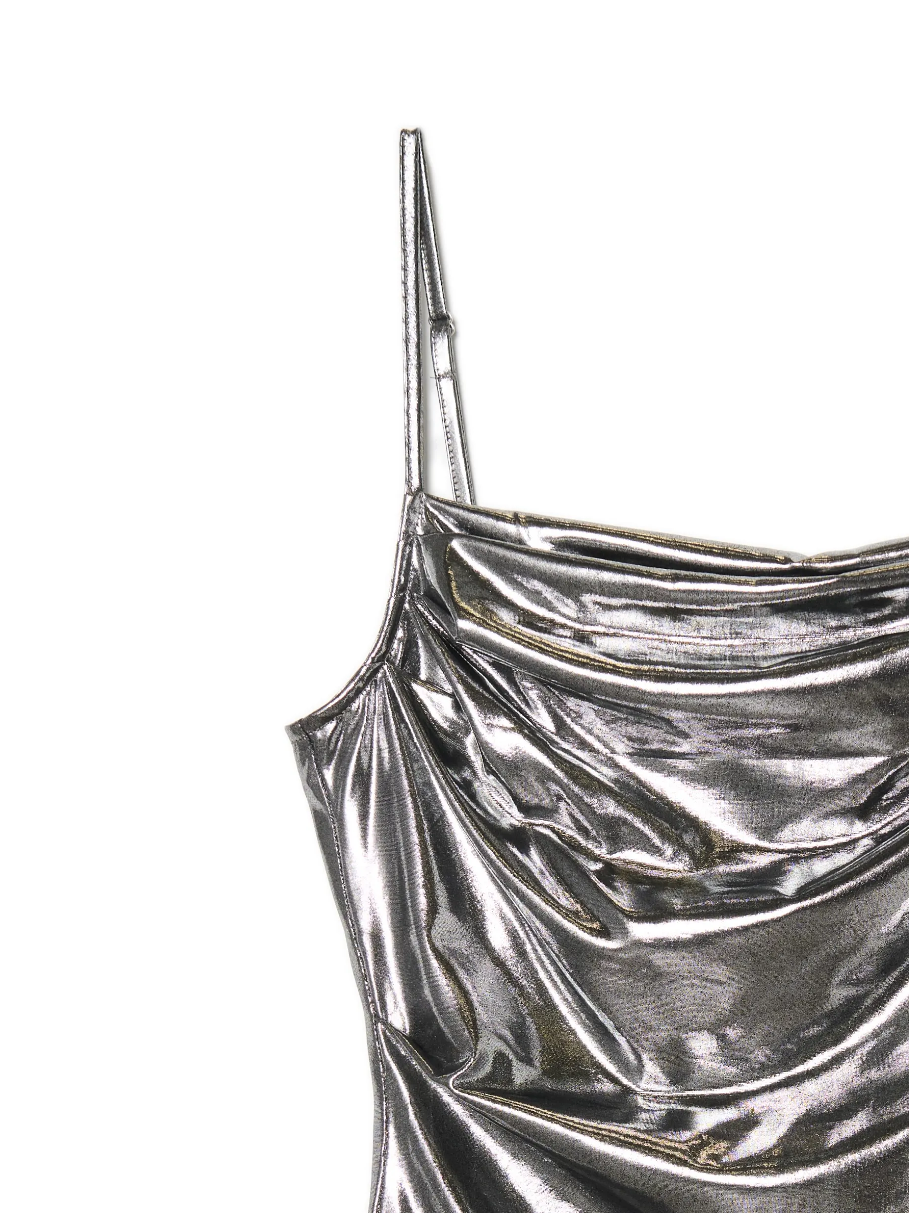 Damska sukienka mini na specjalne okazje! Uszyta z mieszanki dzianin w kolorze srebrnym. Wyposażona w wąskie, regulowane ramiączka, dekoracyjne marszczenia i zawijany dół. Sztosowy item na sylwestra lub spontany z ekipą. dzianina z domieszką elastycznych włókien dopasowany krój podkreślający sylwetkę długość mini dekolt w szpic wąskie ramiączka z regulacją długości ozdobne marszczenia dekoracyjna zakładka z przodu