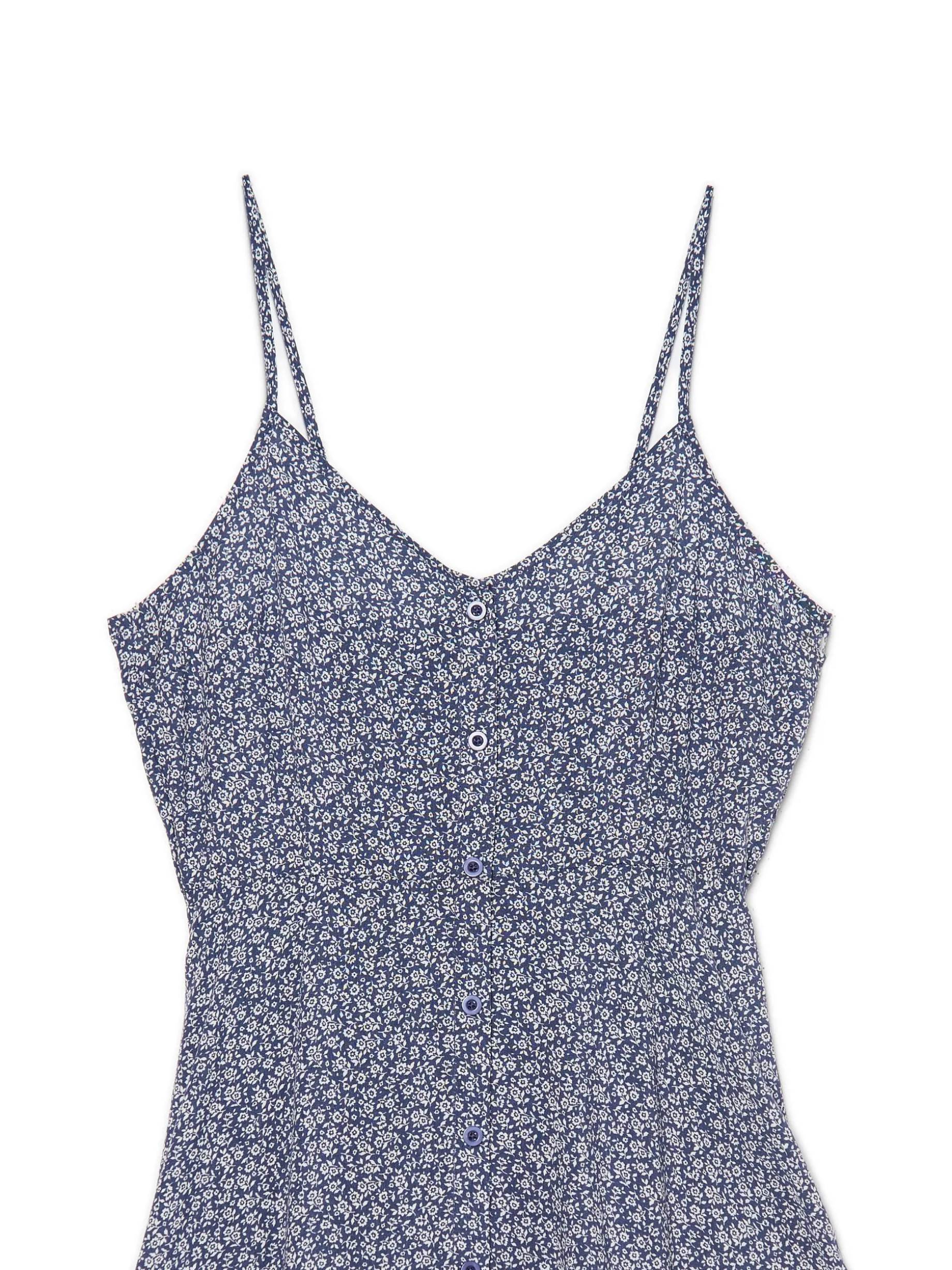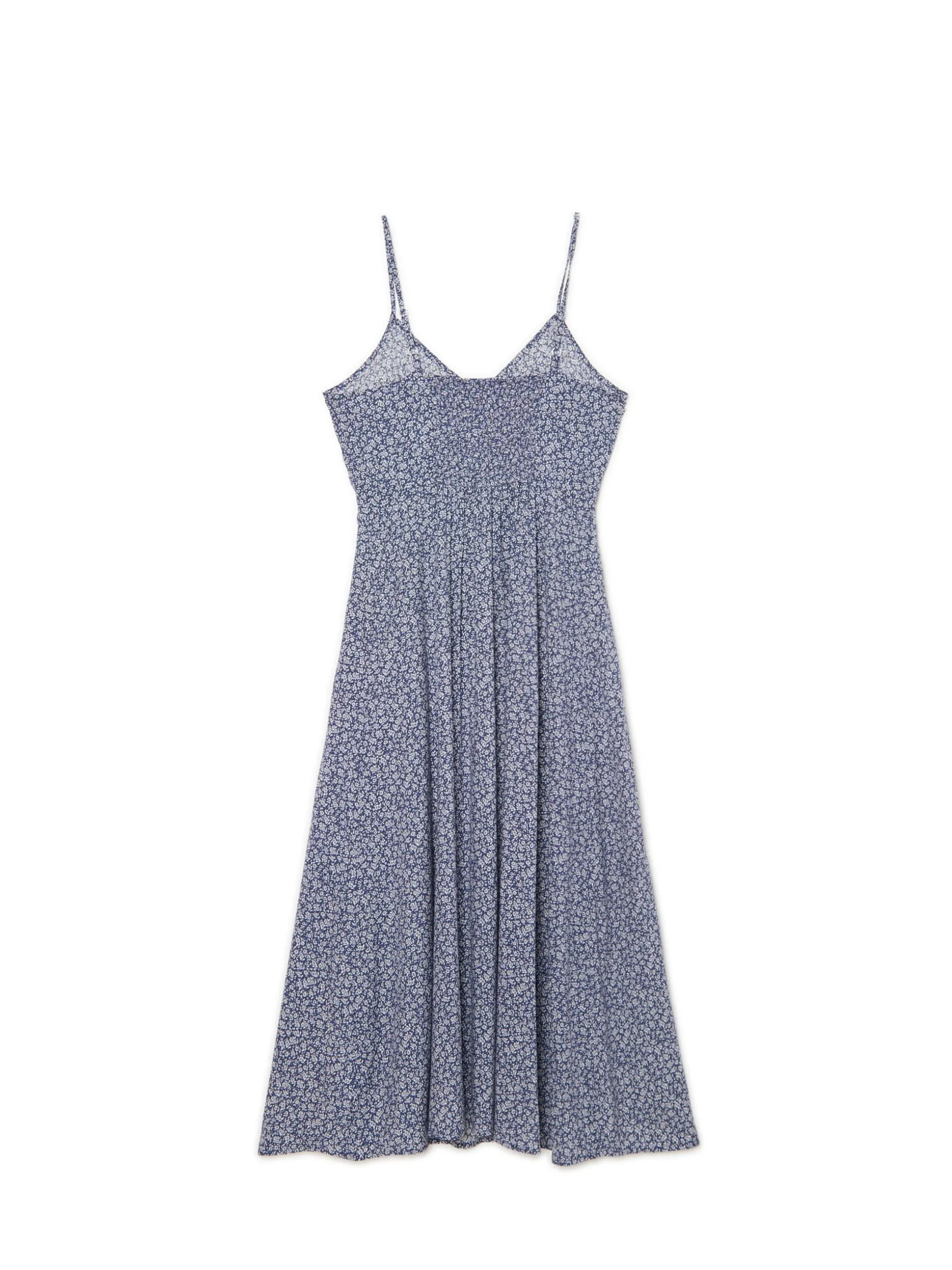Delikatna, zwiewna sukienka o długości midi zapinana na guziki. Cienkie ramiączka i elastyczny fragment na plecach są idealnym rozwiązaniem na ciepłe dni! 100% wiskozy lekko rozkloszowany dół szeroka gumka w talii odcięcie w talii jednorzędowe zapięcie na guziki wąskie ramiączka z regulacją długości autorski, kwiatowy print na całości