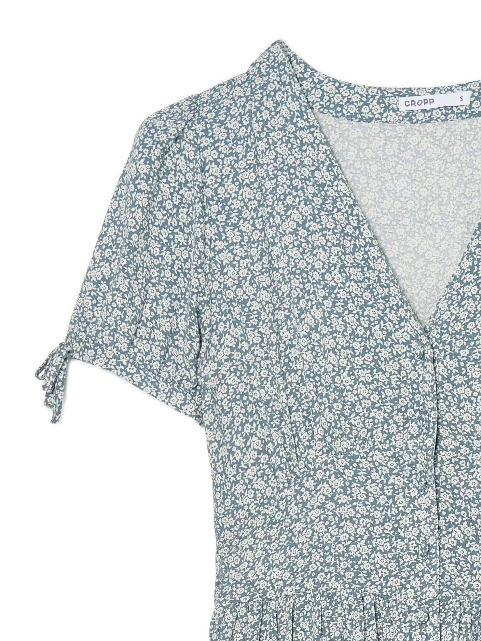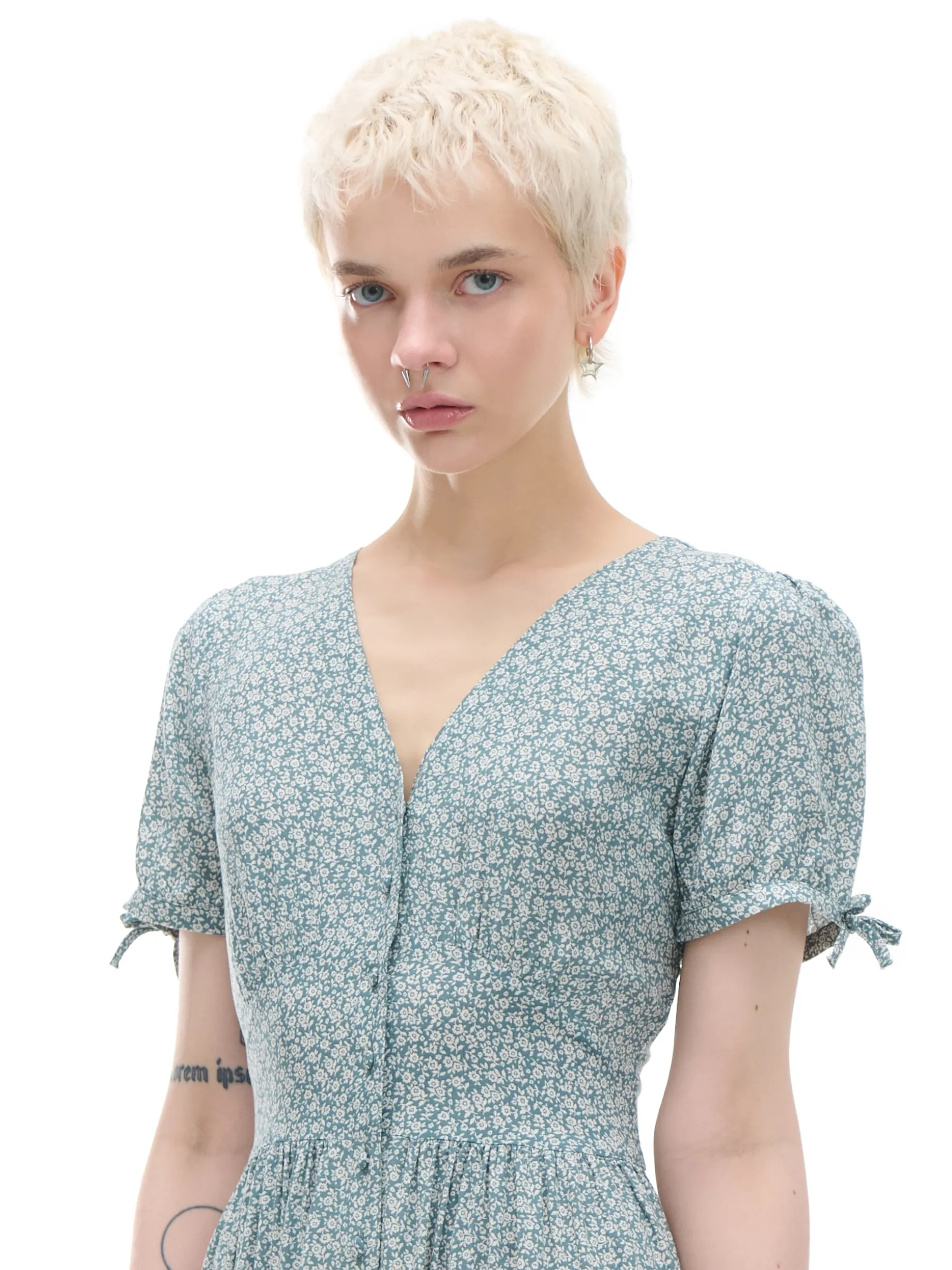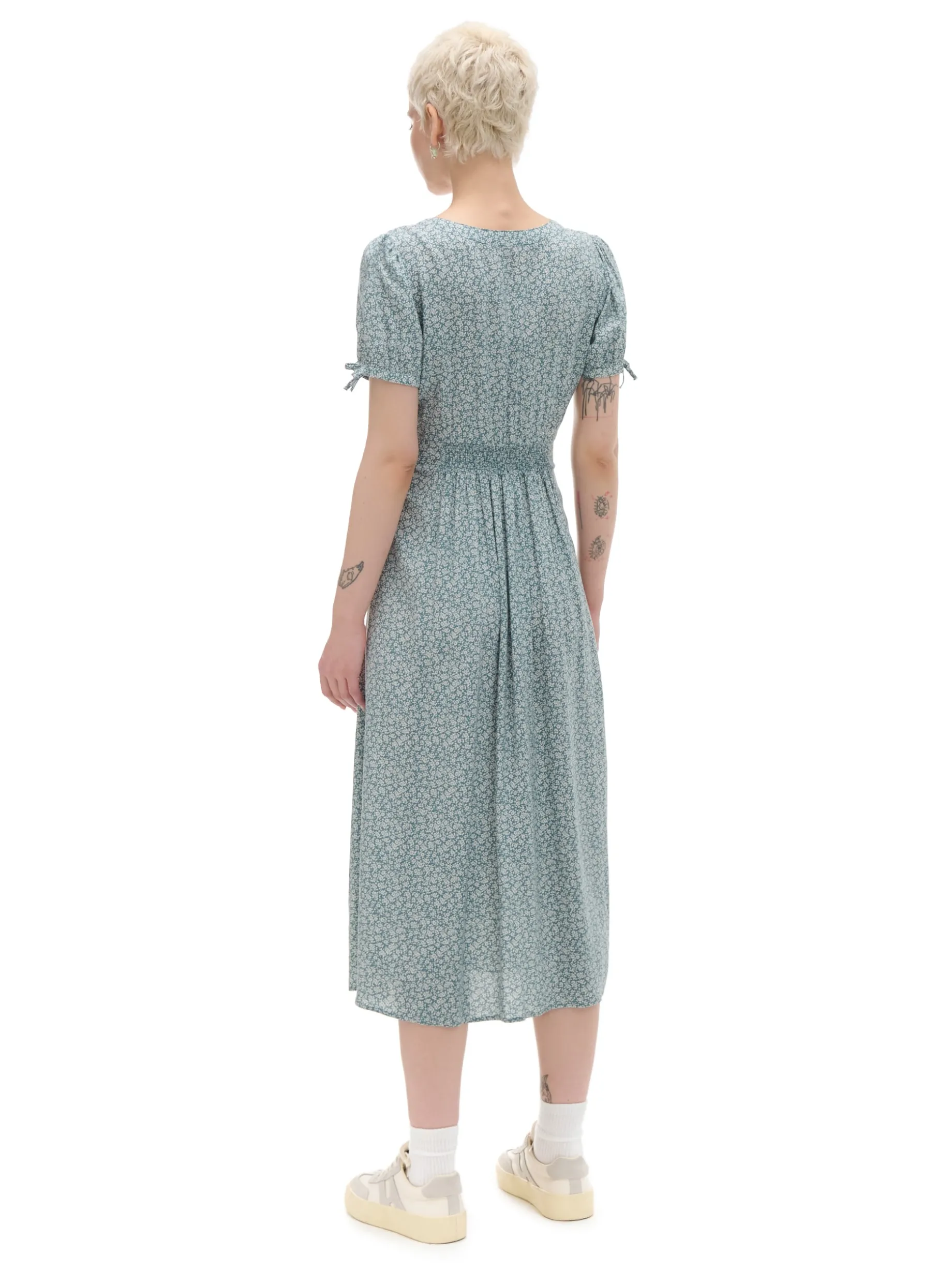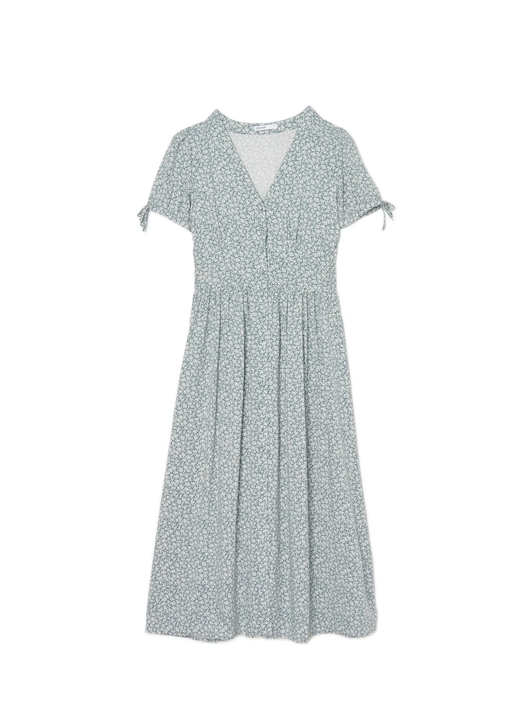 Sukienka damska o długości midi, uszyta z wiskozowej tkaniny. dekolt w kształcie litery V krótkie rękawy z ozdobnym wykończeniem zapięcie na guziki elastyczna gumka w pasie wzór w kwiaty na całości dostępne inne warianty kolorystyczne