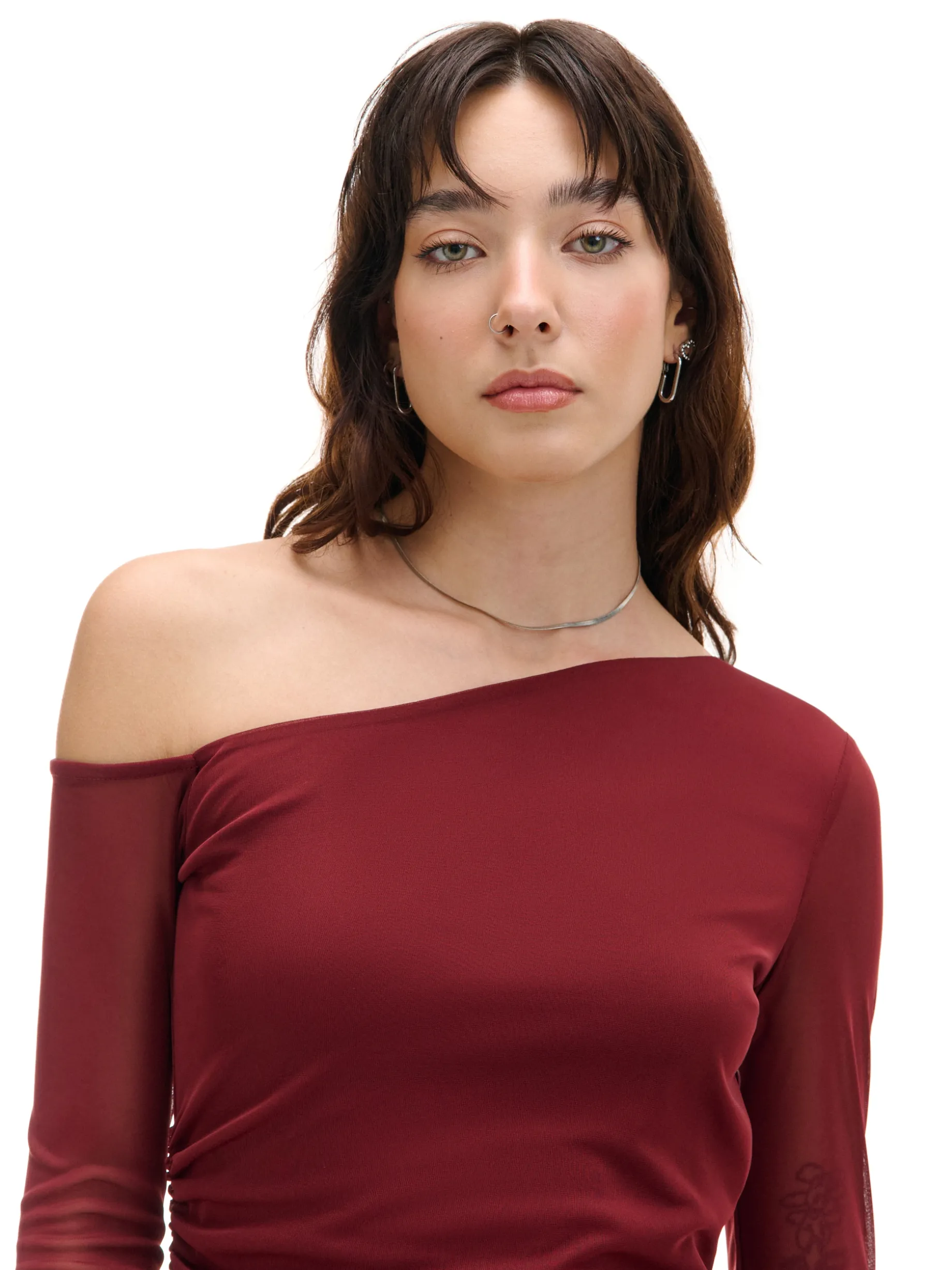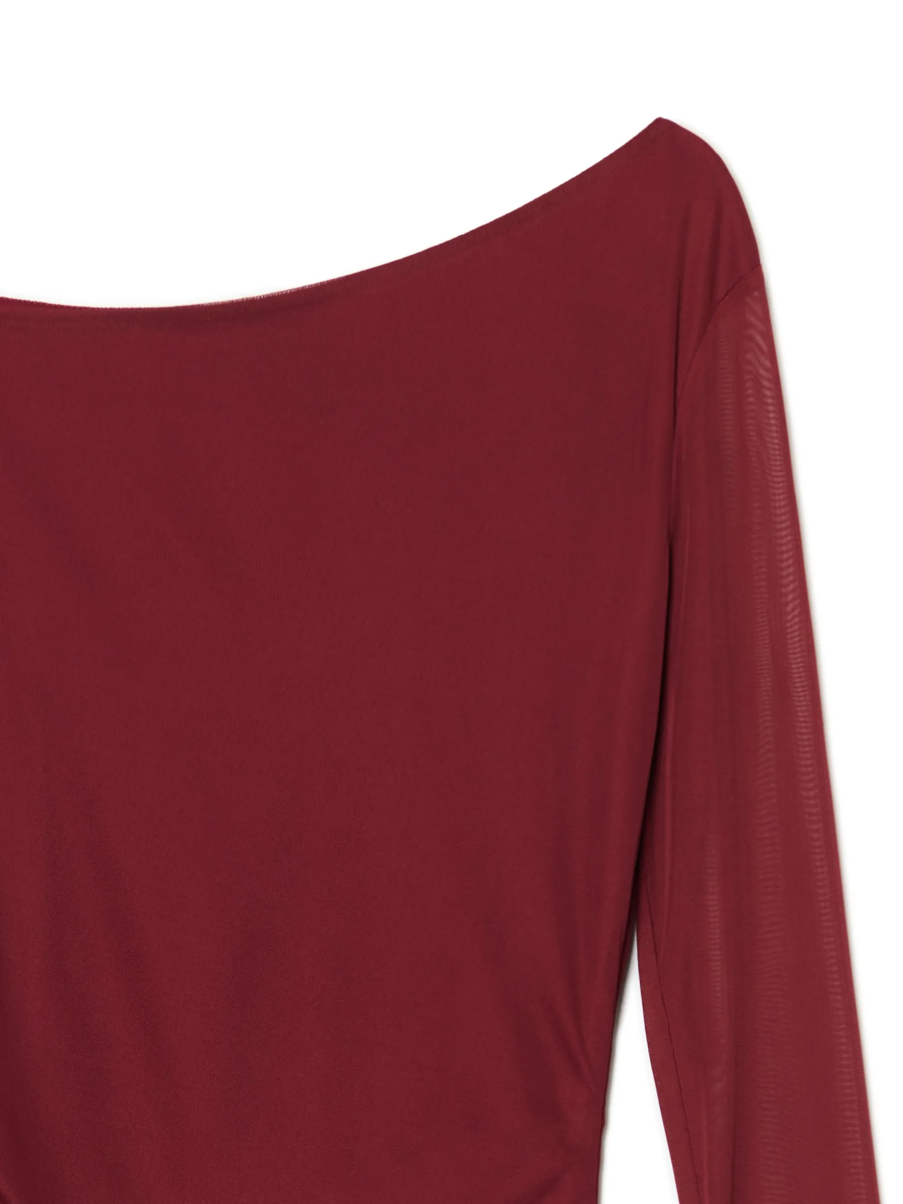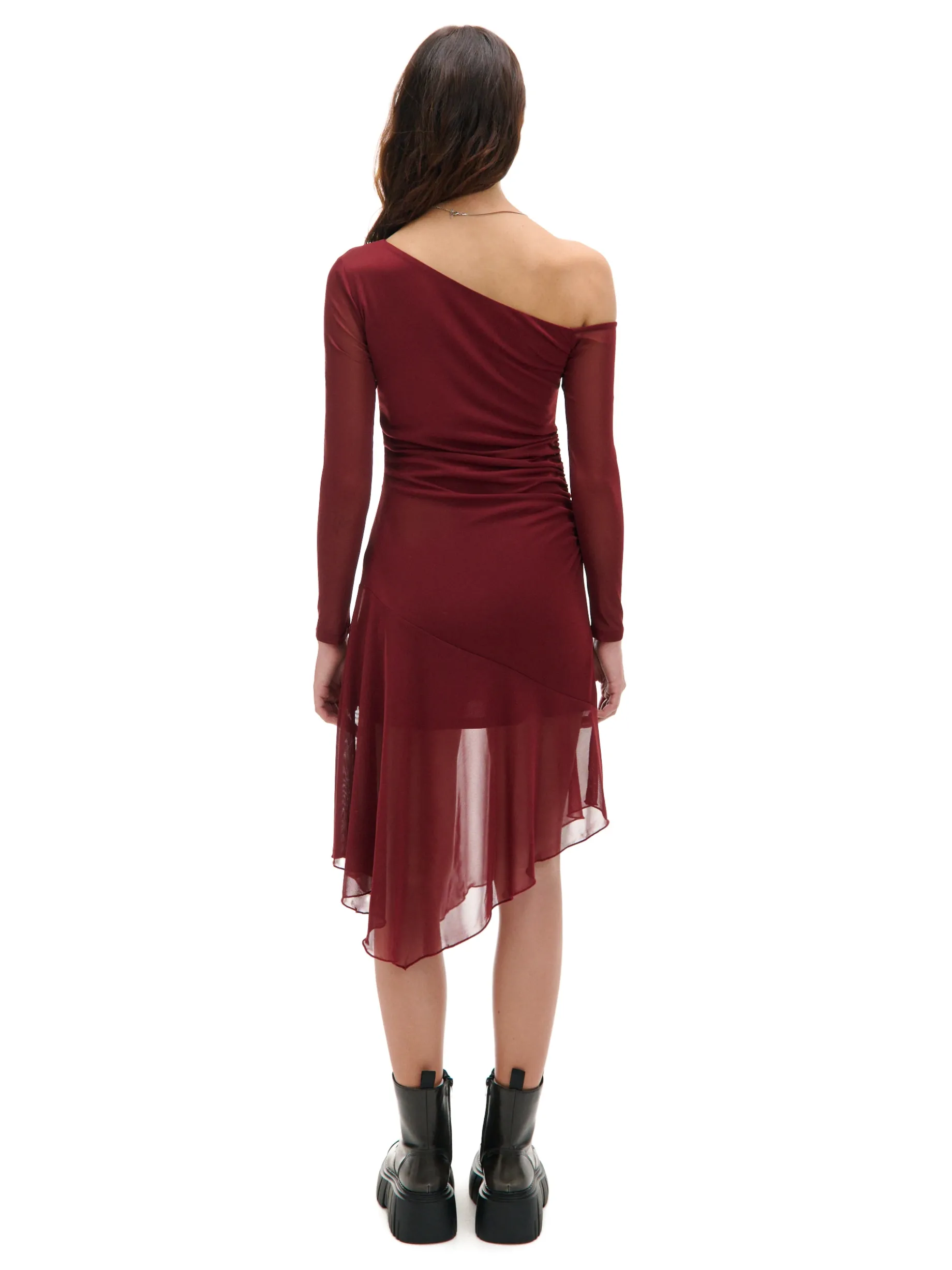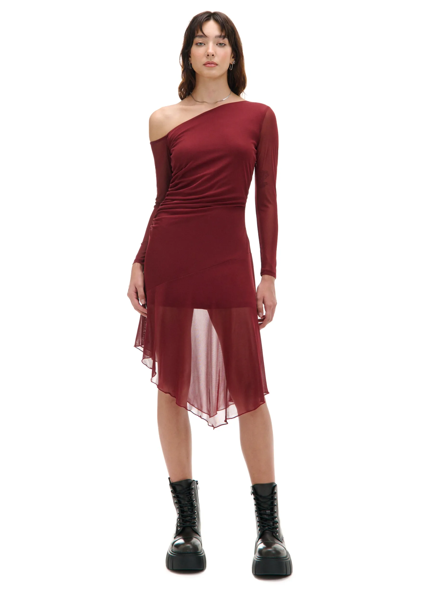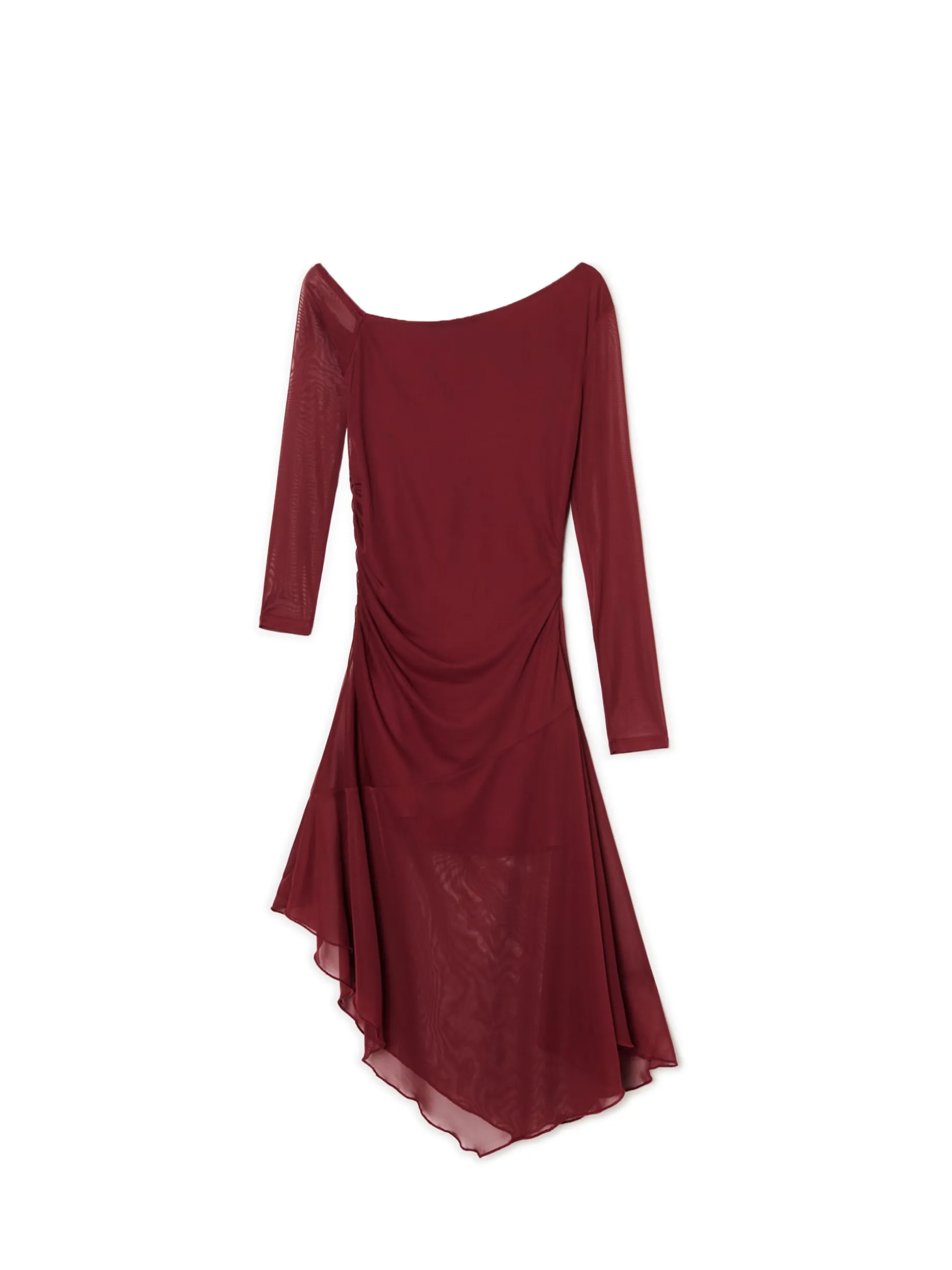 Sukienka damska o długości midi i wyróżniającą się krótszą podszewką. Uszyta z dzianiny z prześwitującej siateczki mesh o drobnych oczkach. Intensywny kolor i efektowne wykończenie zrobią wrażenie na niejednej osobie. uszyta z dzianiny typu mesh długość midi wewnątrz gładka podszewka zapięcie na kryty zamek z boku efektowne, odkryte ramię długie, dopasowane rękawy rozszerzany dół z dekoracyjnymi cięciami lekkie marszczenia po bokach dla idealnego dopasowania materiału wokół brzucha
