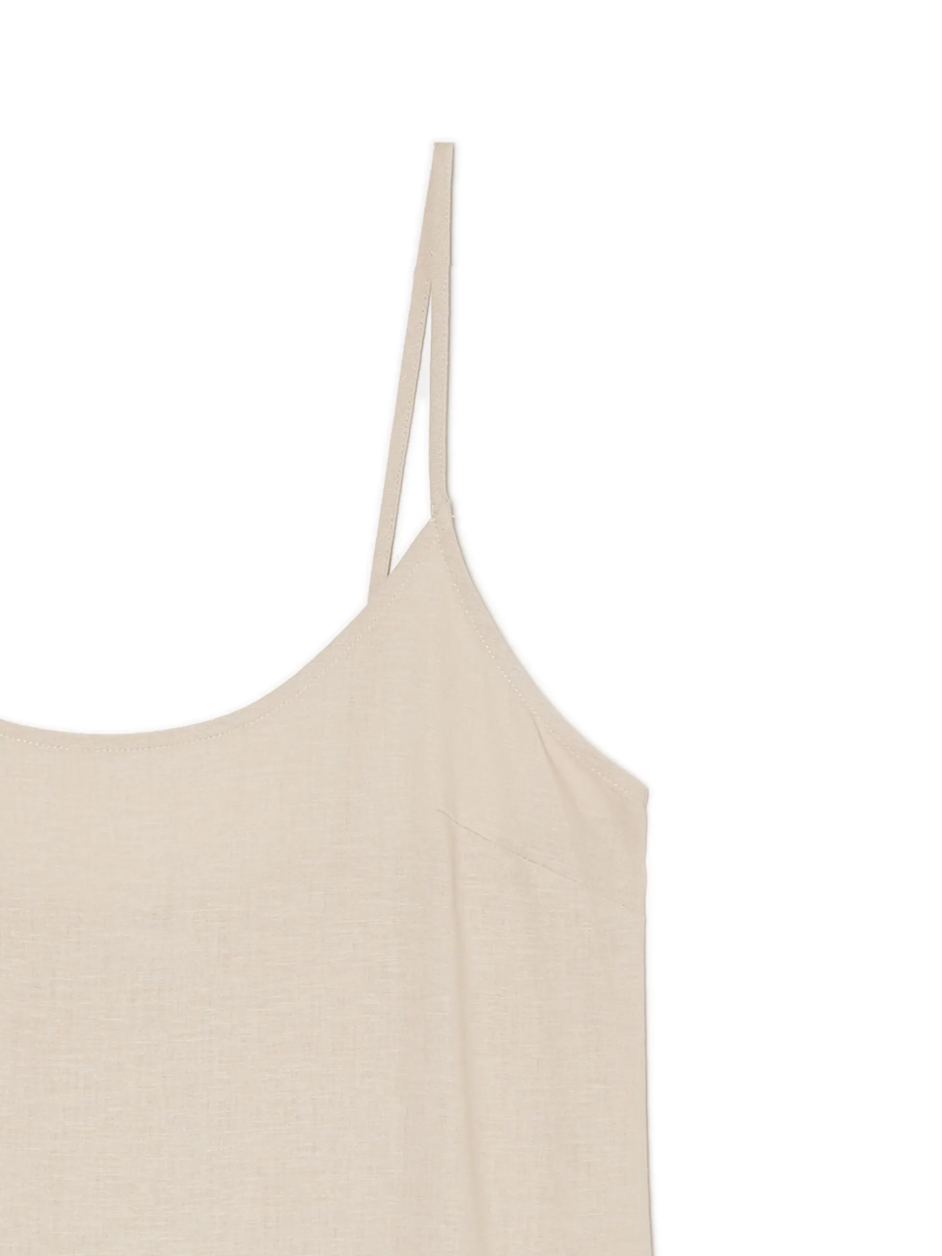 Zwiewna damska sukienka midi w kremowym odcieniu uszyta z mieszanki wiskozy i lnu. Regulowane cienkie ramiączka, rozcięcia po bokach i luźny krój stawiają ją na topce letnich stylizacji. lekki materiał z wiskozą długość midi swobodny, luźny krój wąskie ramiączka z regulacją długości delikatne rozcięcia po bokach Wzrost modelki: 176 cm